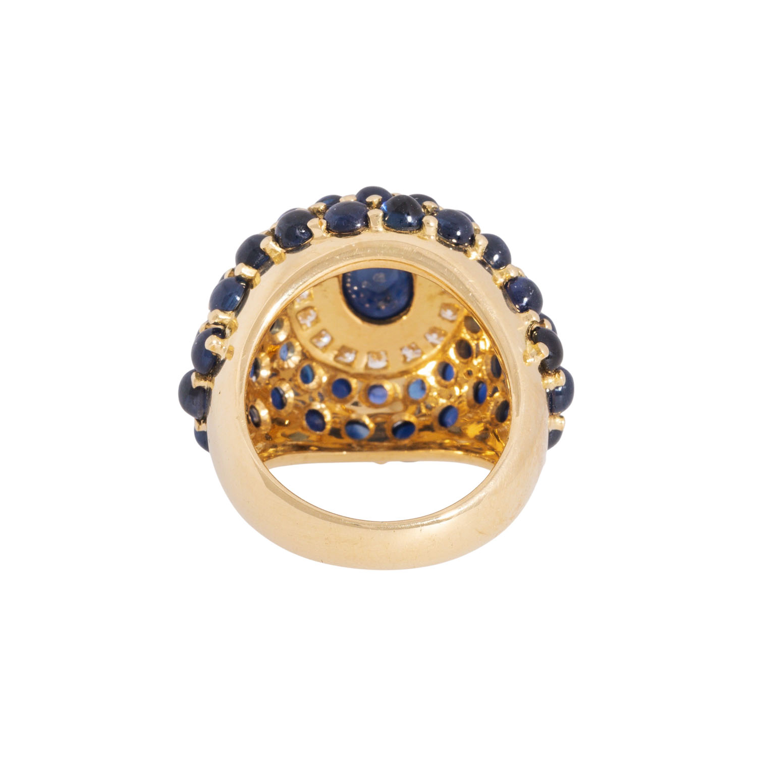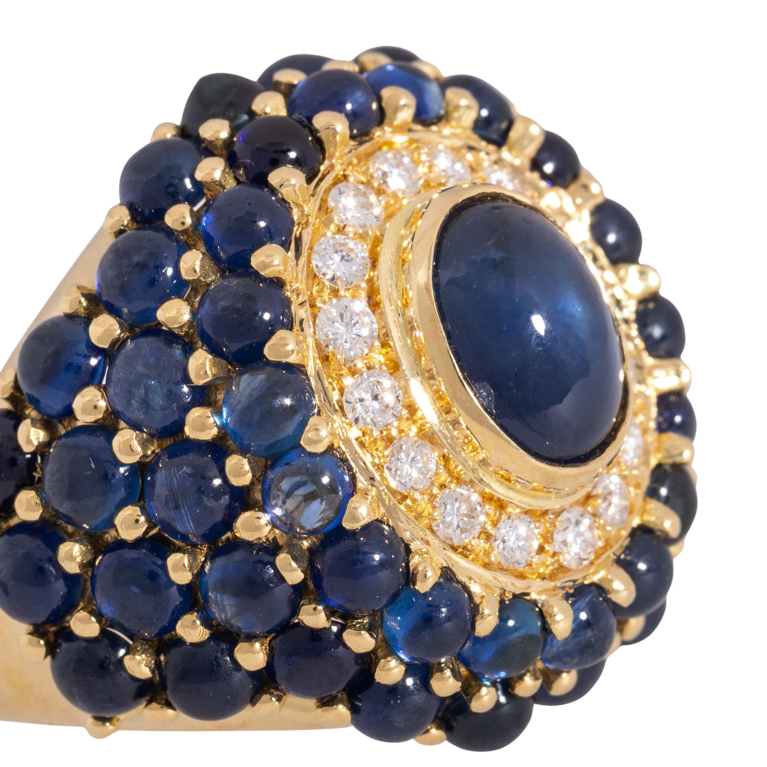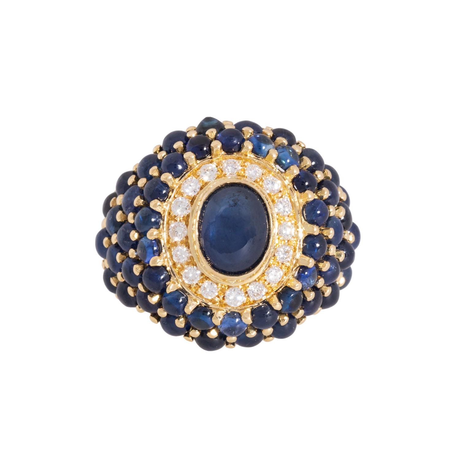 Ring with sapphires and brilliant-cut diamonds totalling ca. 0.40 ct, good to very good colour a. clarity, central sapphire cabochon ca. 9x7 mm, 18K YG, 19.6 gr, ring size 55, 2nd half 20th century, with maker's mark 'Chantecler'.