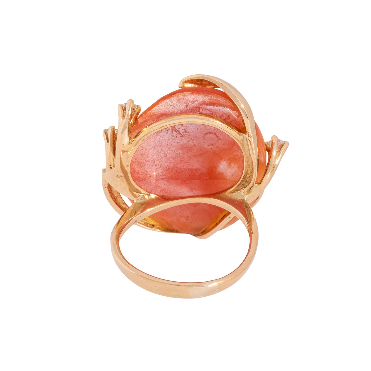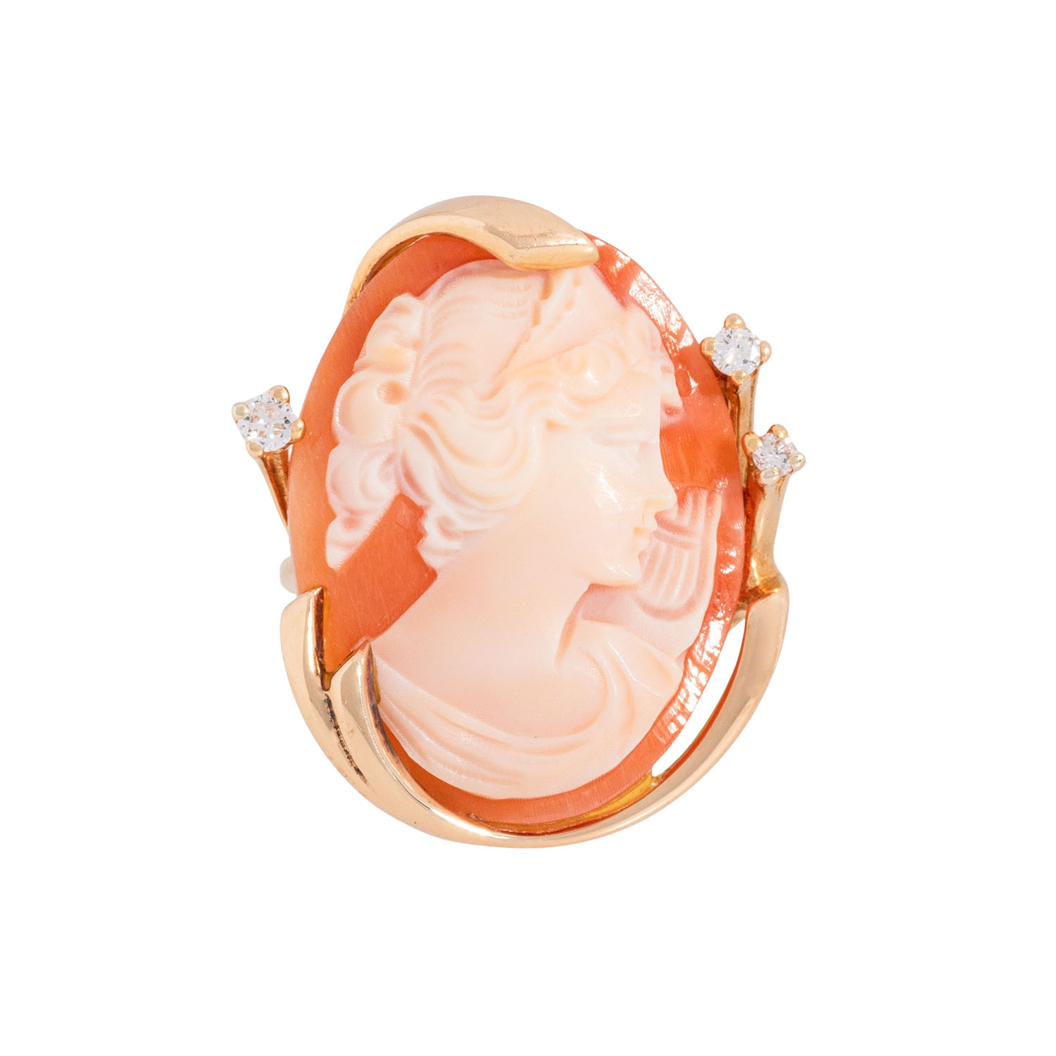 Ring with shell cameo, ca. 2,5 x 1,9 cm, 3 brilliant cut diamonds totall. ca. 0,12 ct, eng., good colour and clarity,18K yellow gold, 6.9 g, ring size 51, late 20th century, minorl signs of wear.