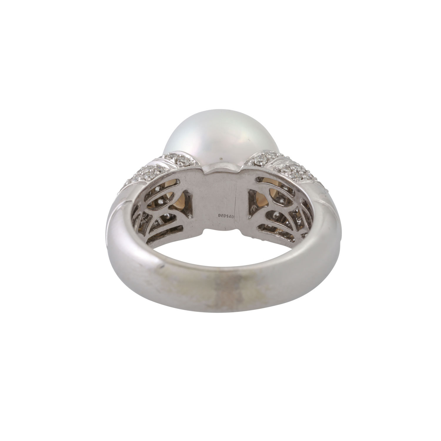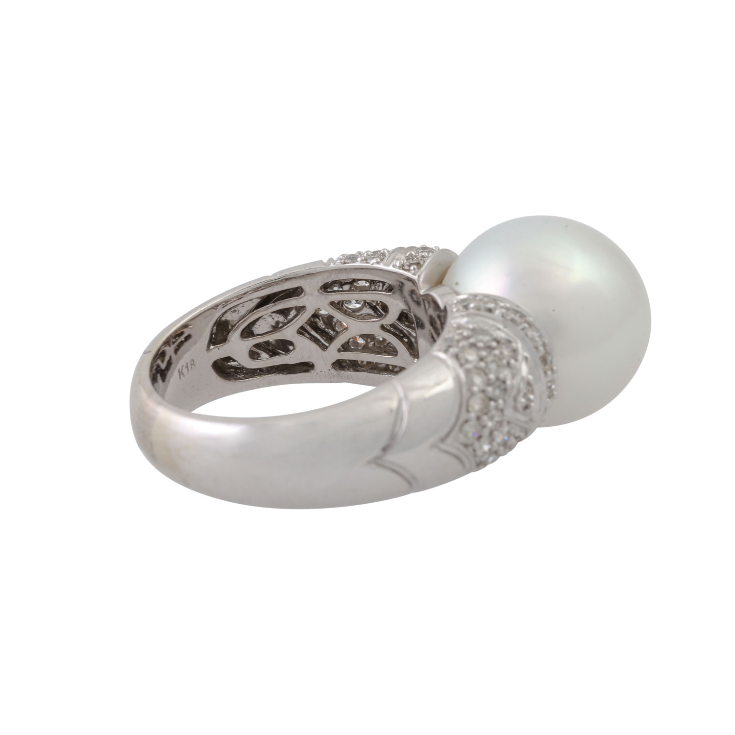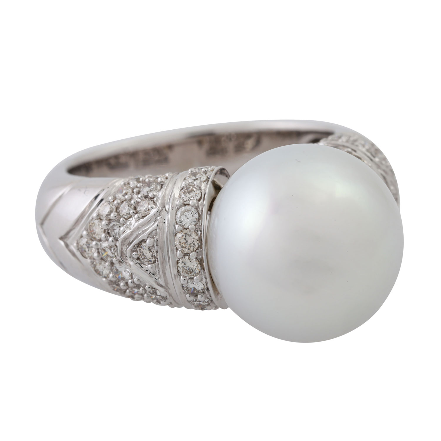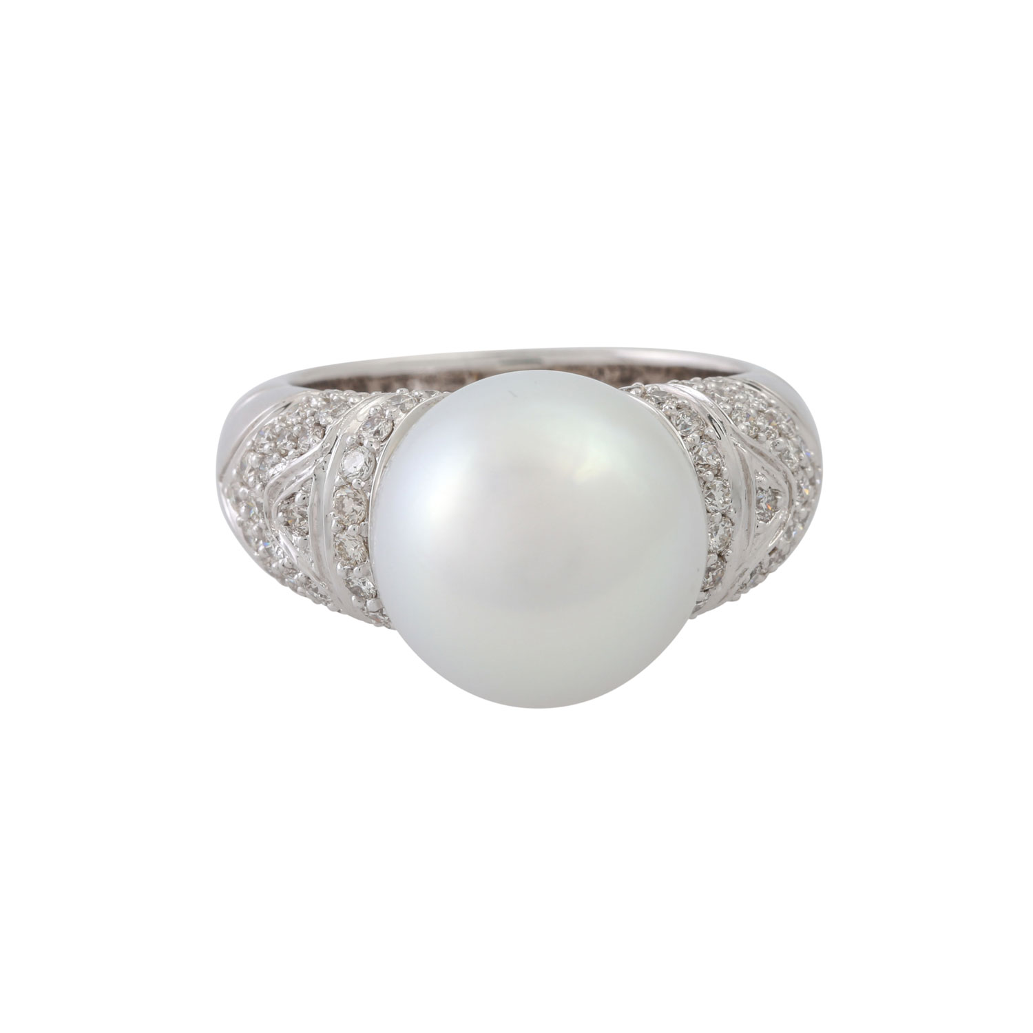 Ring with cultured South Sea Pearl ca. 13 mm, fine lustre, with 62 brilliant-cut diamonds totalling ca. 0,77 ct, good colour and clarity, 18K WG, 12.8 g, ring size: 56, 20th century, minimal signs of wear.
