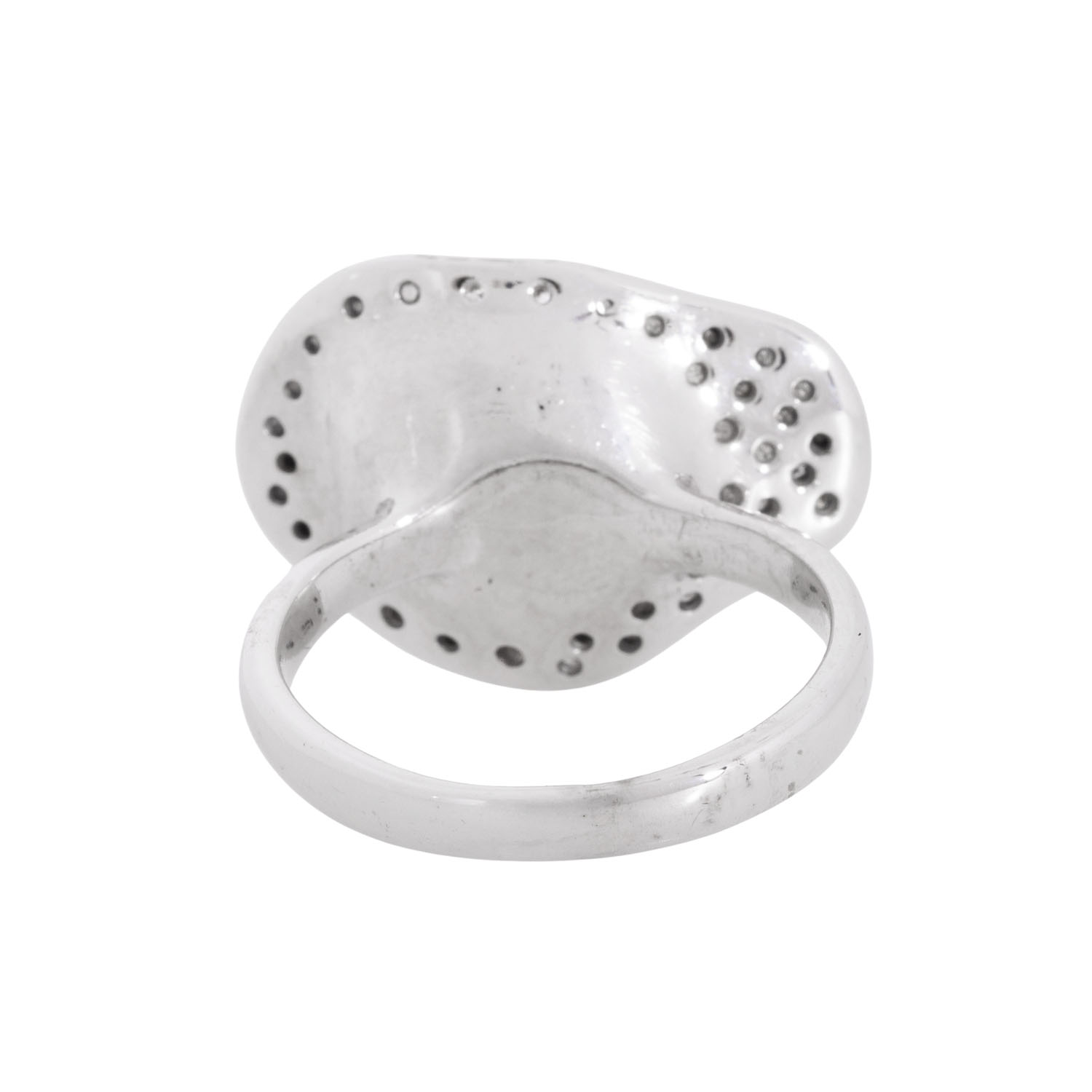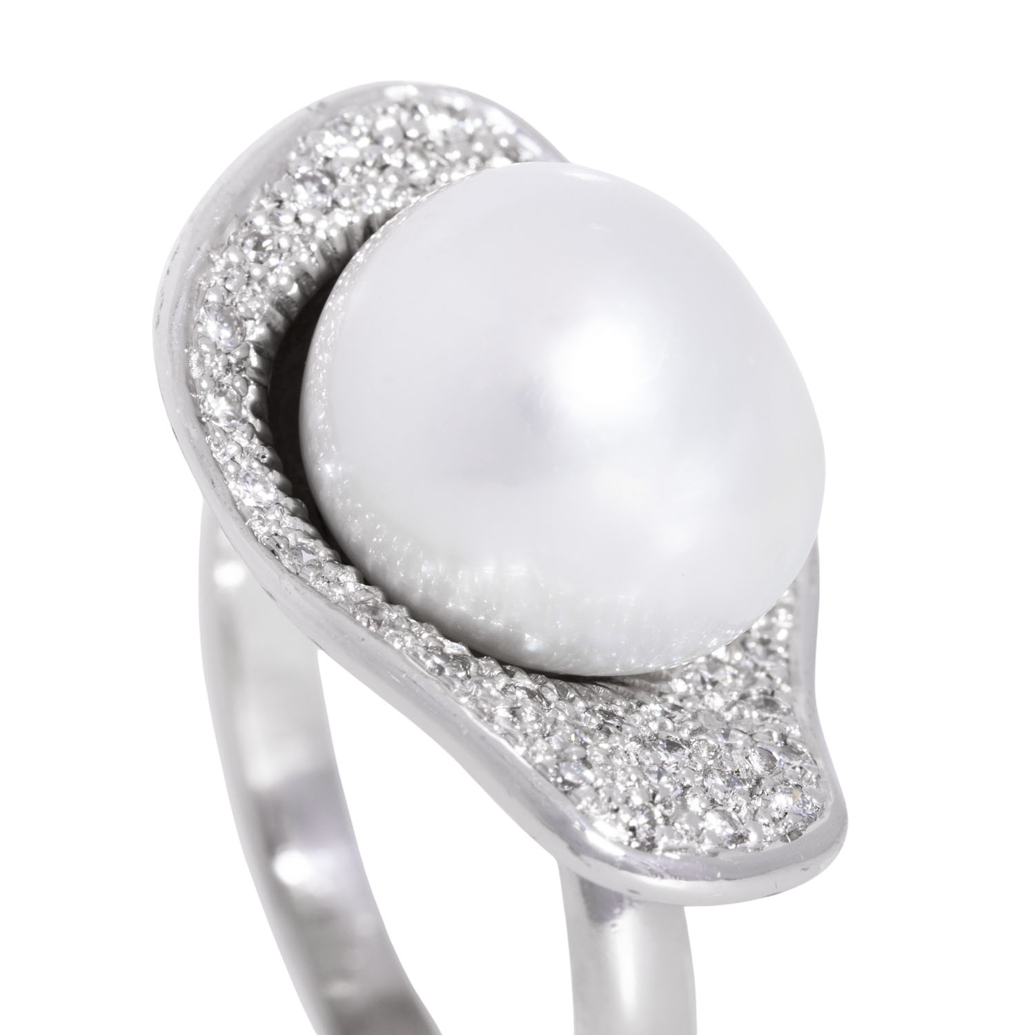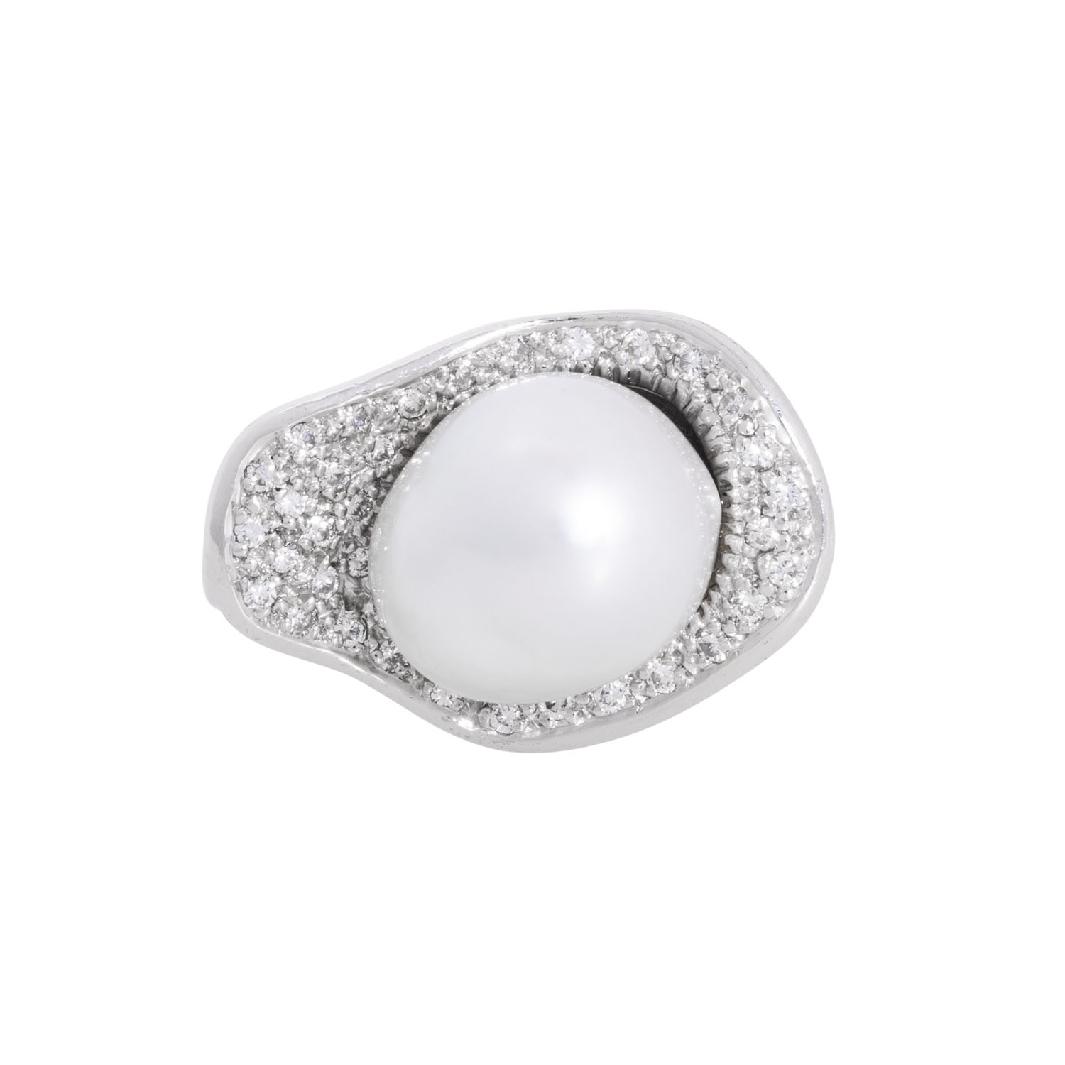 Ring with South Sea cultured pearl ca. 11x12 mm, slightly baroque and brilliant-cut diamonds totalling ca. 0.4 ct, good colour and clarity, 18K white gold, 11.4 g, ring size 56, 20th/21st century, minor signs of wear.