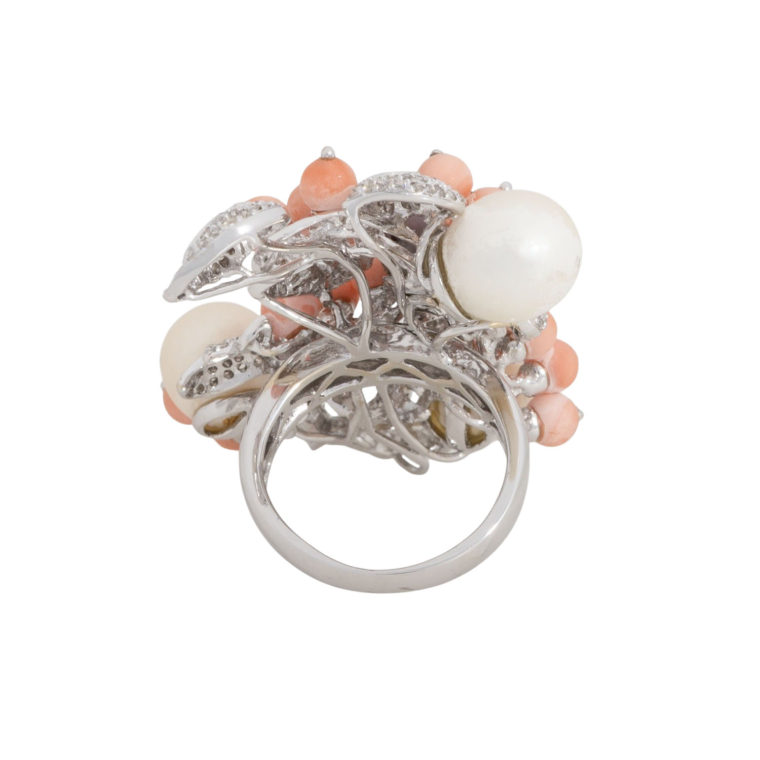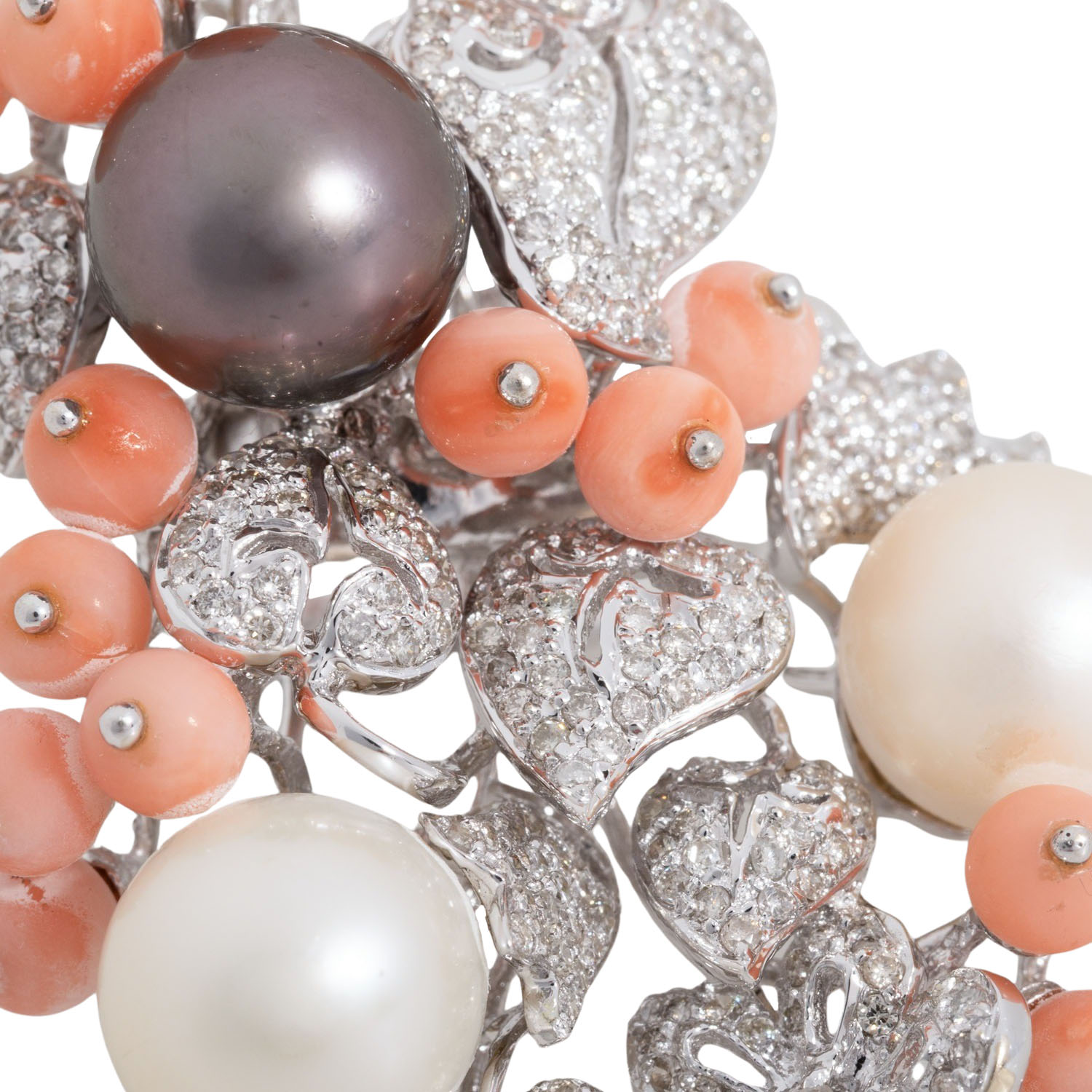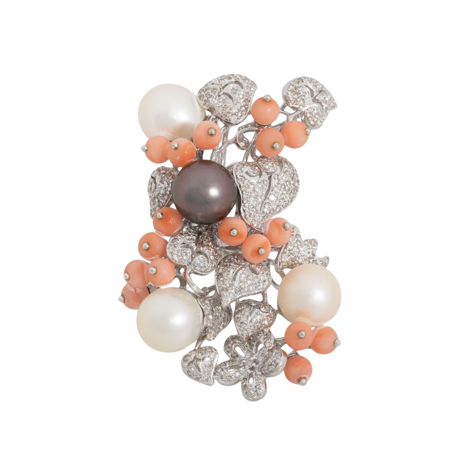 Ring with Tahitian pearl, 3 pearls, 17 coral beads and diamonds totalling 1.35 ct (engraved), STW-TW (I-M)/P, cultured pearls: grey-purple, 3 white-cream, D: approx. 9 - 9.2 mm, beautiful luster, with natural signs of growth, 1 white pearl chipped, coral balls D: apporx. 4 - 4,2 mm, 18K white gold, 23 g, ring size: ? , W: approx. 3.5 - 48.5 mm, 21st century, good condition.