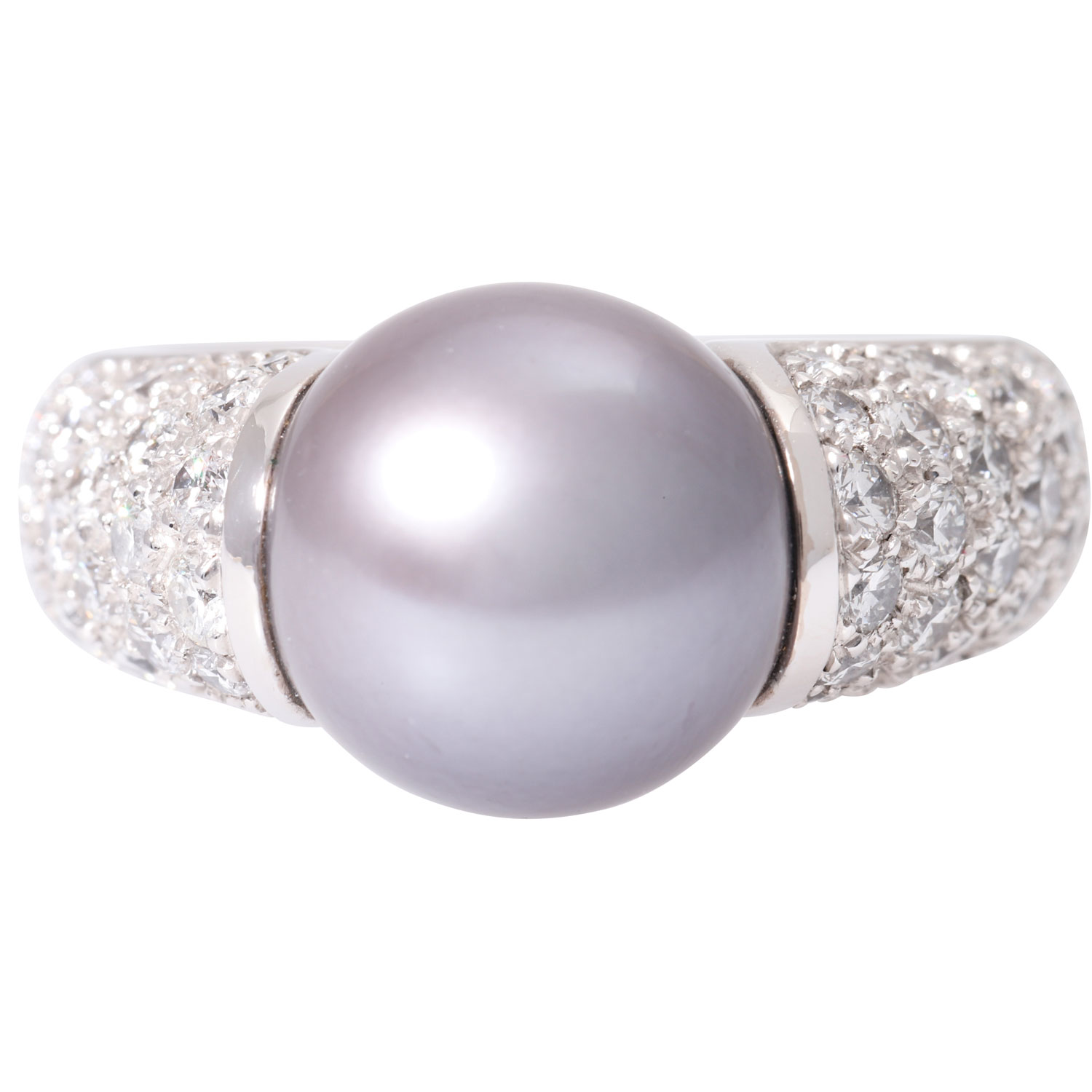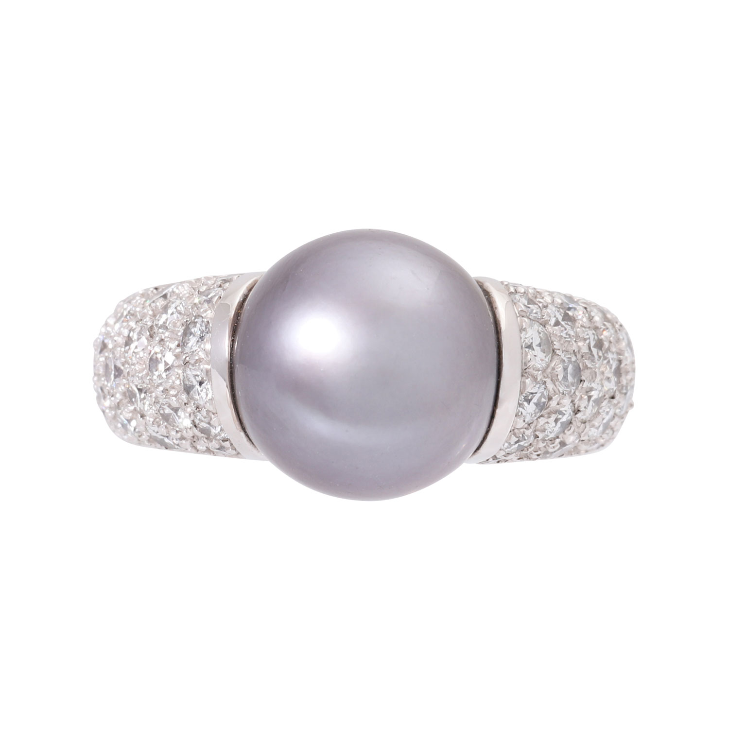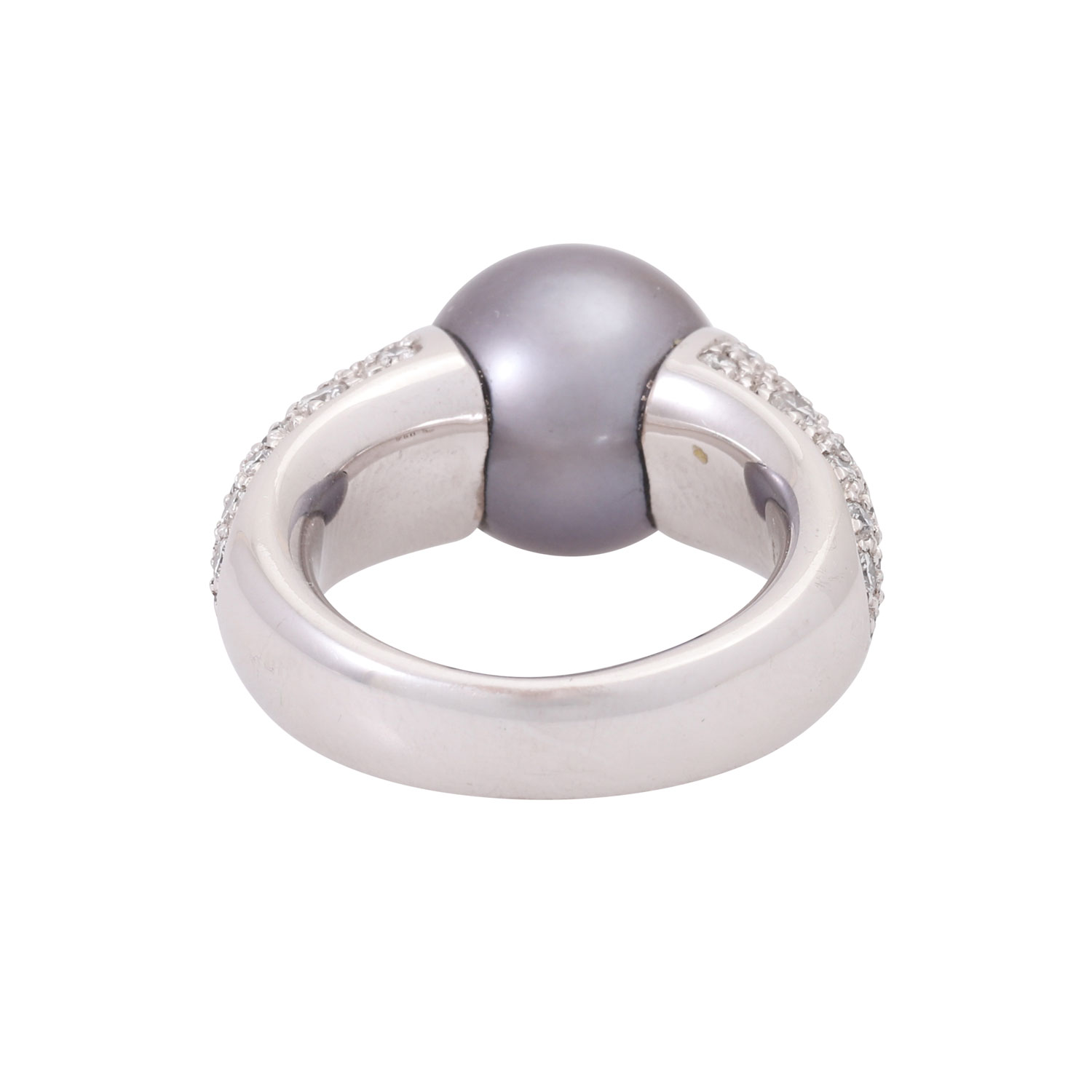 Ring with Tahitian cultured pearl 11.5 mm and brilliant-cut diamonds totalling ca. 1.4 ct, ca. WHITE-STW (H-I)/SI, NP: 7,950 €, 18K white gold, 17.8 g, ring size 52, 21st century, good condition, with unknown maker's mark, very solid workmanship.
