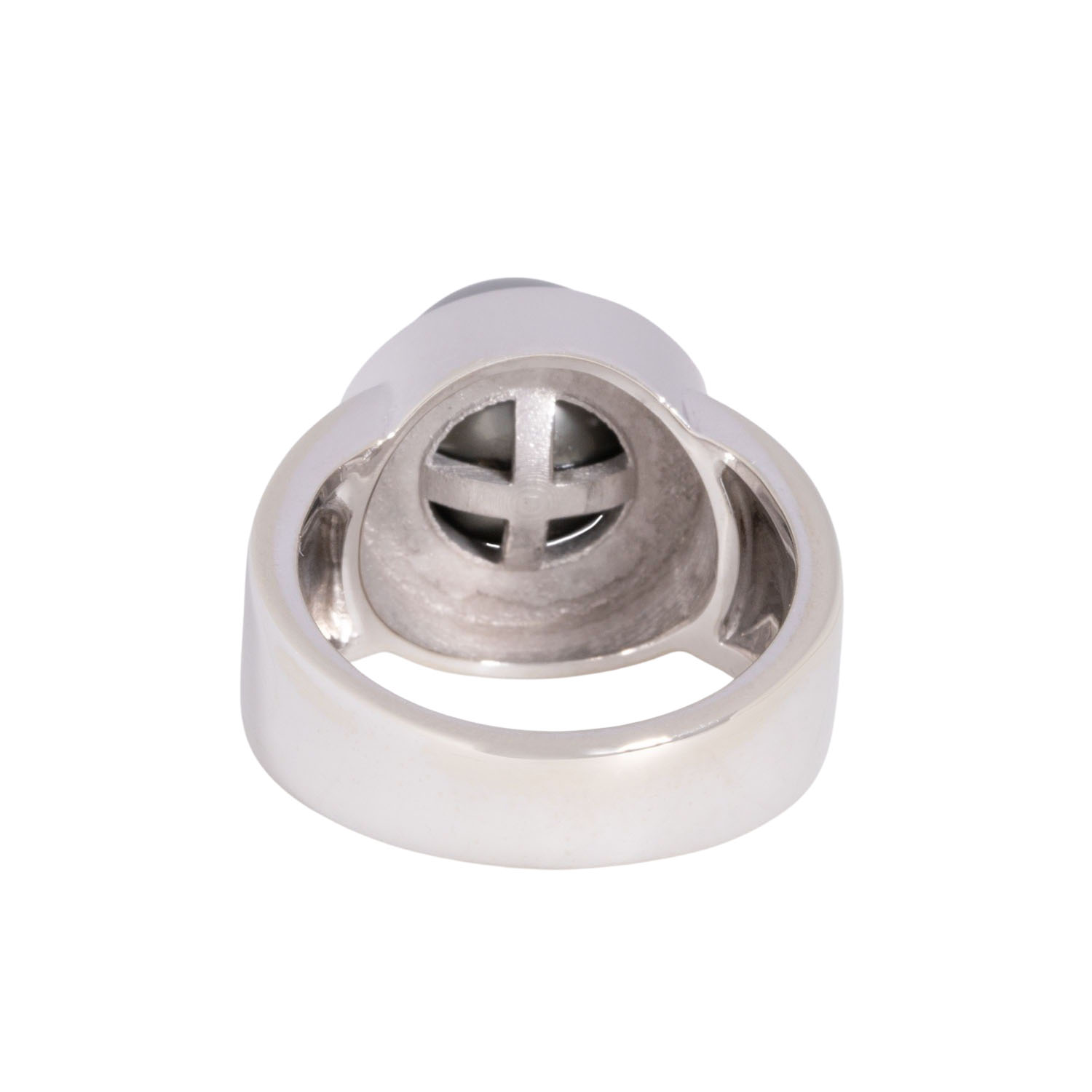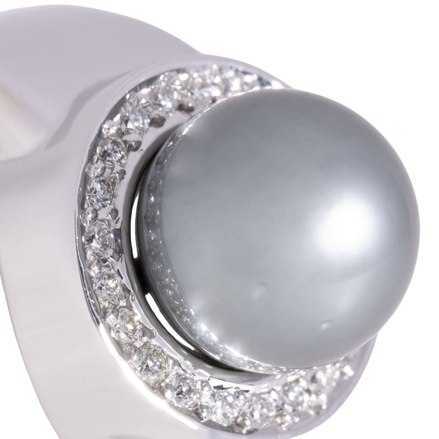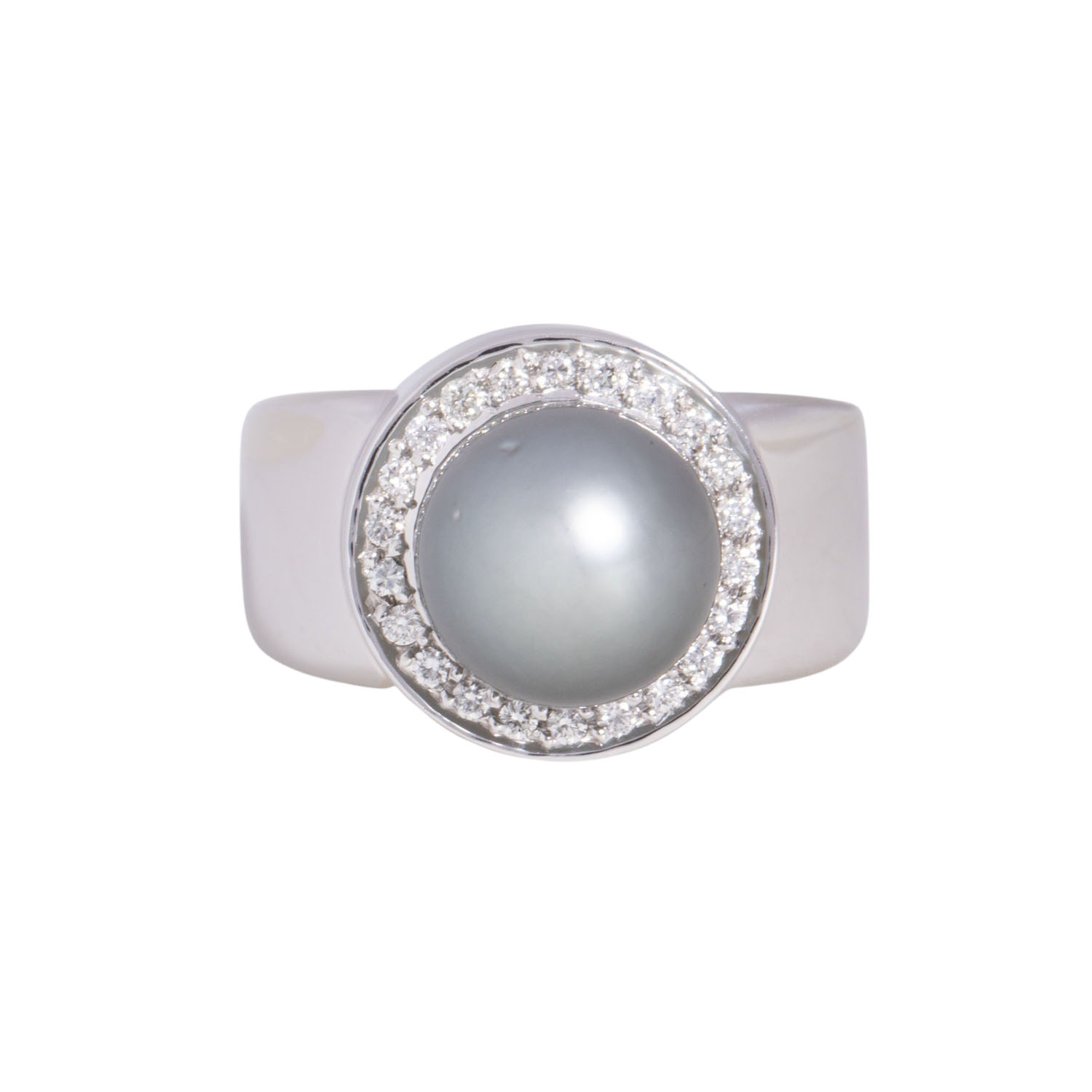 Ring with Tahitian cultured pearl ca. 10.2 mm surrounded by brilliant-cut diamonds totalling ca. 0.22 ct, different qualities, 14K white gold, 14.7 g, ring size 55, 21st century, good condition, solid workmanship.