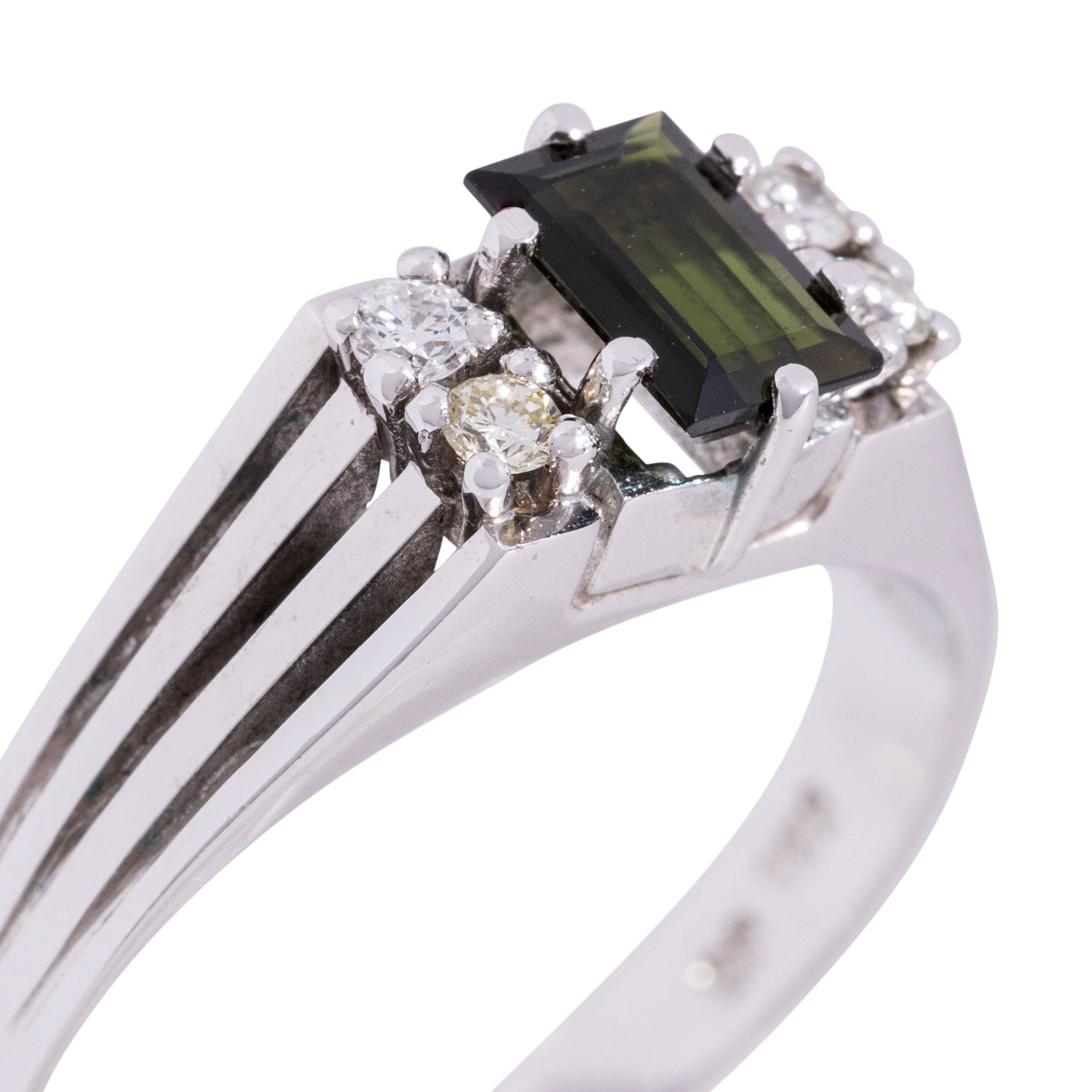 Ring with tourmaline ca 0.6 ct and 4 brilliant-cut diamonds totalling ca 0.08 ct, of good colour and clarity, WG 14 K, 3.3 g, ring size 56, 21st century, good condition.