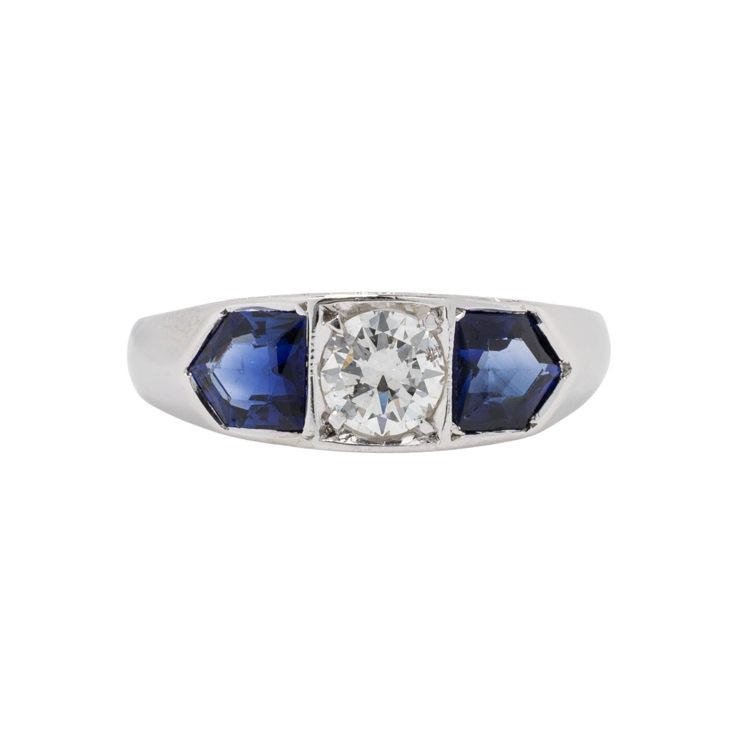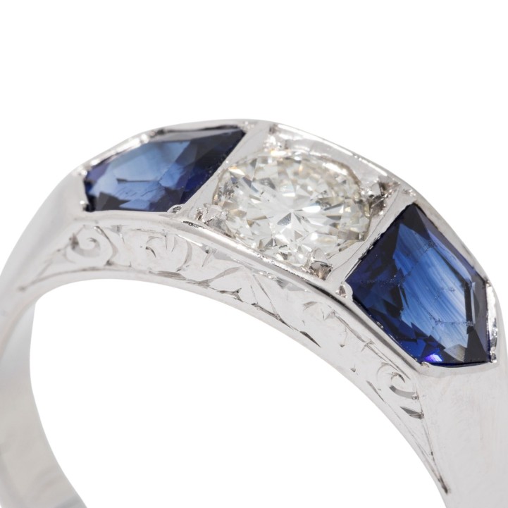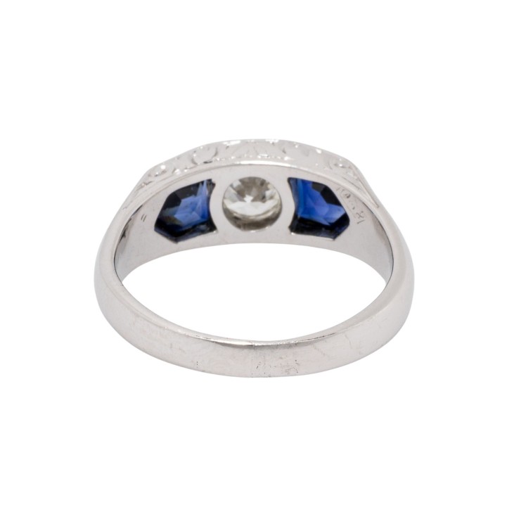 Ring with old-brilliant-cut diamond ca. 0.50 ct, ca. WHITE (H)/I1, 2 synthetic sapphires, 18K WG, 6.1 g, ring size 59, 1920s, minor signs of wear, sapphire facet edges abraded.