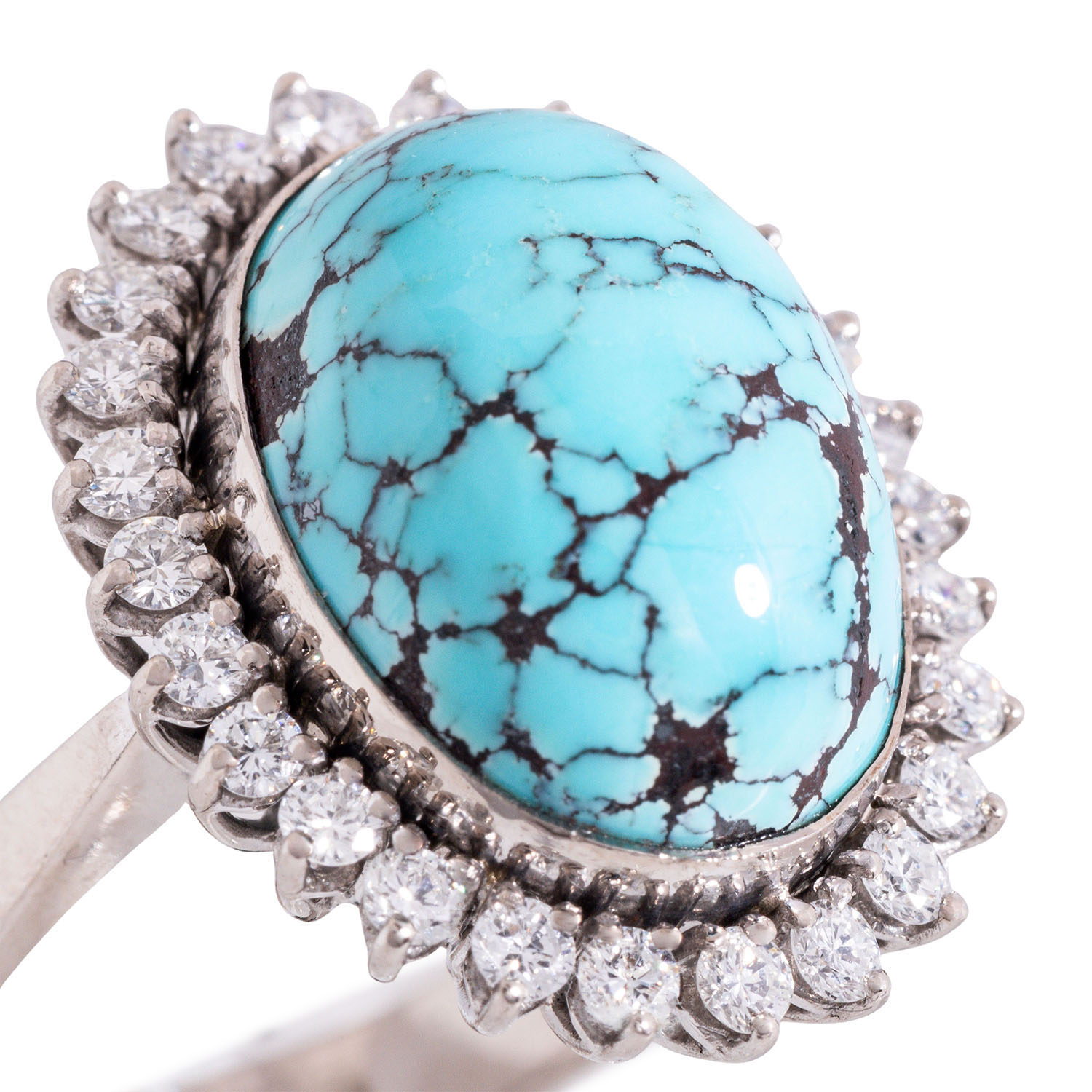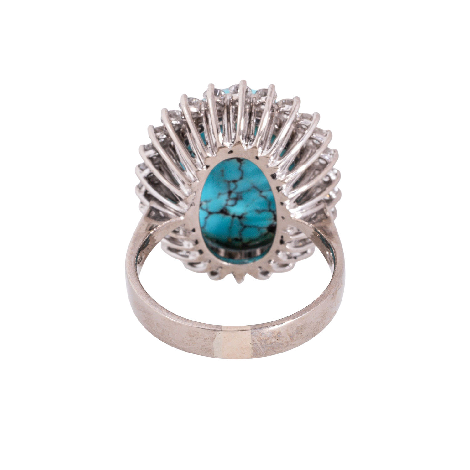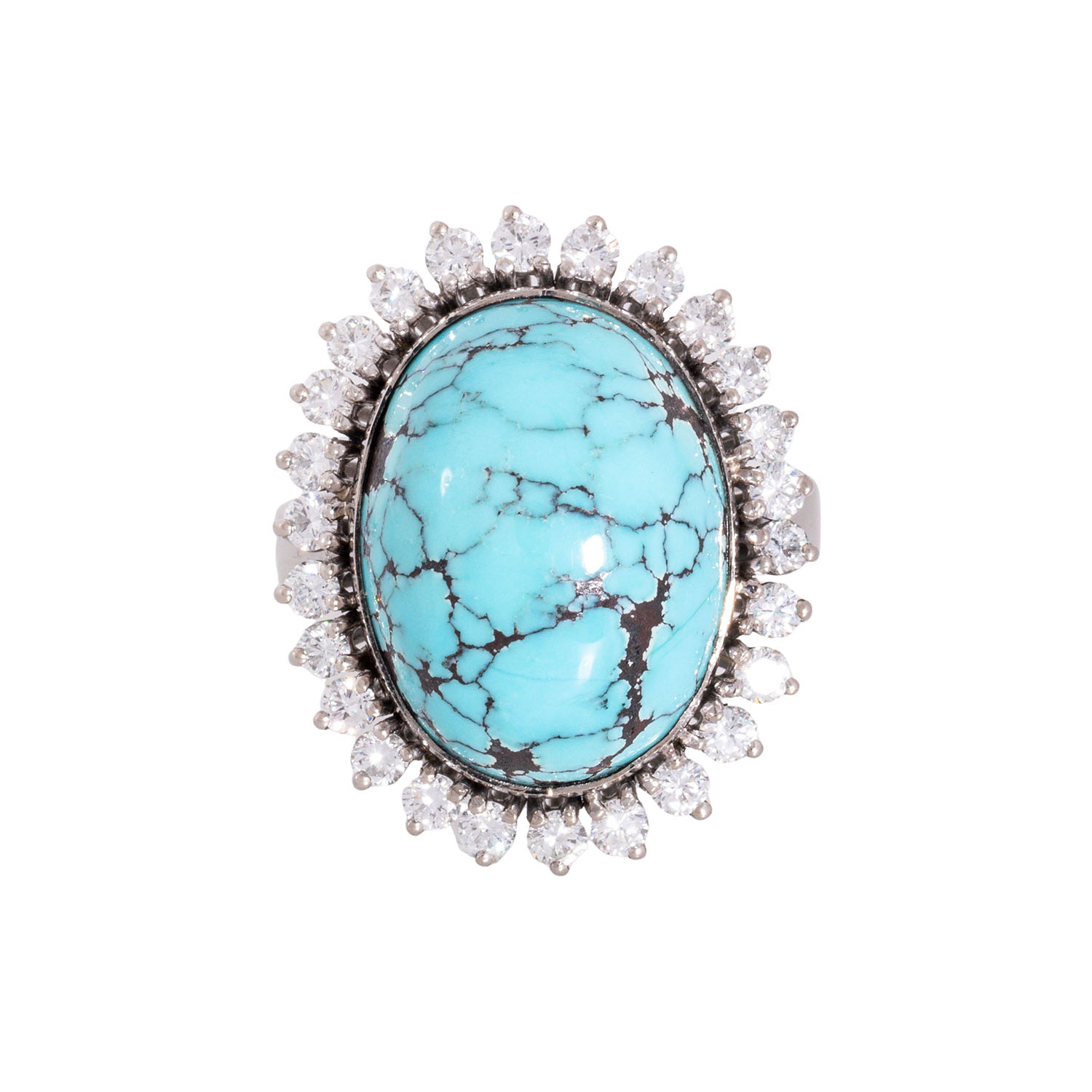 Ring with turquoise cabochon of ca. 12x16 mm and brilliant-cut diamonds totalling ca. 0.8 ct, good colour a. clarity, 18K WG, 10 g, ring size 55, 20th century, minor signs of wear, maker's mark 'AMU'.