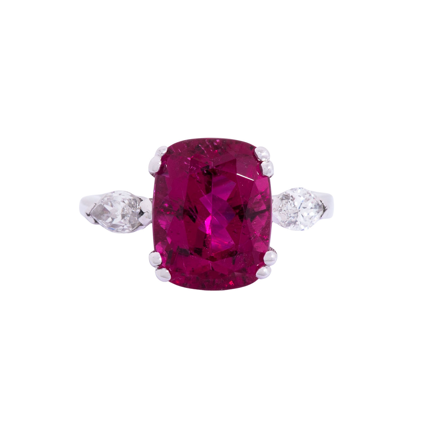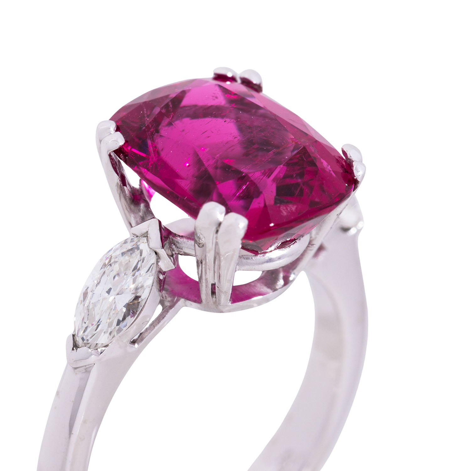 Ring with a fine rubellite ca. 5,0 ct and 2 navette-cut diamonds totalling ca. 0.45 ct, TIN (L)/VS-SI, WG 18K, 5.6 g, ring size 54, 21st century, mint condition. High quality craftsmenship.