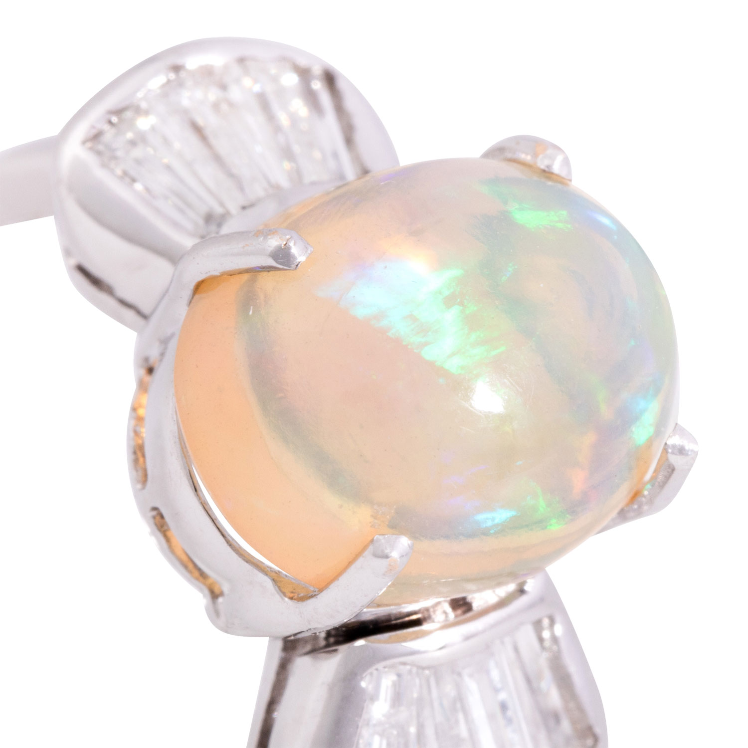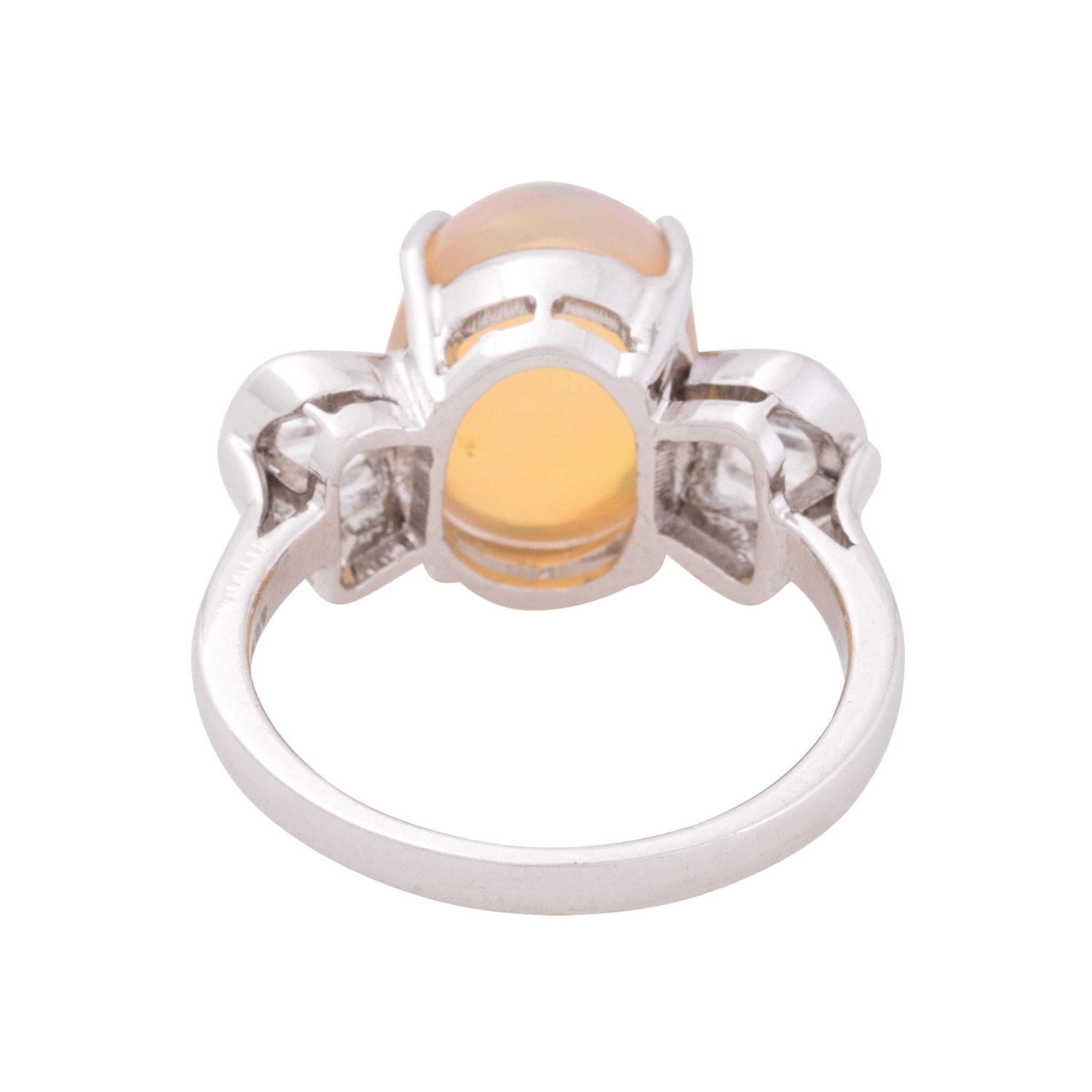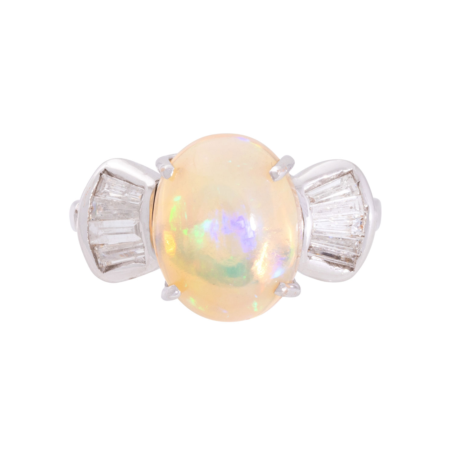 Ring with Welo Opal ca. 3.57 ct flanked by trapeze-cut diamonds totall. c. 0.34 ct (both engraved), WG 18K, 5.5 g, RW: 53, 21st century, signs of work, open joints due to poor workmanship, yet stable.