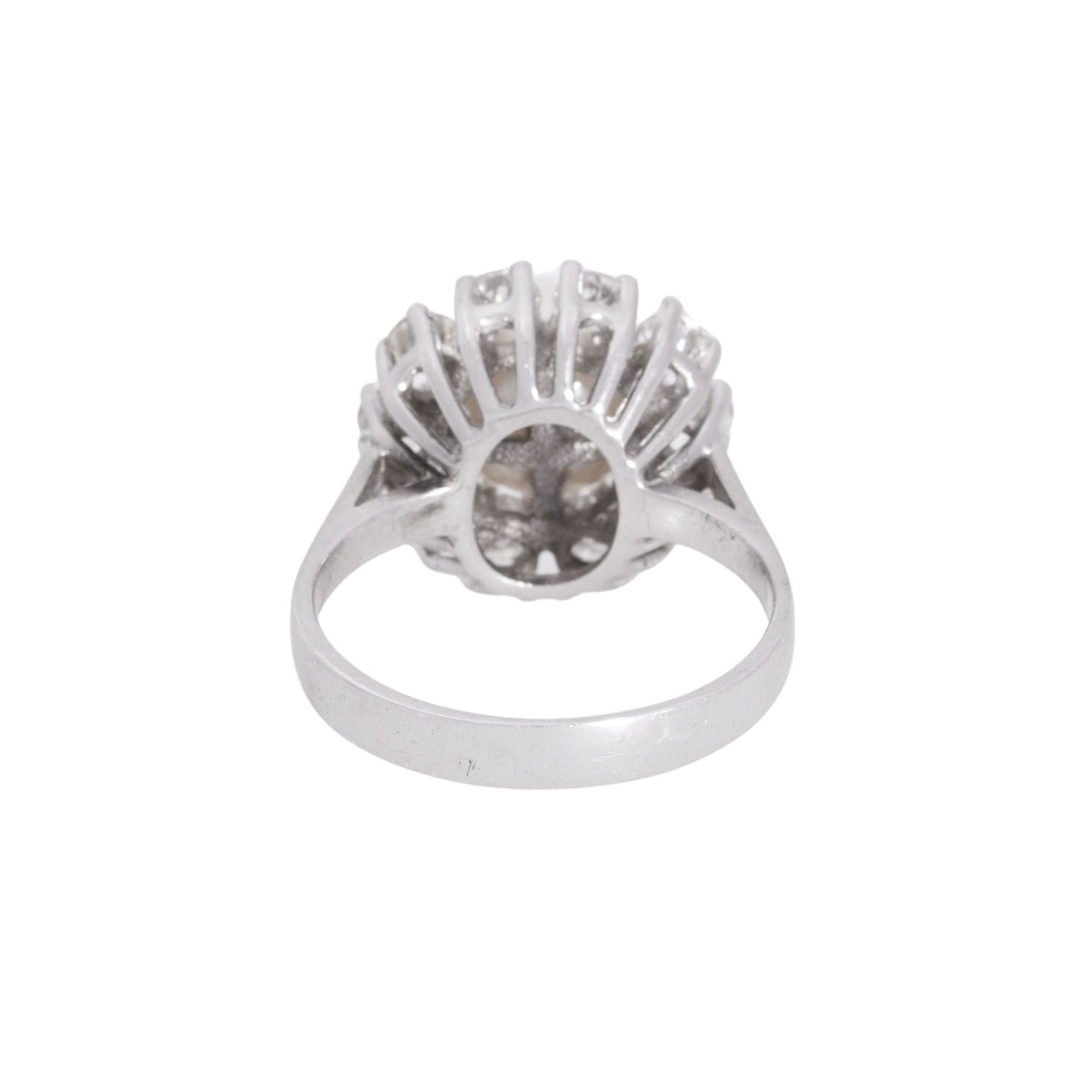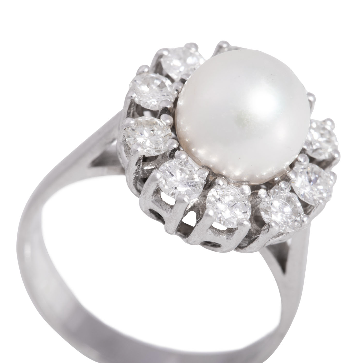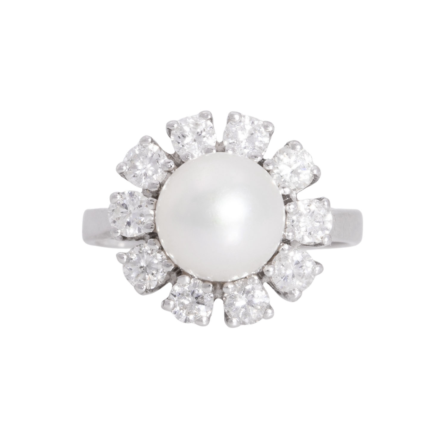 Ring with cultured white Akoya pearl, D: 8.7 mm, 10 brilliant cut diamonds, totalling 1.1 ct (marked), STW (I-J)/SI, 18K white gold, 6.0 g, ring size 56, last third of 20th century, minor signs of wear.