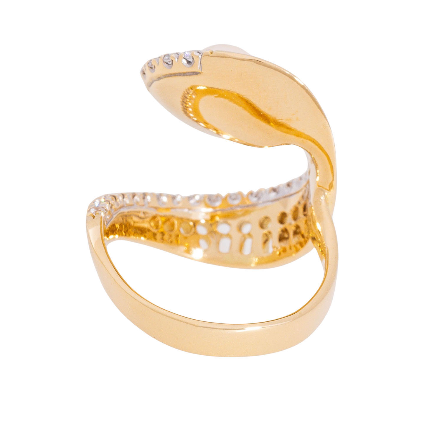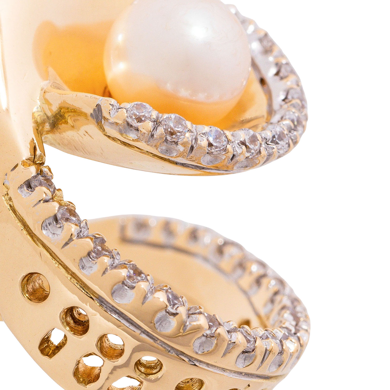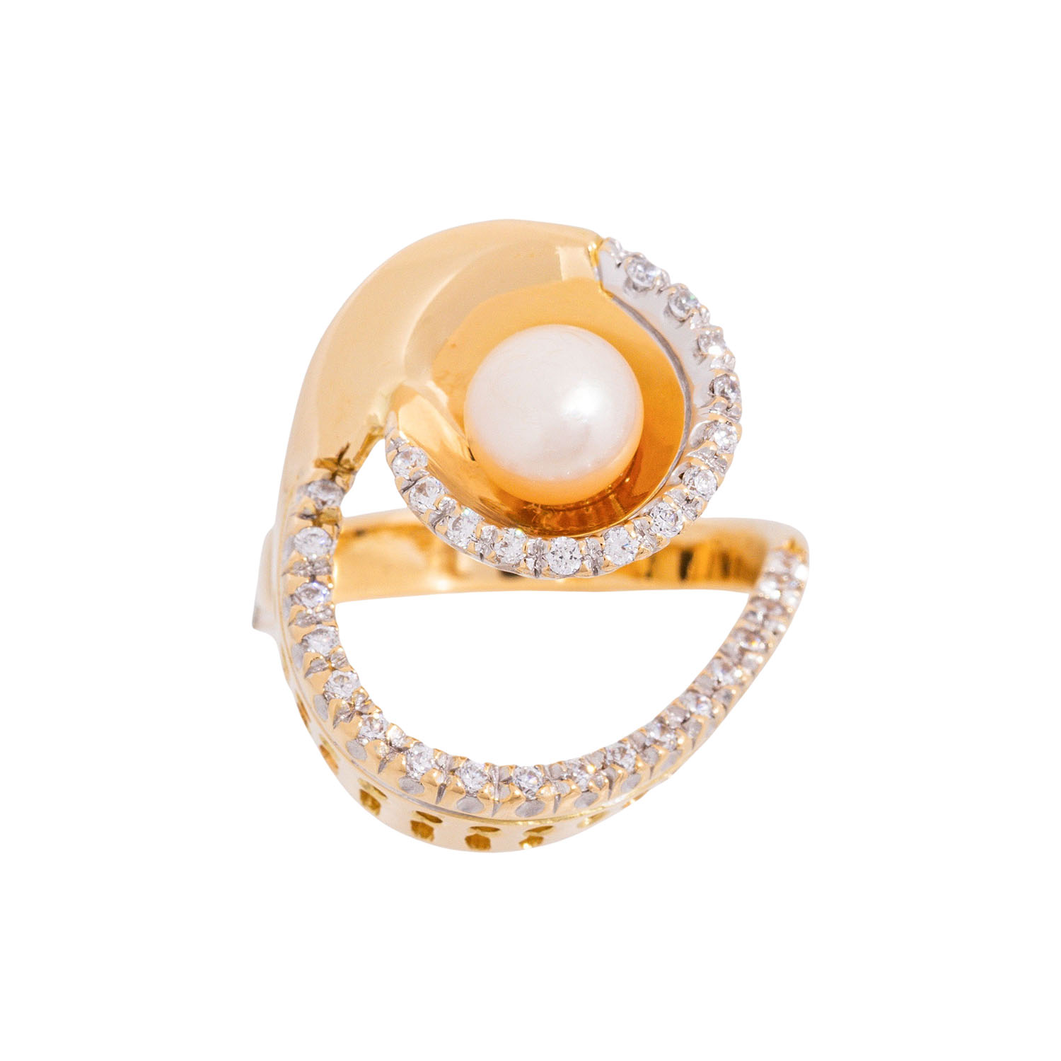 Ring with white cultured Akoya pearl, D: 7 mm, good lustre, 31 brilliant cut diamonds good colour and clarity, totalling ap. 0.31 ct, 18K yellow gold, 13.4 g, ring size 60, late 20th century, minimal signs of wear.