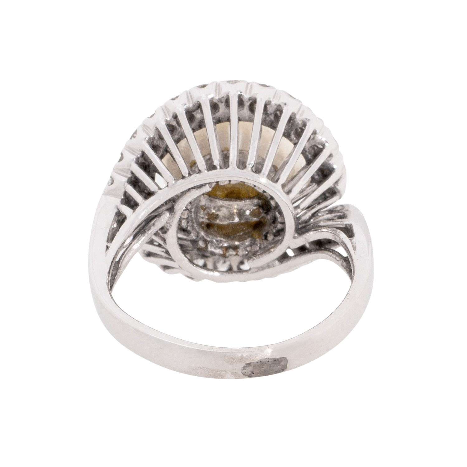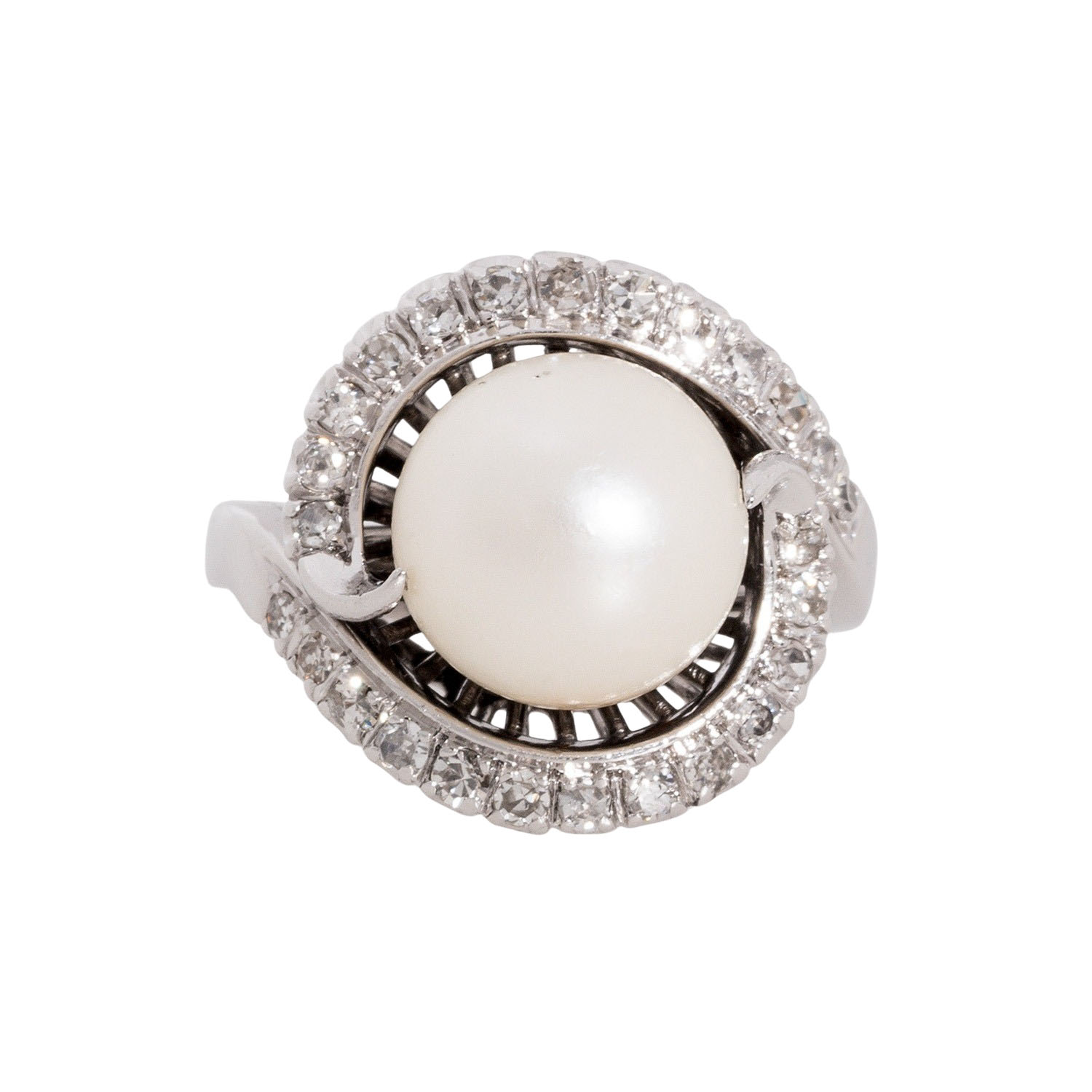 Ring with cultured white pearl, D: 10 mm, 26 single cut diamonds, totalling ap. 0.26 ct, medium colour and clarity, 18K white gold, 6.4 g, ring size 48, 2nd half of 20th century, minor signs of wear, 5 diamonds chipped.