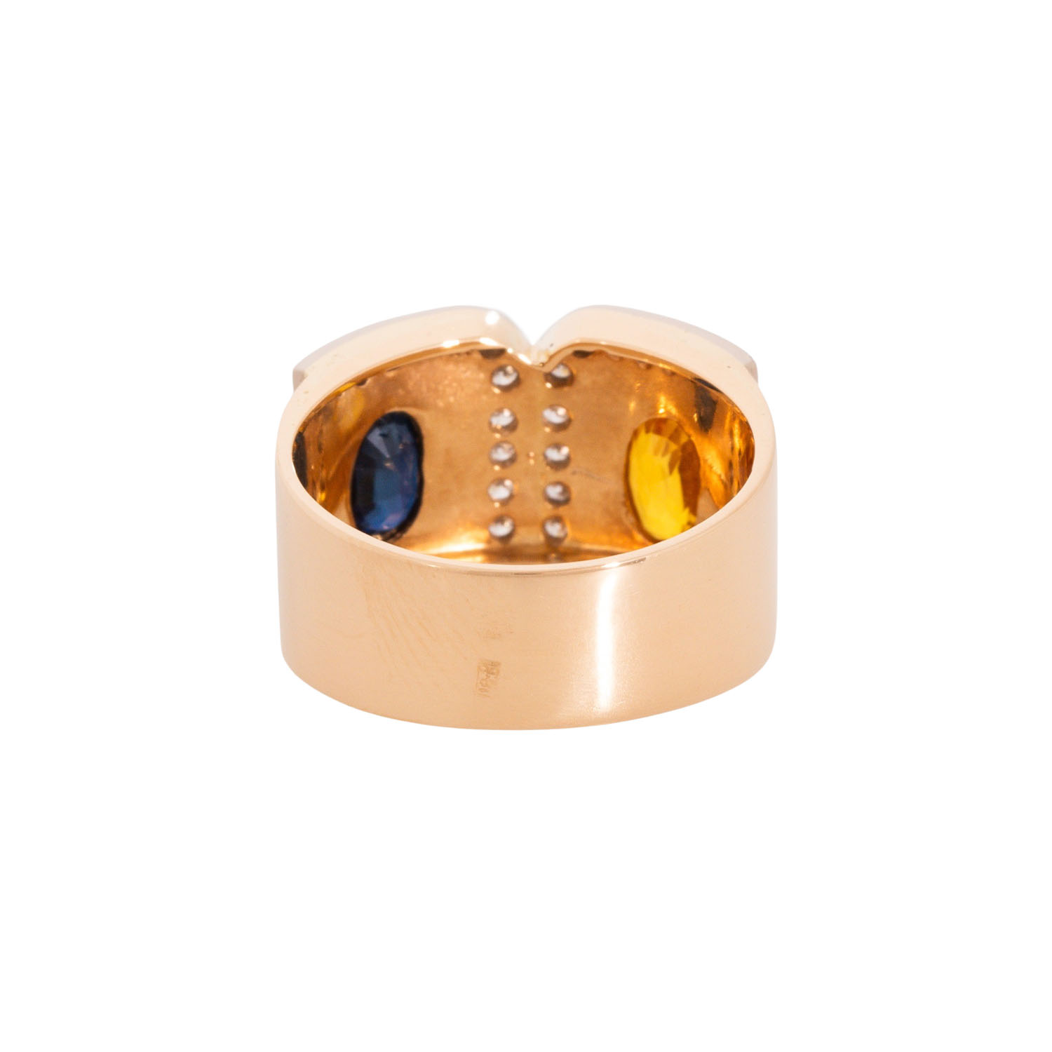 Ring with yellow sapphire, blue sapphire, and 22 brilliant-cut diamonds totalling approx. 0.11 ct, WHITE (H)/SI, faceted oval-cut sapphires, each approx. 0.40 ct, 14K yellow/white gold, 5.5 g, ring size: 51, W: approx. 6.5 - 10.2 mm, 21st century, signs of wear, with hallmark.