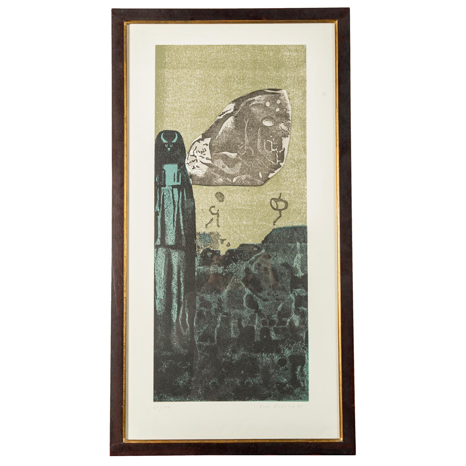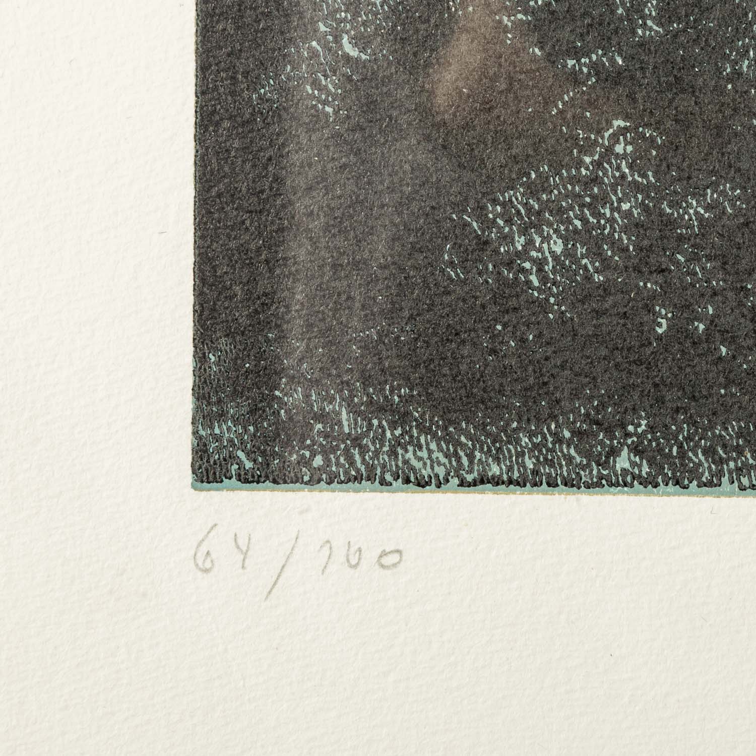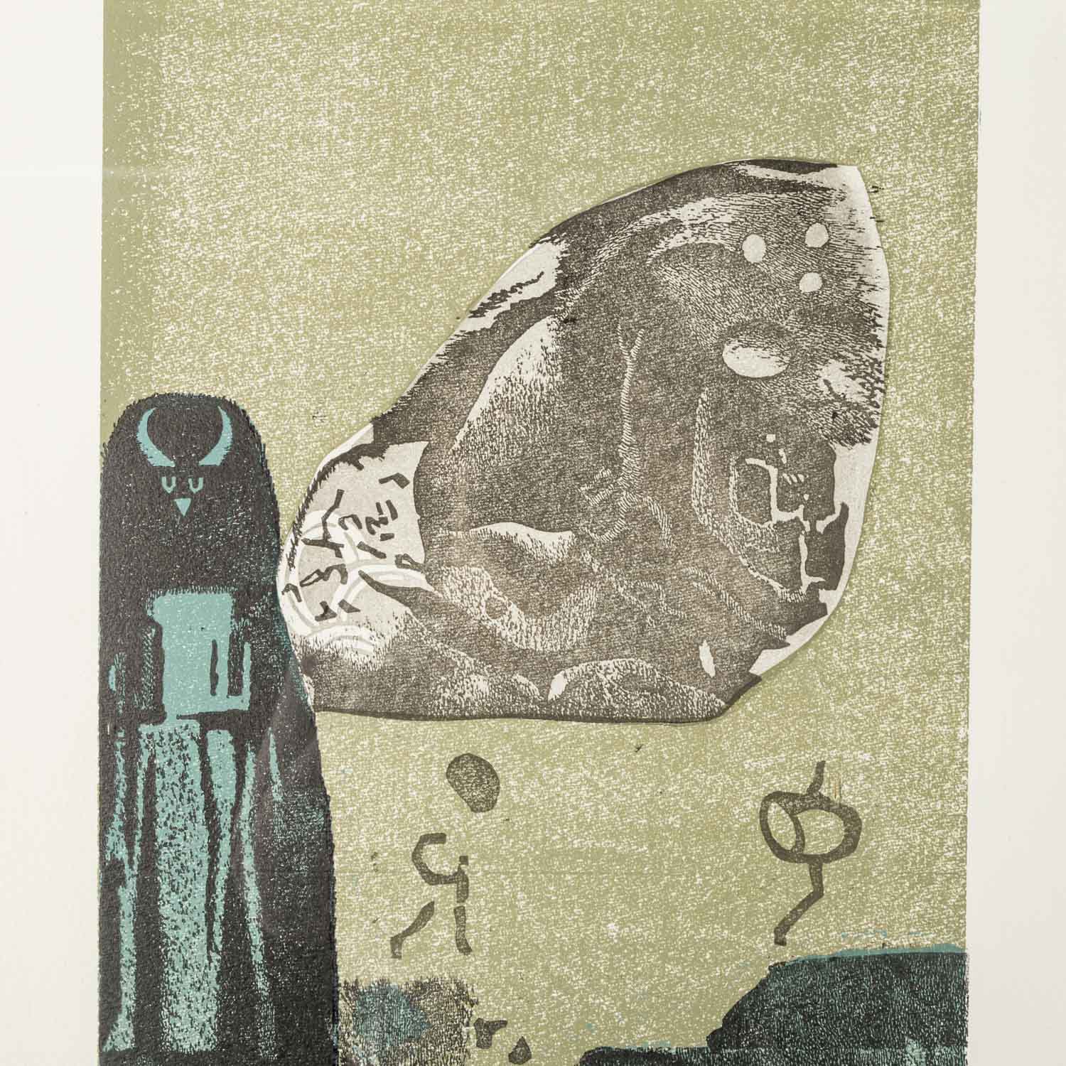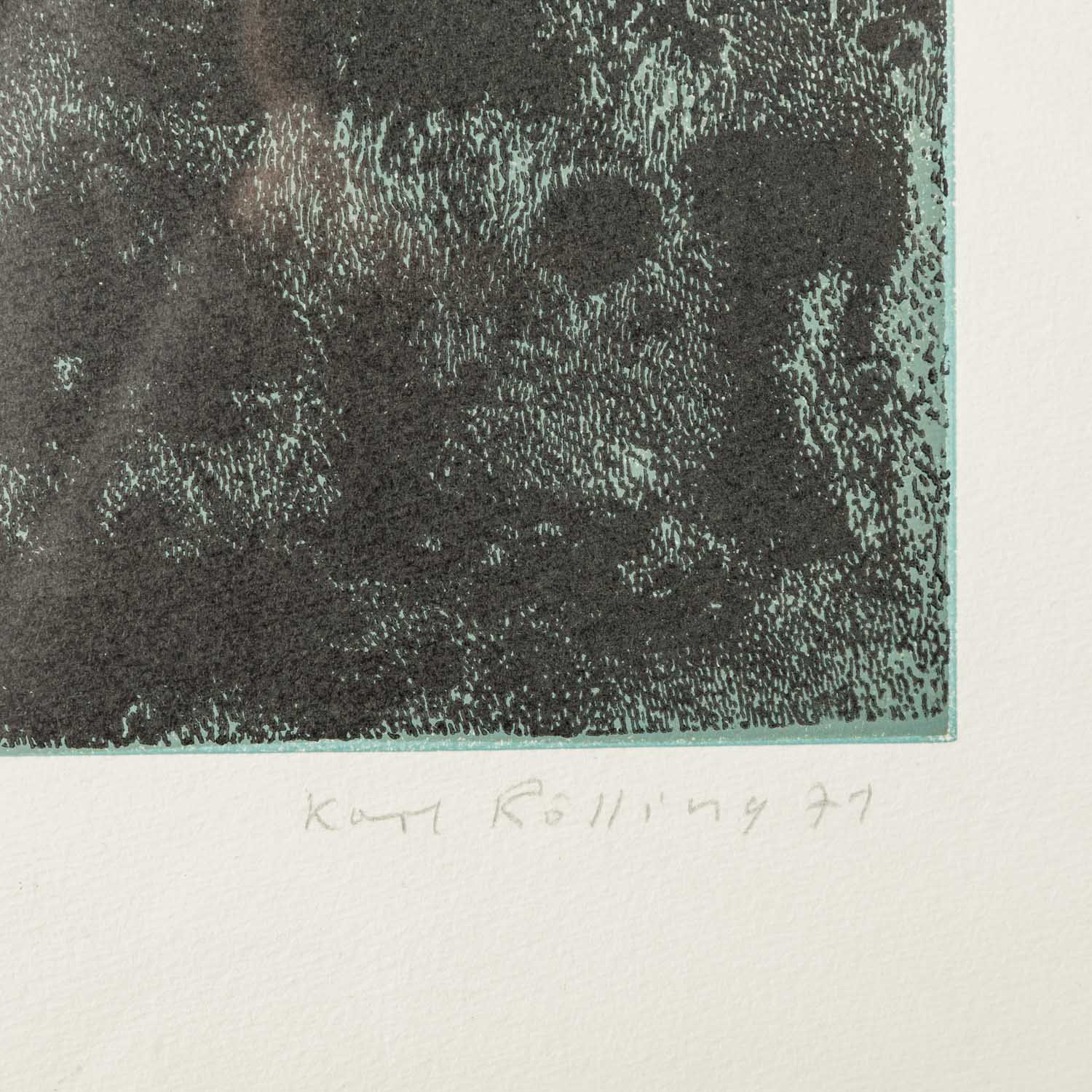 RÖSSING, KARL (1897-1987), 'Falena enters the picture', linocut/laid paper (upper left indistinct watermark), signed and dated by hand in pencil (19)71, with pencil no. 64/100, HxW: plate approx. 67x29 cm, leaf approx. 78x39.5 cm, outer dimensions of frame approx. 84x45 cm. Slight signs of age and creases. With glazed frame.