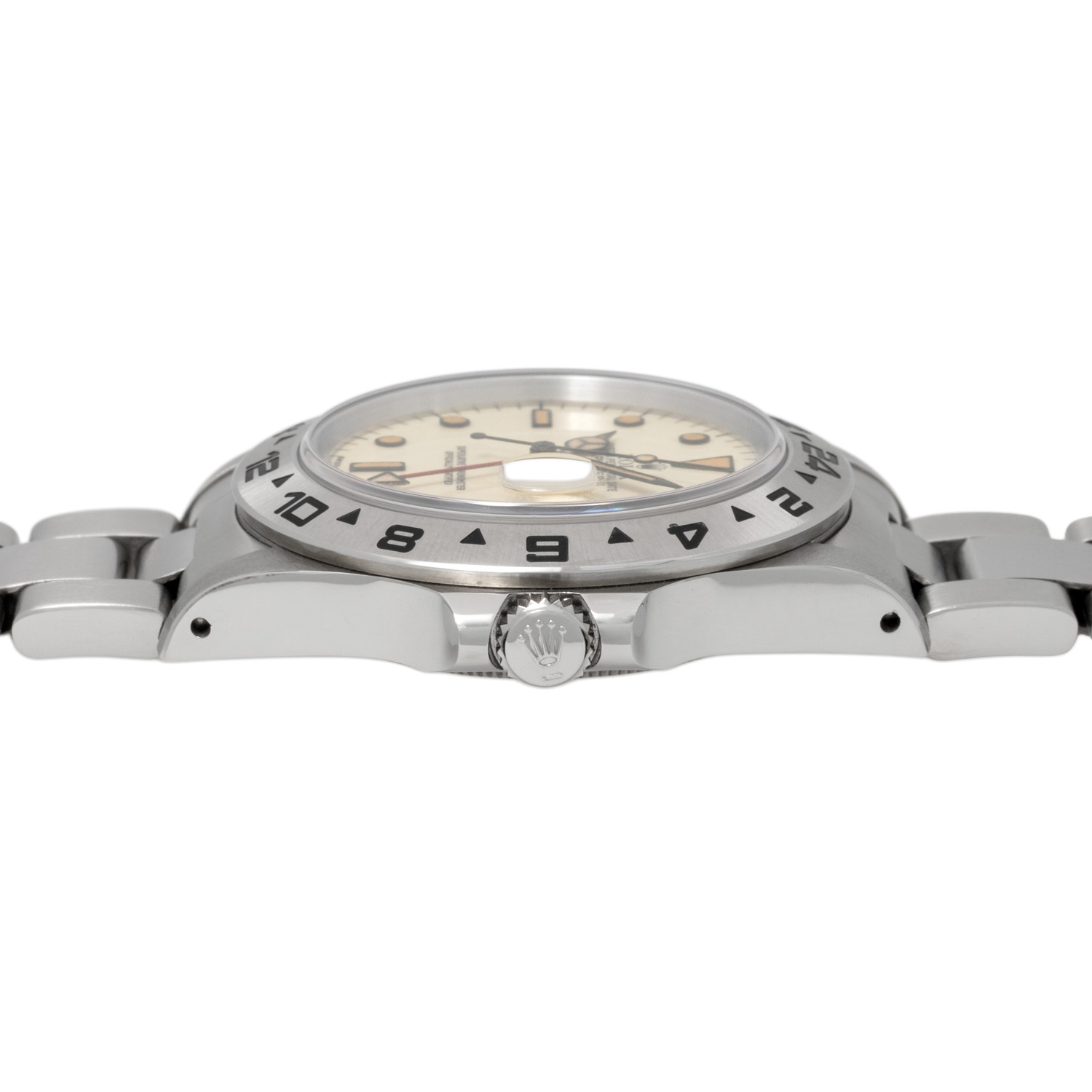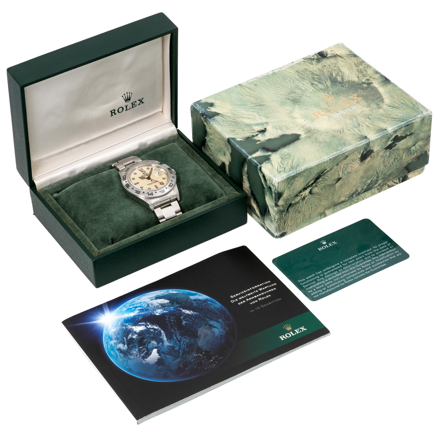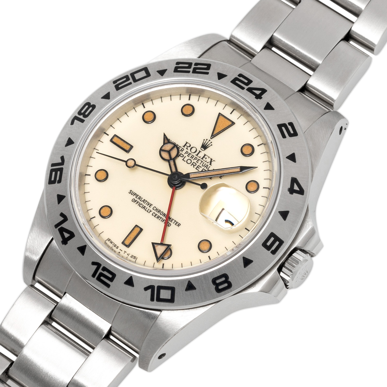 ROLEX early vintage Explorer II “Cream Dial” men's watch, ref. 16550. Approx. 1984. Stainless steel, case number 8470274. Automatic movement cal. 3085 with very good accuracy (+6s/day, 289° amplitude). Cream-white discolored dial with perfect patina, tritium luminous material on the indices discolored to a beautiful pumpkin hue, date display and second time zone, black tritium hands with matching patina. Original Rolex Oyster bracelet with folding clasp in stainless steel, Ref. 78360, clasp code R10 (1993, presumably service clasp). Very good condition, light signs of wear on the case and bracelet. Original box, Rolex service papers 10/2018 and bezel protector included. Diameter approx. 40 mm measured without crown, suitable for wrist size of approx. 18.5 cm.