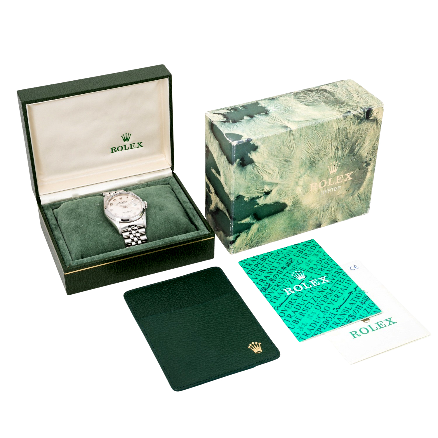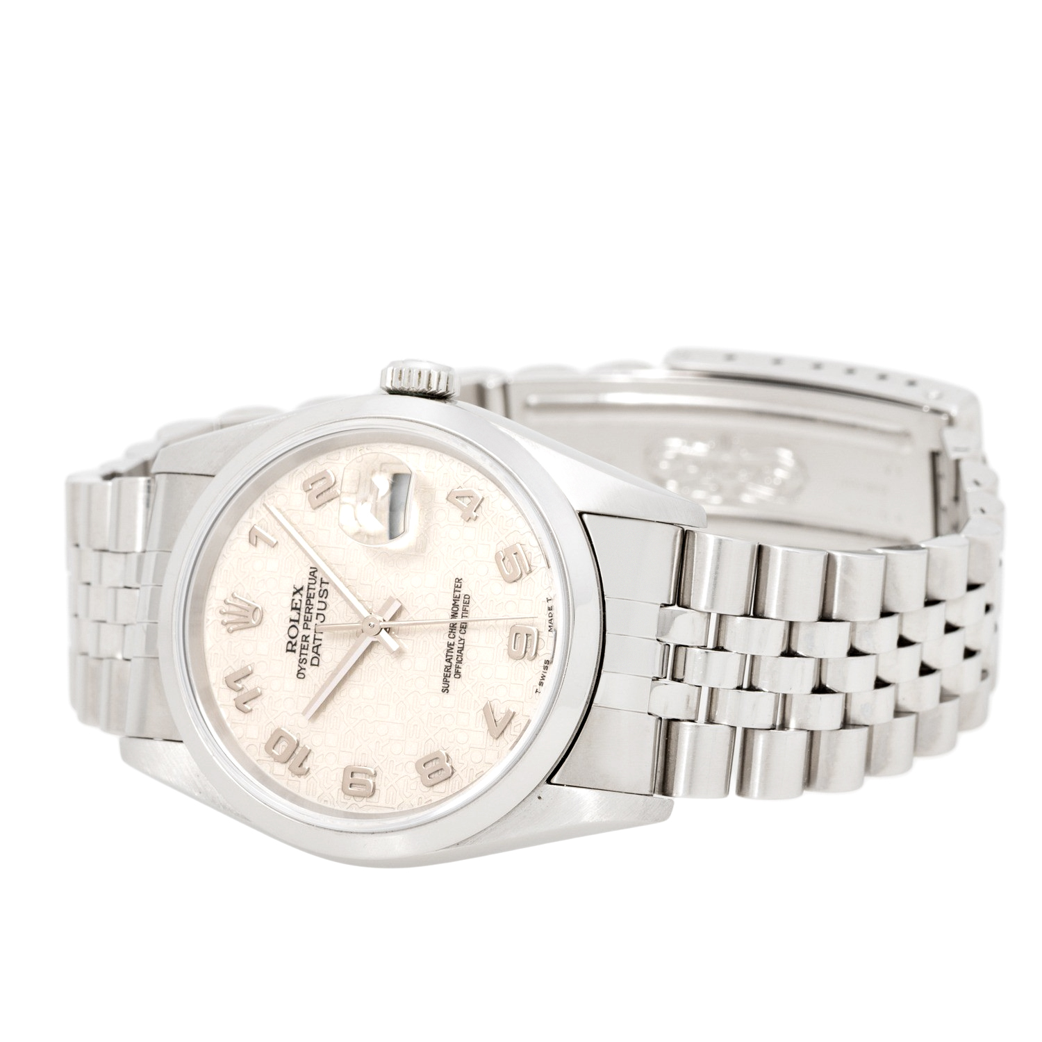 ROLEX Datejust 36 'Computer Jubilee Dial' Ref 16200 men's watch. Box and papers. Stainless steel. Automatic movement cal. 3135 with very good performance (+6s/d. 294°). Cream-colored tritium Computer Jubilee dial with applied Arabic indices and date display. Rolex Jubilee bracelet (slight stretch) with folding clasp. Good condition with signs of wear. Original box, card folder. Translation booklet, revision invoice from July 2007 and warranty certificate enclosed. Purchased in January 1997 from jeweler Andreas Huber in Munich. Diameter approx. 36 mm (measured without crown). Fits up to approx. 20 cm wrist size.