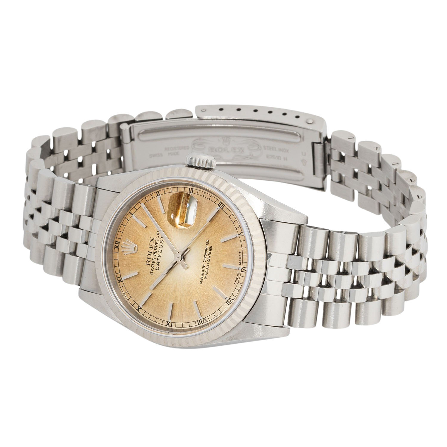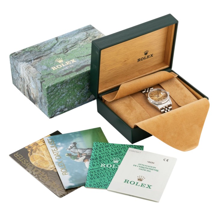 ROLEX Datejust 36 Ref 16234 'LC100' men's watch from 1999. Box and papers. Stainless steel / 18K white gold. Serial number U380967. Automatic movement cal. 3135 with very good performance (+9 s/d. 274° amplitude). Faded champagne-colored tritium dial with applied indices, Roman numerals, and date display. Fluted bezel in 18K white gold. Rolex Jubilee bracelet (with stretch) with folding clasp. Used, visible signs of wear on the case, bezel, and bracelet. Original box, instructions, translation booklet, original purchase receipt, and warranty card included. Purchased in August 1999 from jeweler Jock in Karlsruhe. Diameter approx. 36 mm (measured without crown). Fits wrists up to approx. 20.5 cm in size.