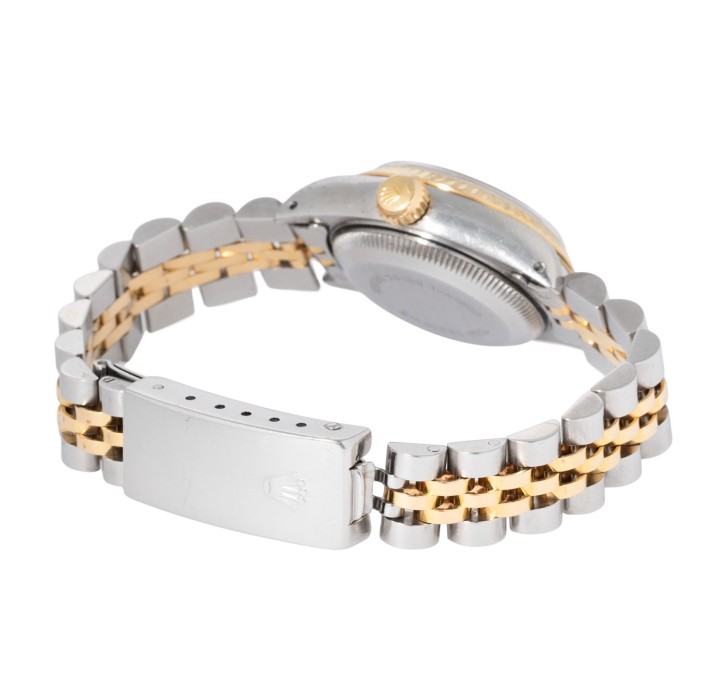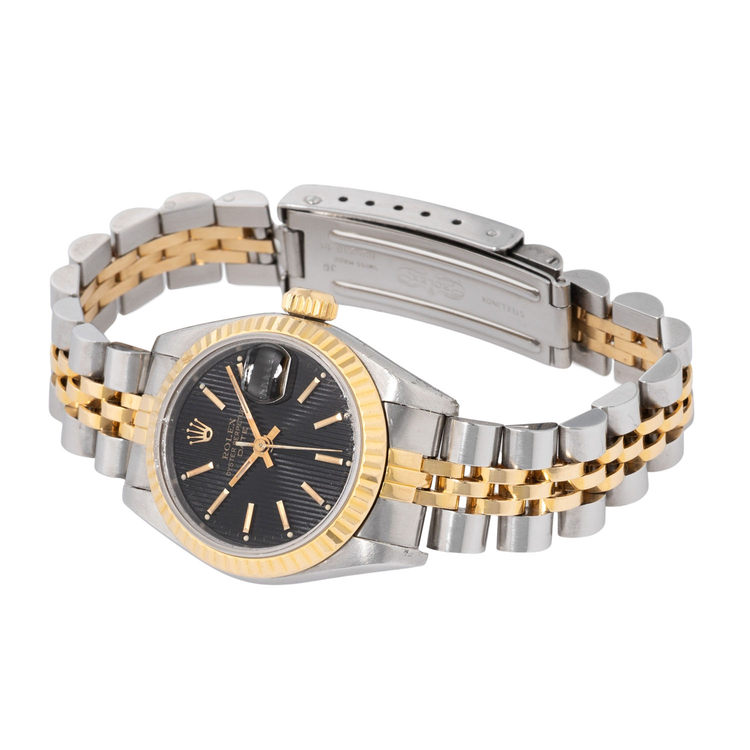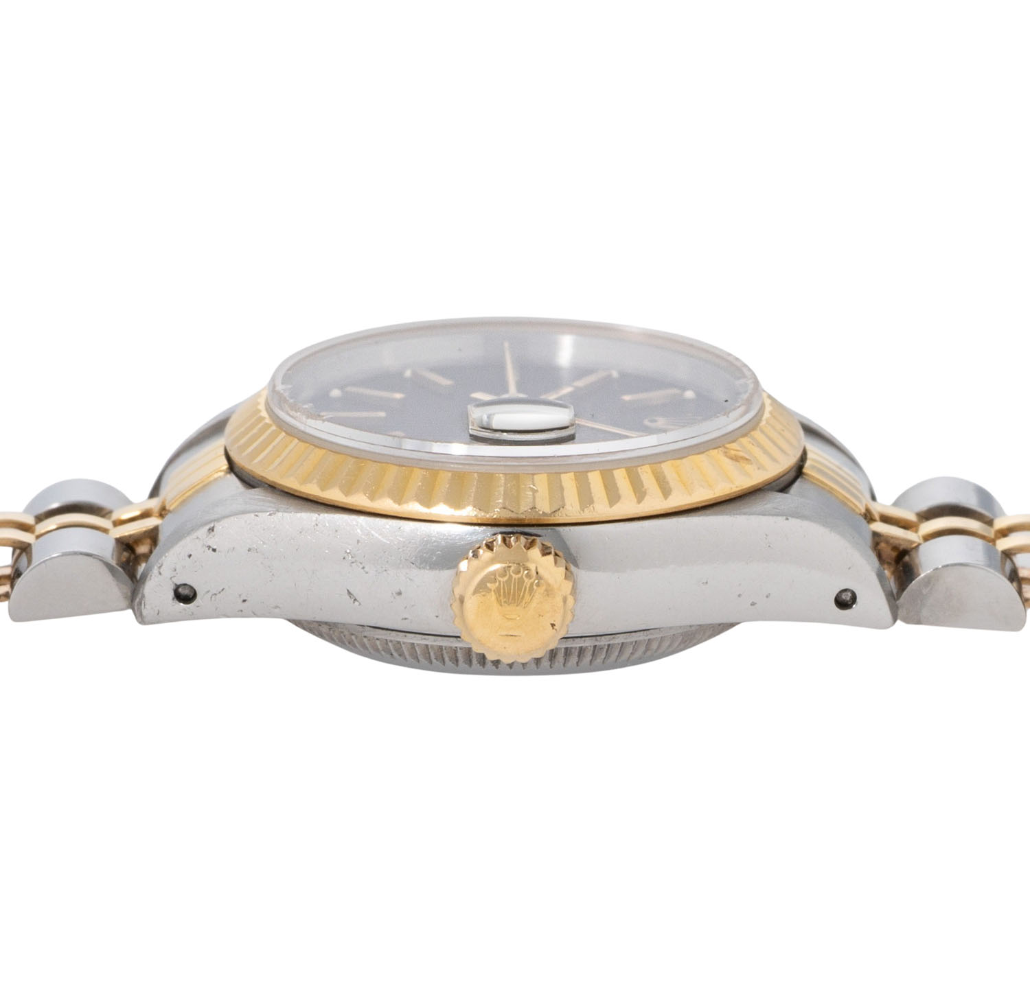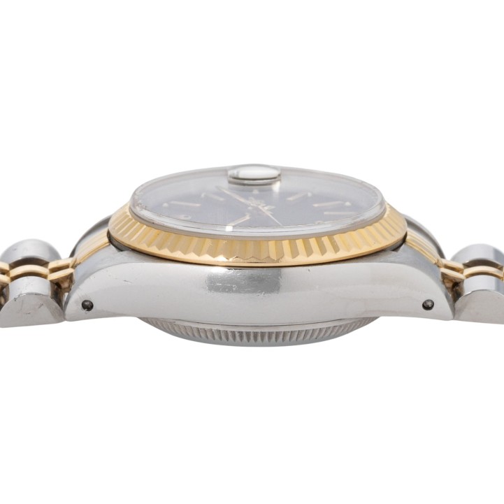 ROLEX Lady Datejust 26 Ref. 69173 'Tapestry' ladies wristwatch from approx. 1985. Stainless steel / 18K yellow gold. Automatic movement Cal. 2135 in working condition, service recommended. Slate gray tapestry dial with baton hour markers and hands, and date display. Rolex Jubilee bracelet in stainless steel / 18K yellow gold with folding clasp. Used condition with signs of wear, bracelet with stretch. Diameter approx. 26 mm measured without crown. Suitable for a wrist circumference of approx. 15.5 cm.