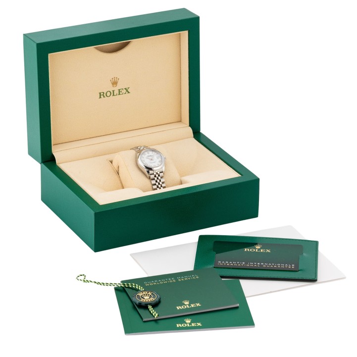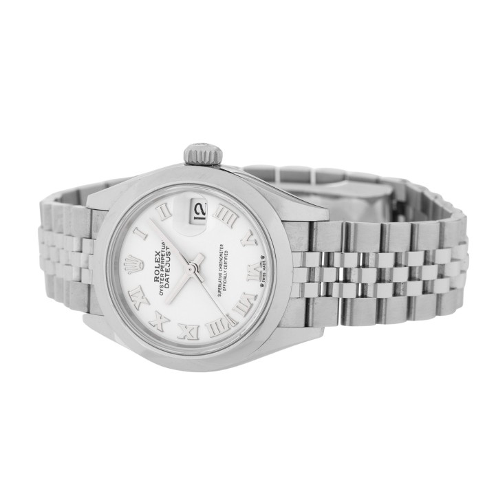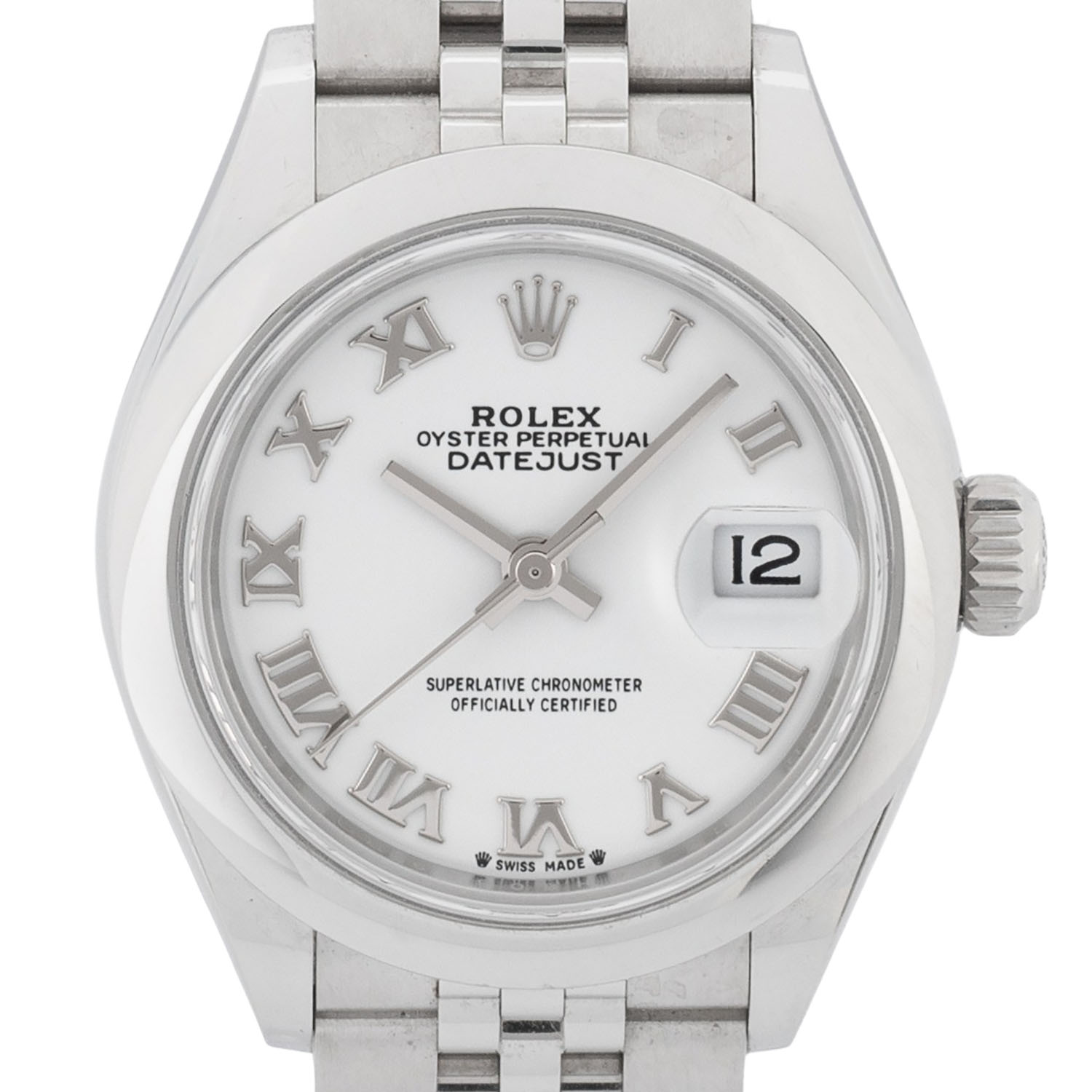Rolex Lady-Datejust Ref 279160 ladies' watch from 2024. Box and papers. Stainless steel. Serial number A6H80829. Automatic movement cal. 2236 with very good performance (+1 s/d. 283° amplitude). White dial with applied Roman numerals and date display. Rolex Jubilee stainless steel bracelet (slight stretch) with folding clasp. Good condition with signs of wear. Original box, hang tag, instructions, card folder, original purchase receipt, watch passport certificate, warranty booklet, and warranty card included. Purchased in June 2024 in Germany. Diameter approx. 28 mm (measured without crown). Suitable for wrist sizes up to approx. 16 cm.