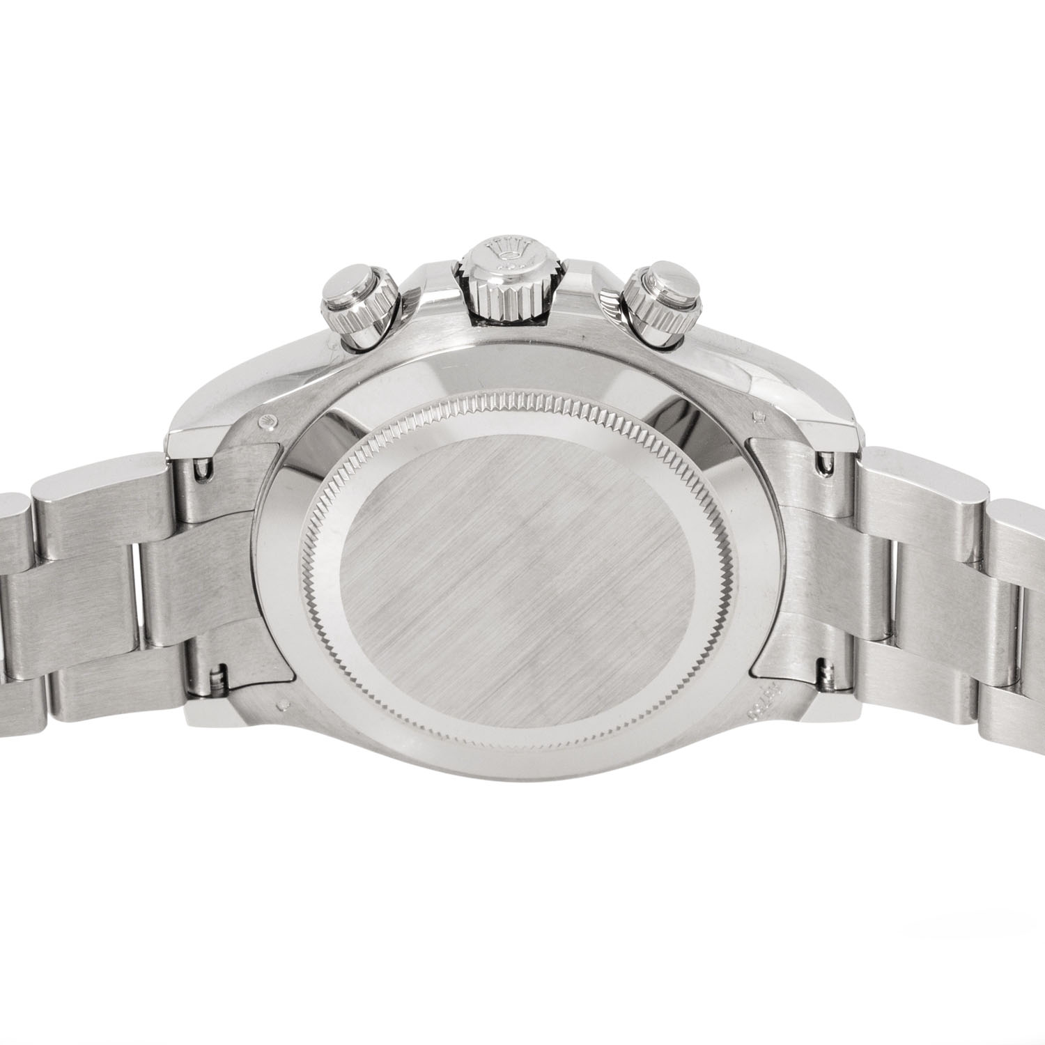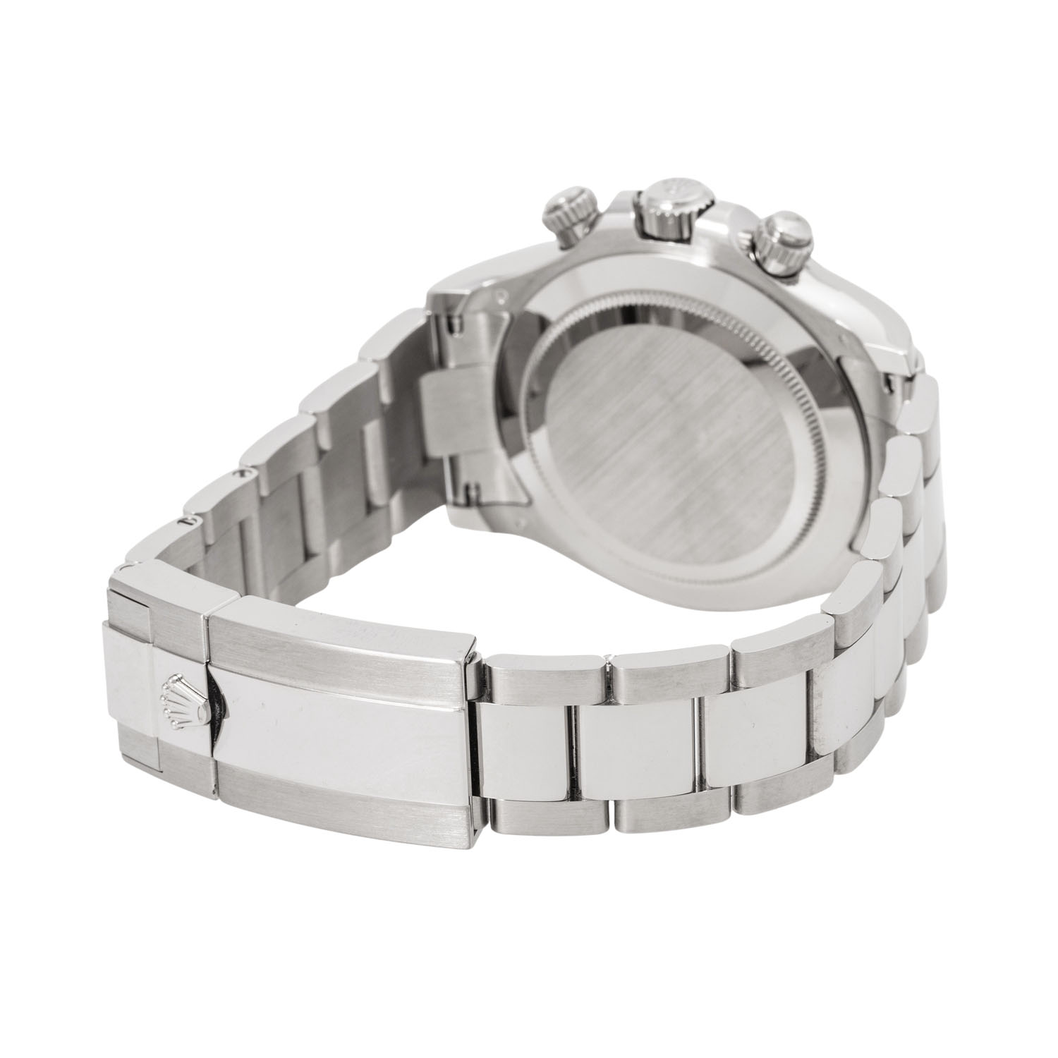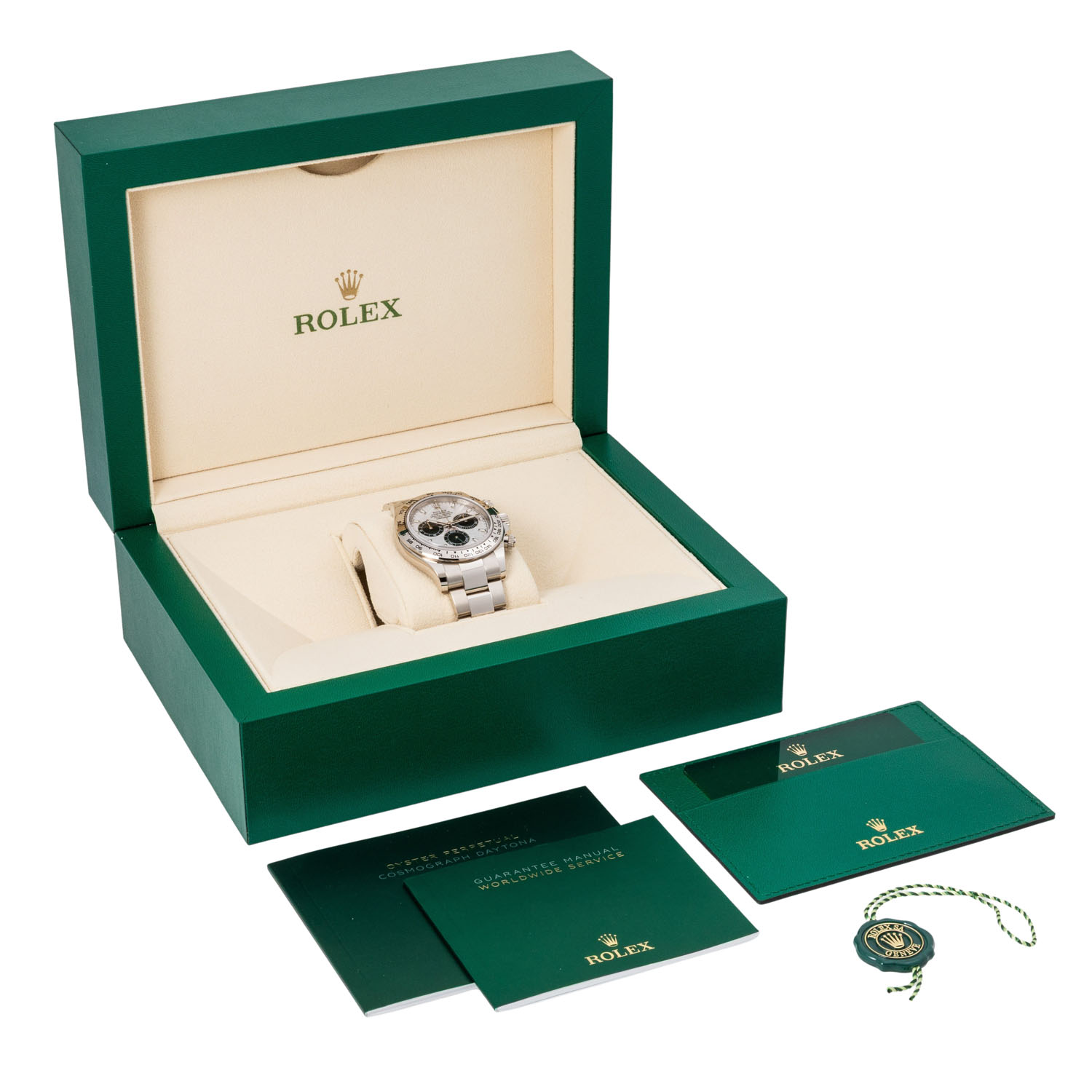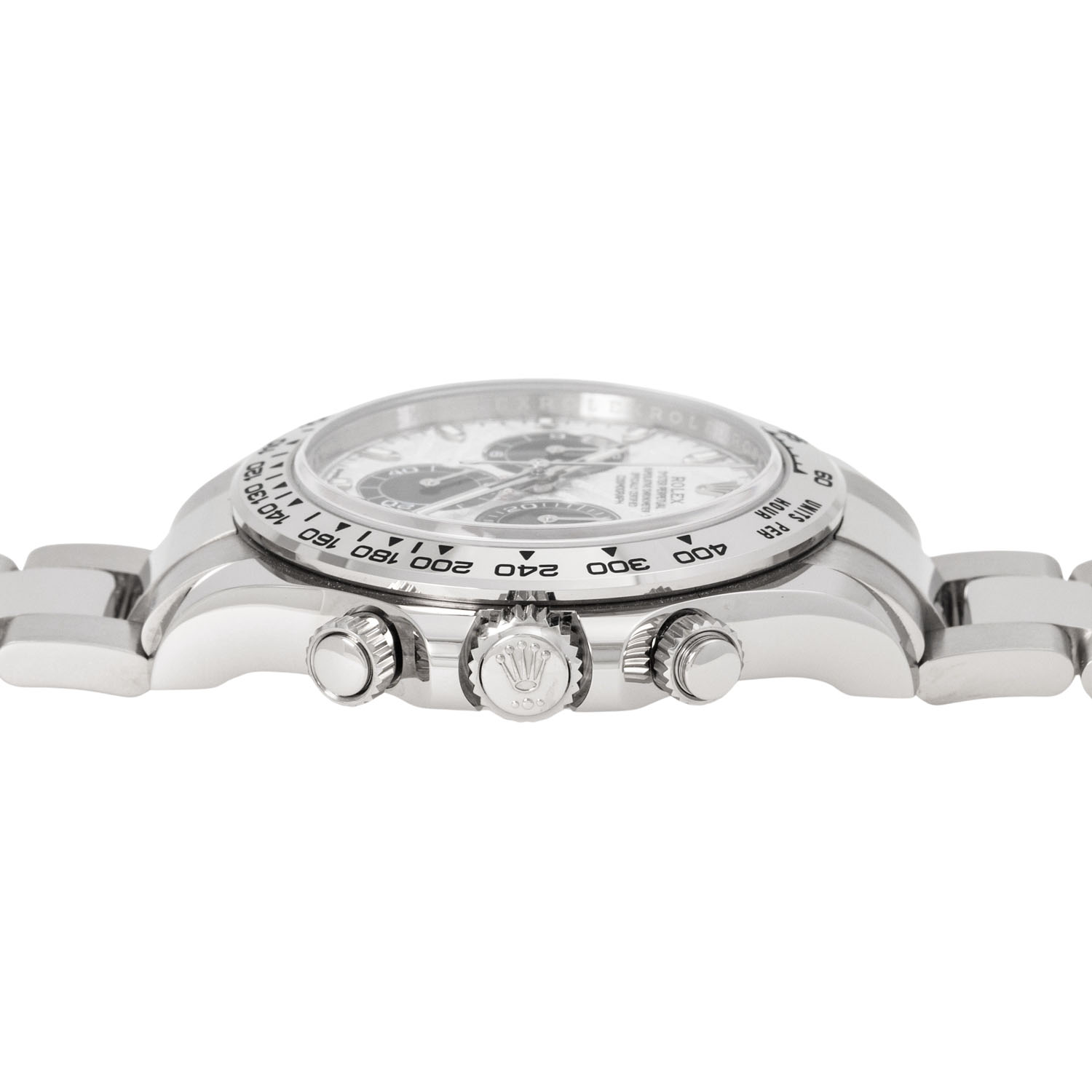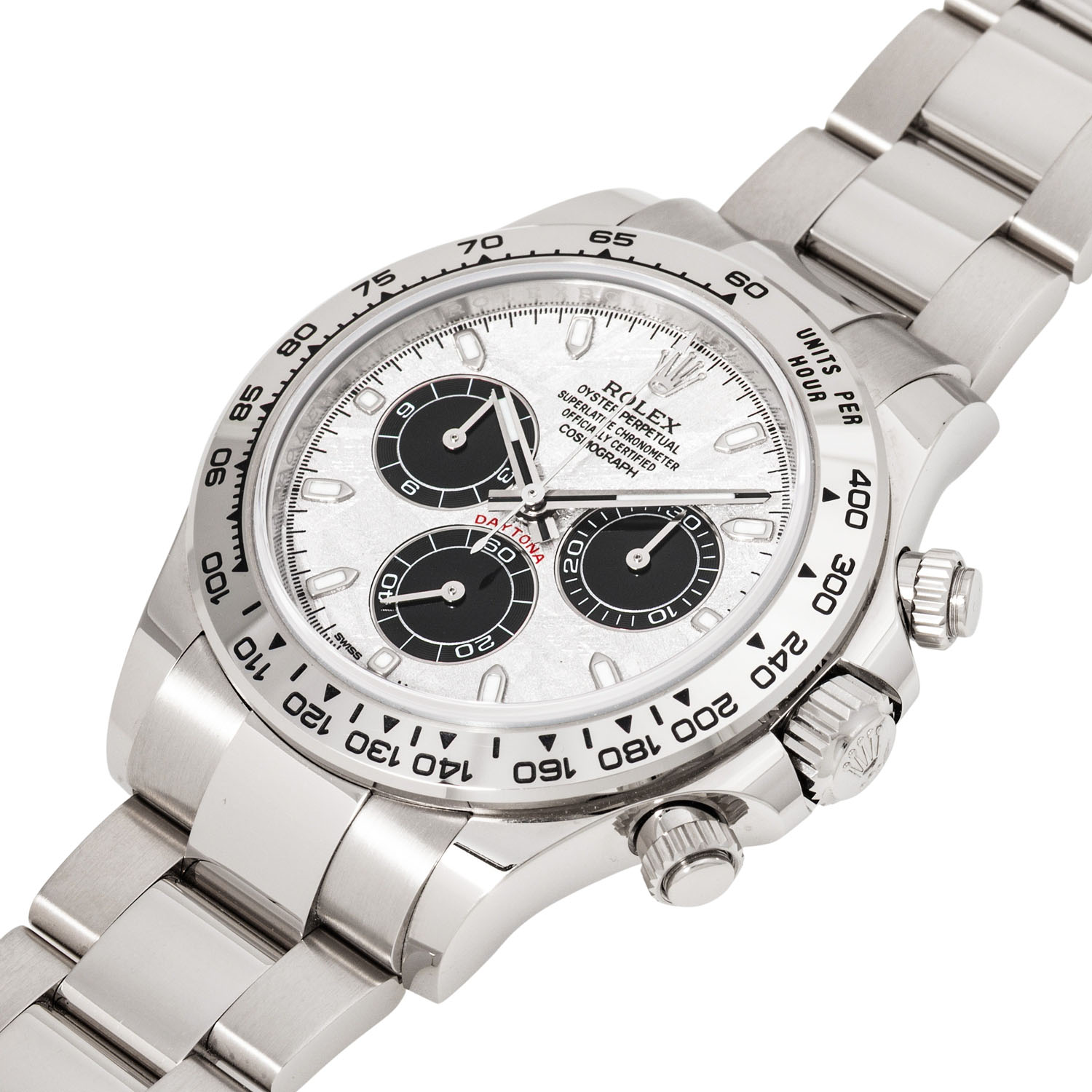 ROLEX Oyster Perpetual Cosmograph Daytona 'Meteorite' ref. 116509 men's wristwatch mint condition full set 2023. 18K white gold, serial no° 553WWXXX. Automatic movement cal. 4130 with very good working order (+3 s/d, 274° amplitude). Silver meteorite dial with white gold arrow indices, three black totalizers, white gold hands, center stop seconds and tachymeter bezel. 18K white gold Oyster bracelet with folding clasp and safety bar. Mint condition, unworn. Box and papers from 08/2023, first purchase invoice and hangtag enclosed. Diameter approx. 40 mm measured without crown. Suitable up to a wrist circumference of approx. 19,5 cm.