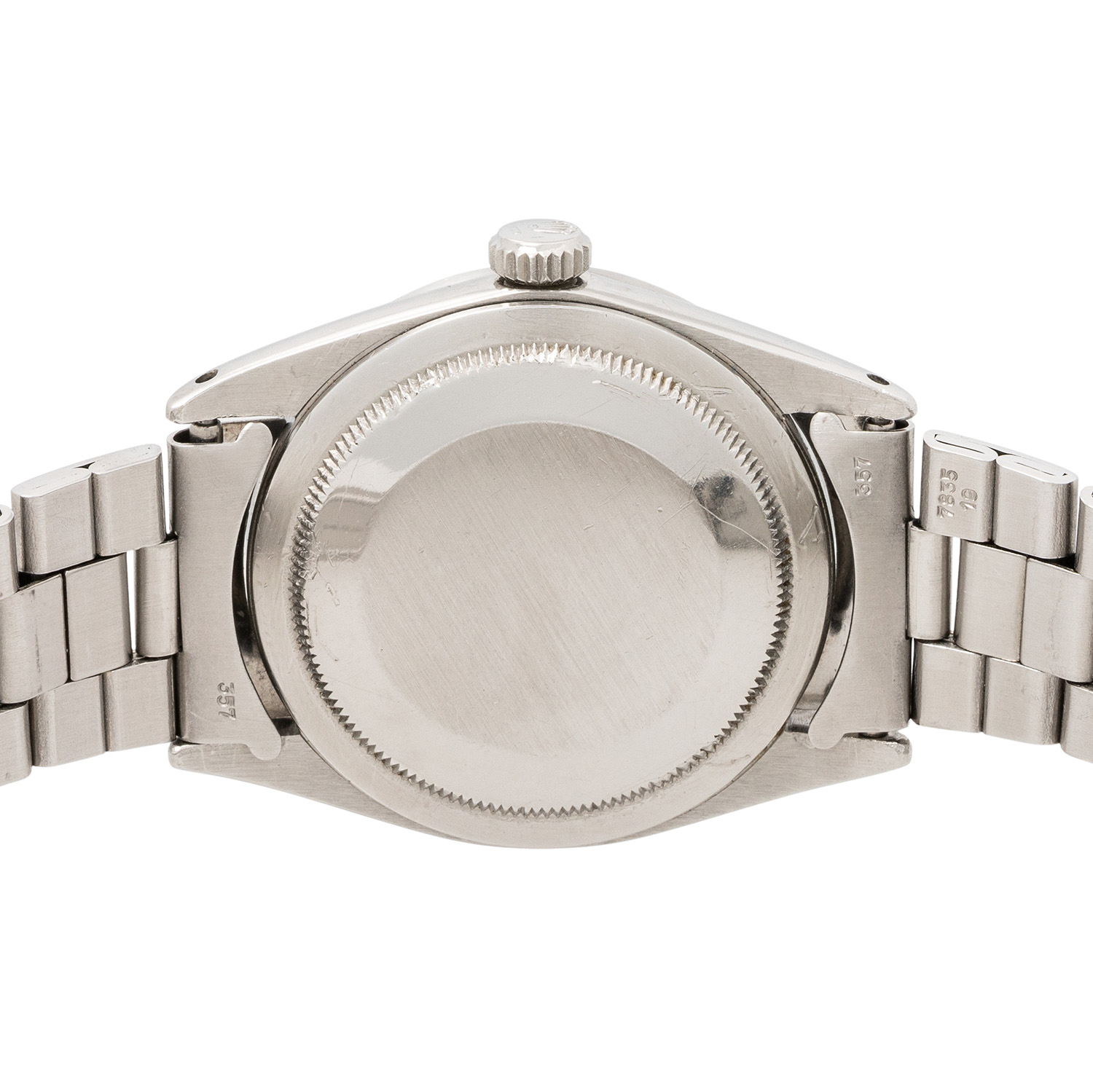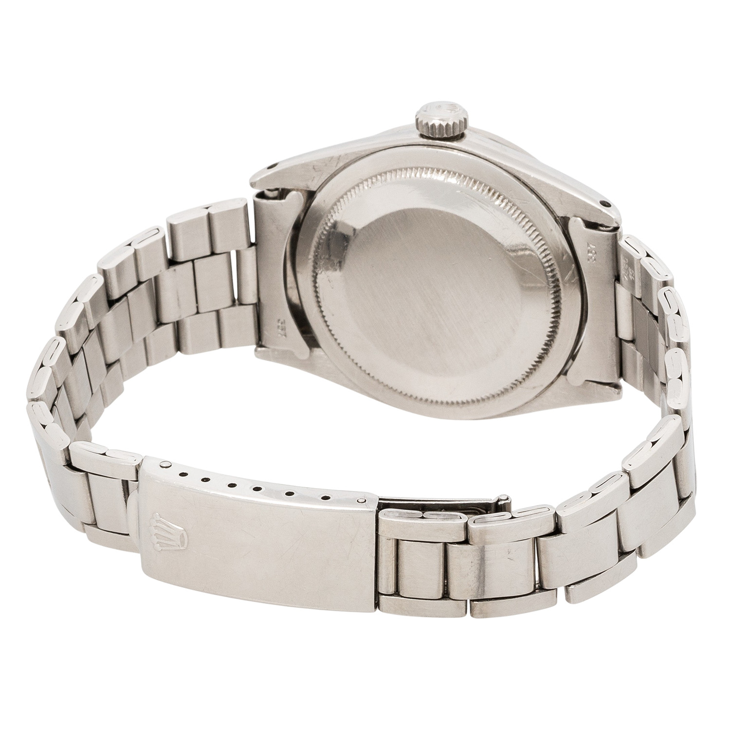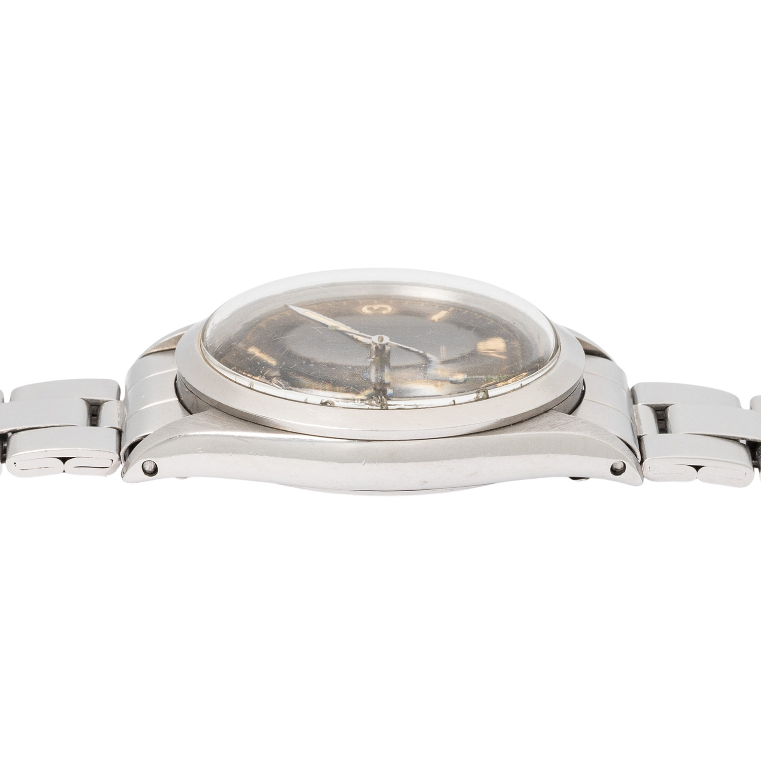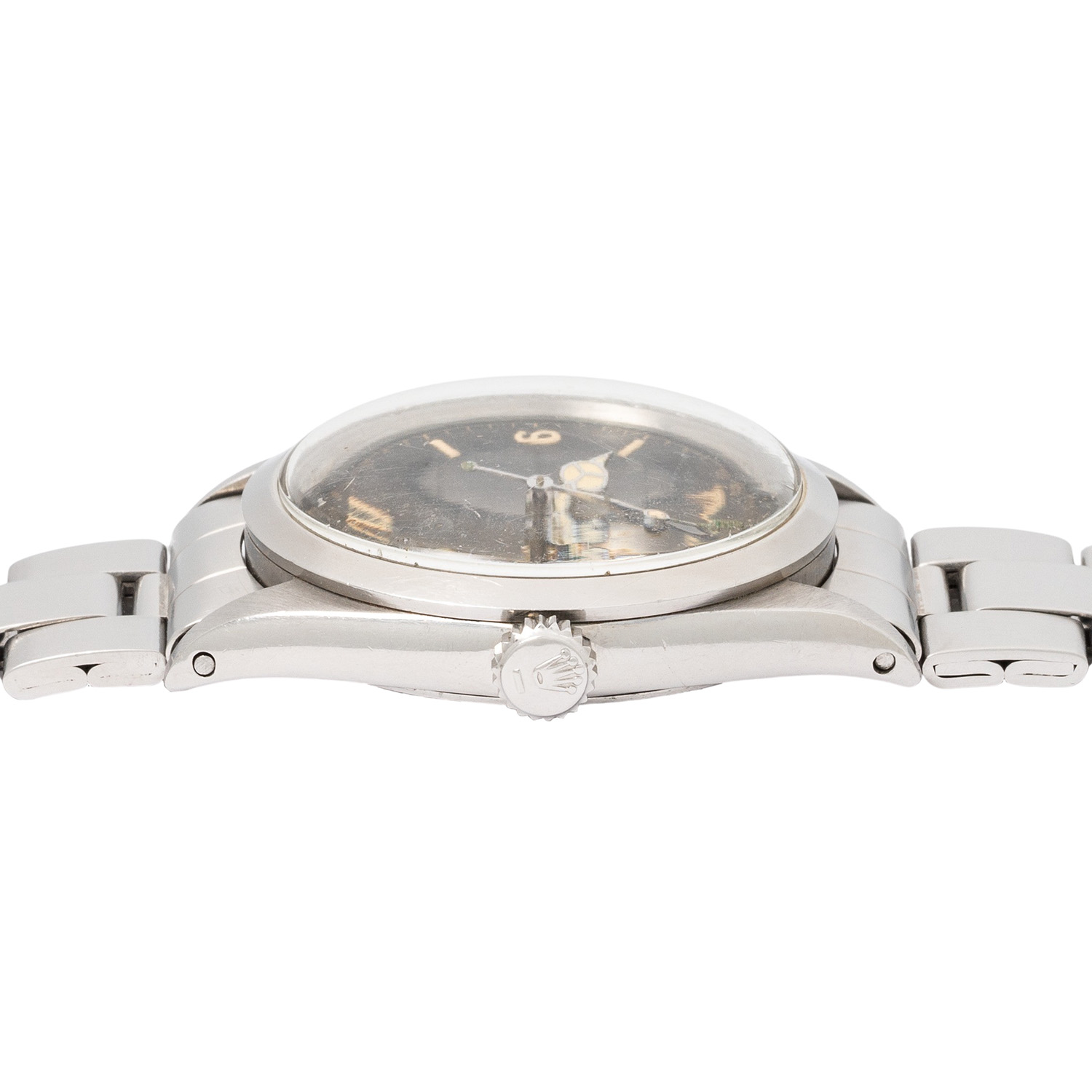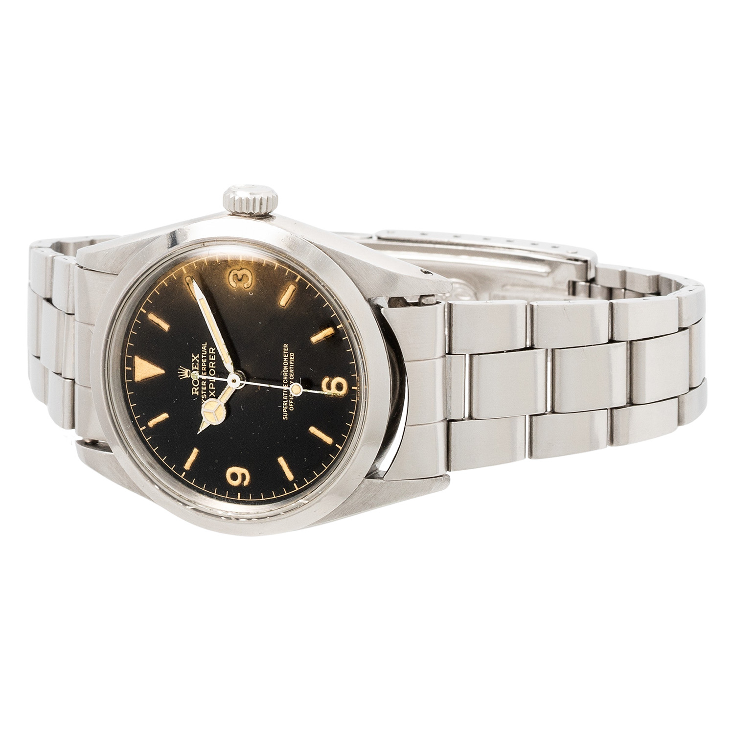 ROLEX rare Oyster Perpetual Explorer I 'Tropical Gilt Underline' Man's watch, ref. 1016. Approx. 1963. Stainless steel, case number 901513, caseback signed on the inside 'II.63'. Automatic movement cal. 1560, very good working order (+7s/d, 263°). Black Tritium dial with chapterring, gilt print and silver Underline below the printing 'Superlative Chronometer Officially Certified', Tritium hands. Rolex bracelet ref. 7835 with folding clasp in stainless steel, end links 357, made for another Rolex model with 19mm lugs. Visible signs of wear on case and bracelet, caseback with signs from openeing, dial with nice patina, light scratches and cracks on the dial surface. Diameter approx. 36mm without crown, suitable for a wrist size of approx. 19.5cm.