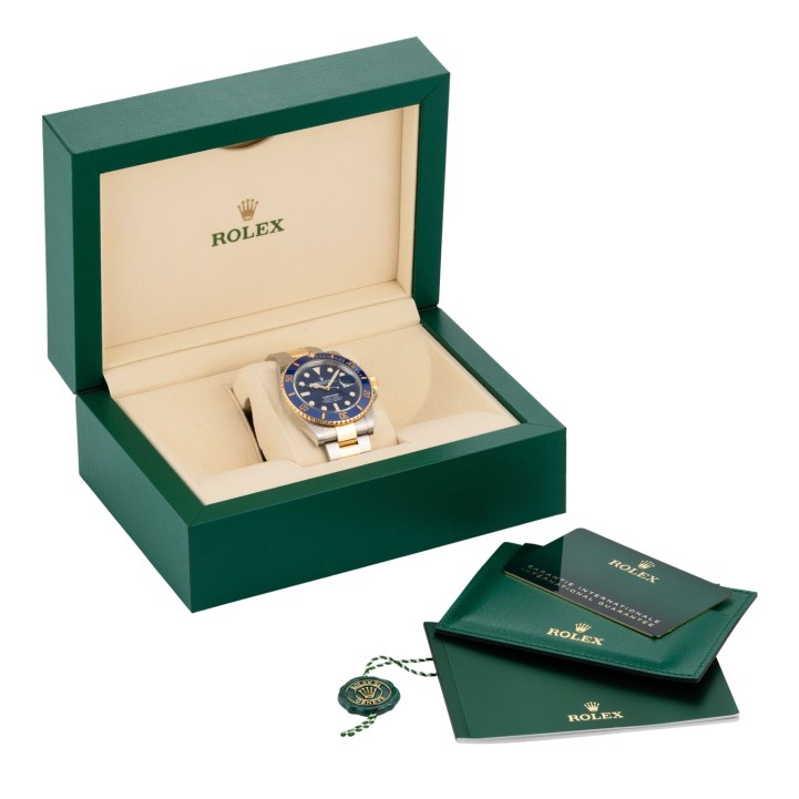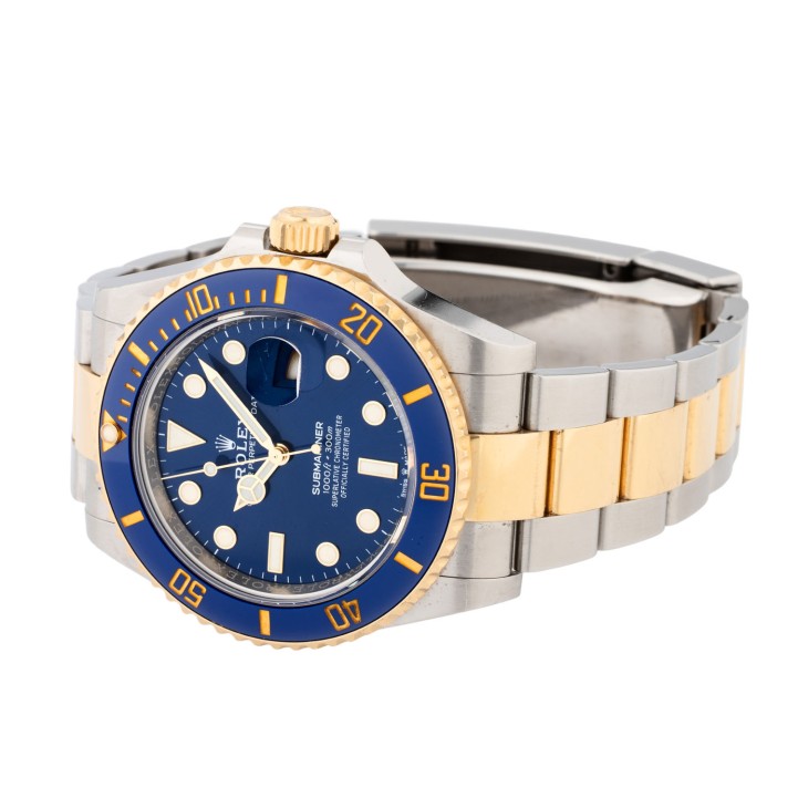 ROLEX Submariner Ref 126613LB 'Bluesy' men's watch from 2021. Box and papers. Stainless steel / 18K yellow gold. Serial number 871C6917. Automatic movement cal. 3235 with good performance (+1 s/d. 253° amplitude). Blue dial with applied indices and date display. Rolex Oyster bracelet in stainless steel / 18K yellow gold. Used, visible signs of wear on the case and bracelet. Original box, hang tag, instructions, card folder, warranty booklet and warranty card from purchase in January 2021 enclosed. . Diameter approx. 41 mm (measured without crown). Suitable for wrist sizes up to approx. 20 cm.