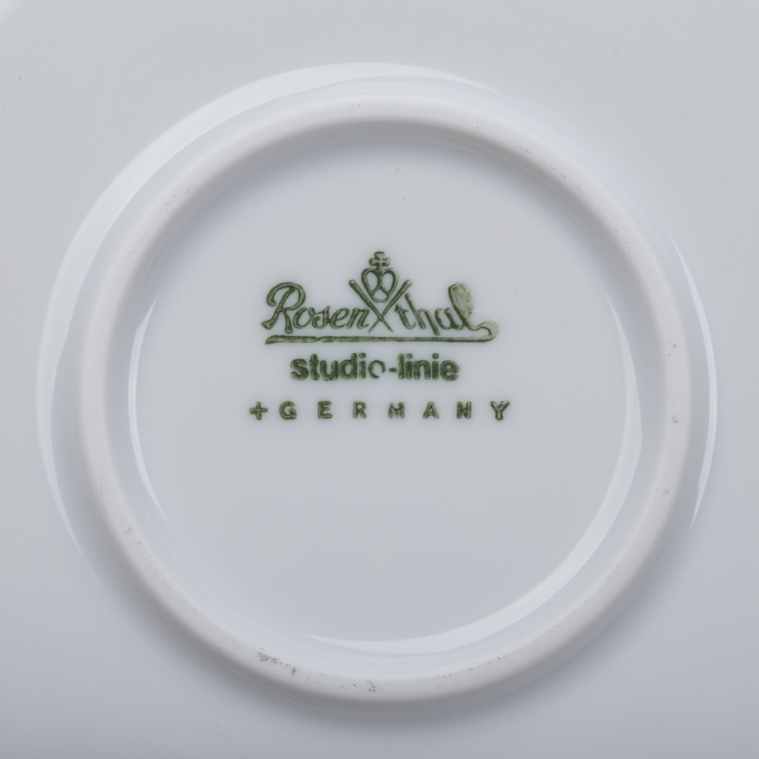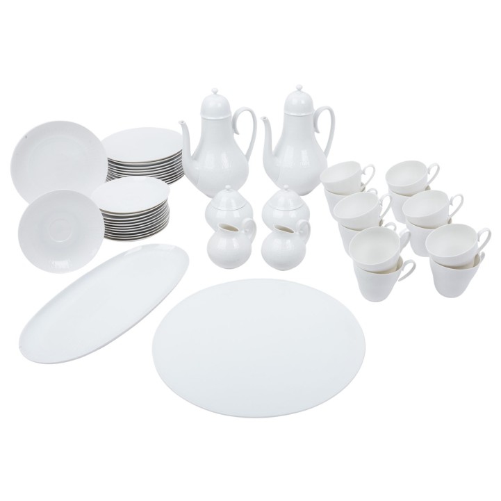 ROSENTHAL coffee service for 12 people 'Romanze white', second choice, 20th century. 12 coffee cups (1 cup damaged), 12 saucers, 12 cake plates, 2 coffee pots, 2 sugar bowls, 2 cream jugs, 1 cake stand and 1 oval platter, 44 pieces in total. Signs of age and use.