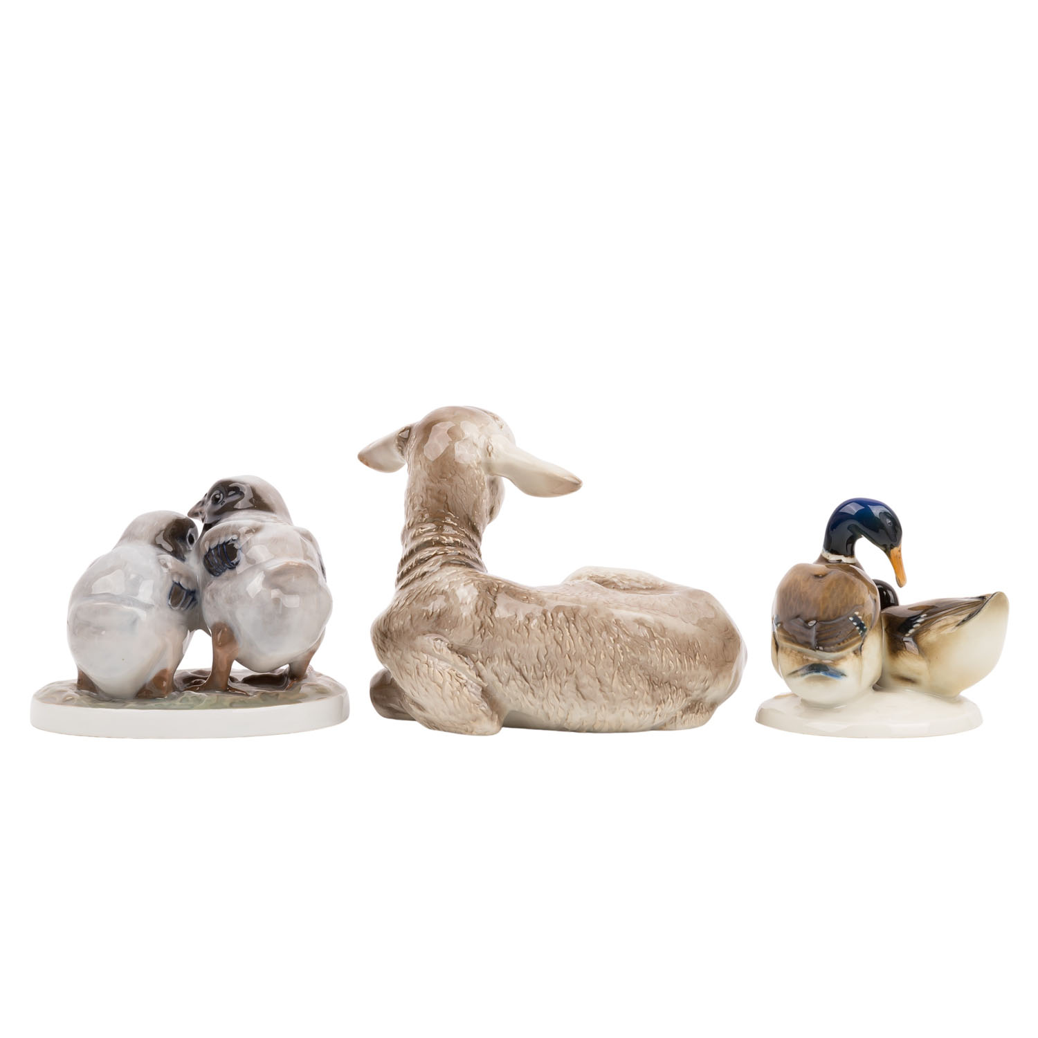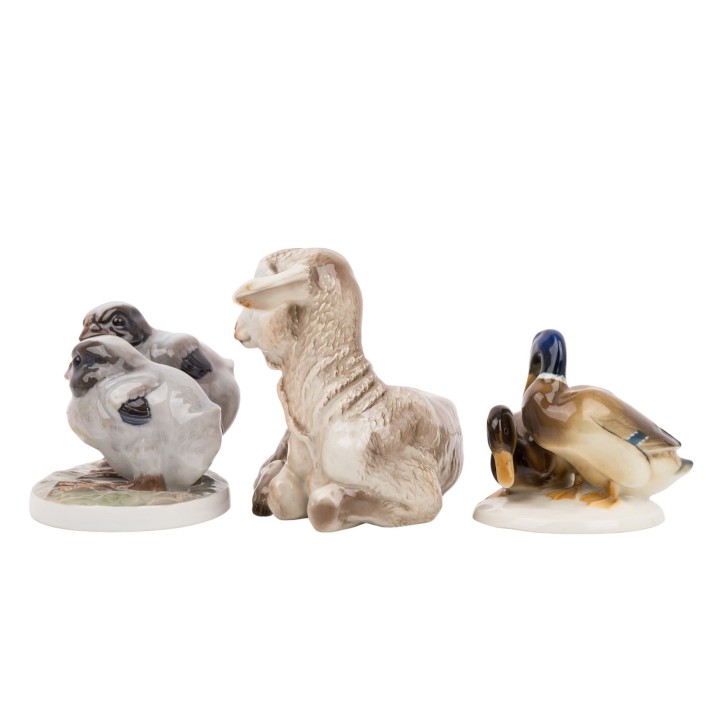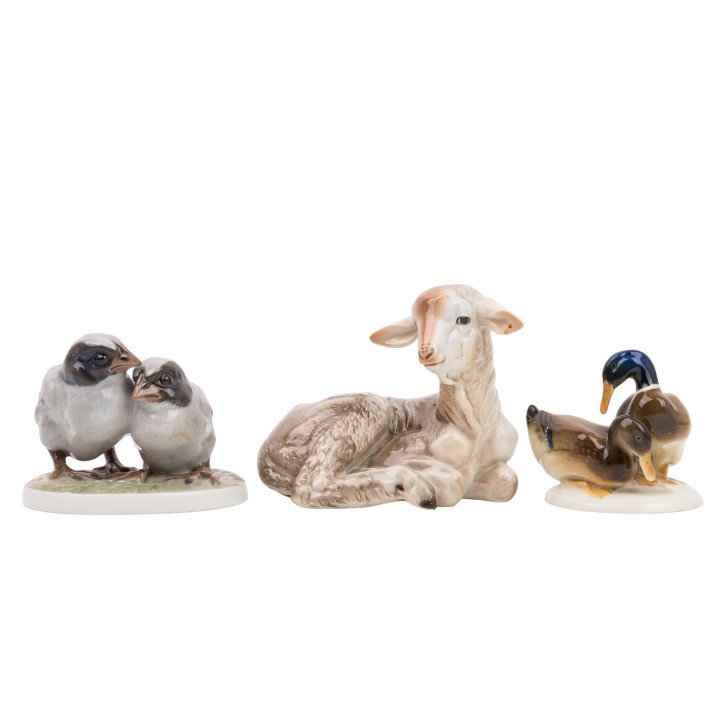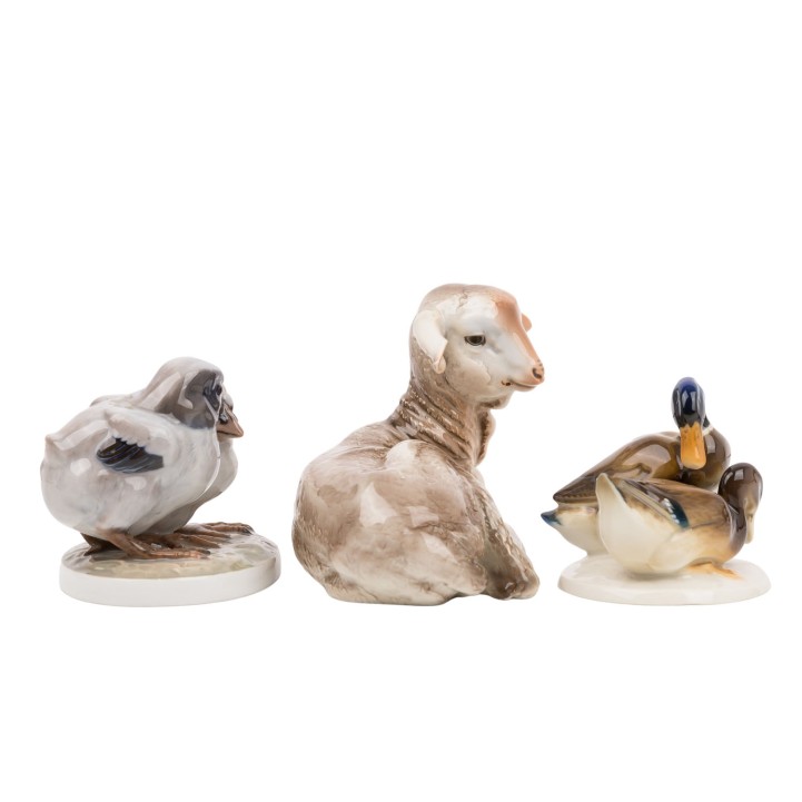 ROSENTHAL/HUTSCHENREUTHER 3 animal figurines, 20th century. ROSENTHAL: ‘Reclining Lamb’, design by Theodor Kärner, model no. 196, mark from 1928, h. approx. 10 cm and ‘Pair of Chicks’, design by Hulda Krebs-Himmelstoss, model no. K 478, mark from approx. 1920, h. approx. 8; HUTSCHENREUTHER ‘Pair of Ducks’, design by Karl Tutter, h. approx. 7.