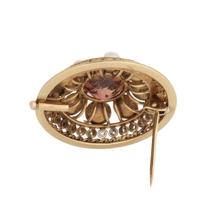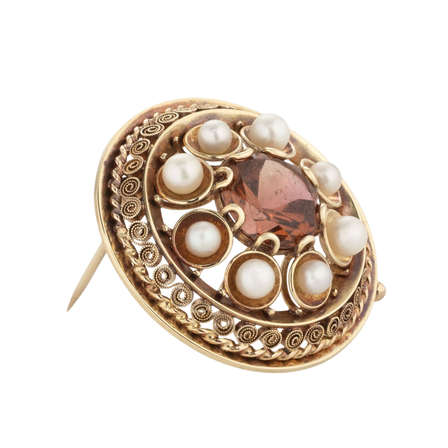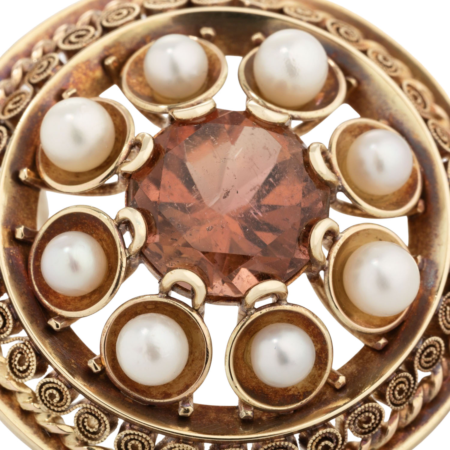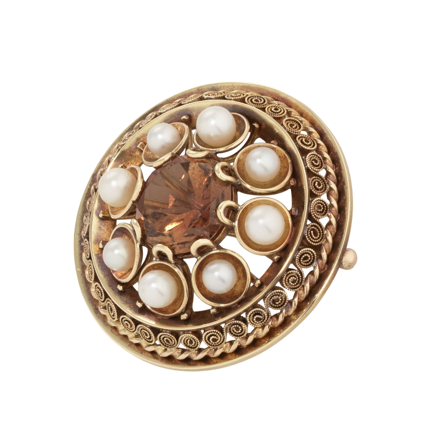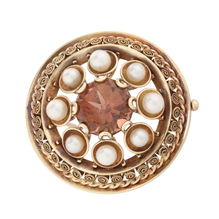 Brooch with round faceted tourmaline, cognac colour surrounded by 8 cultured pearls and fine decorative details, 14K yellow gold, 11.4 g, D: 3.2 cm, mid of 20th century, minor signs of wear, nice craftsmanship.