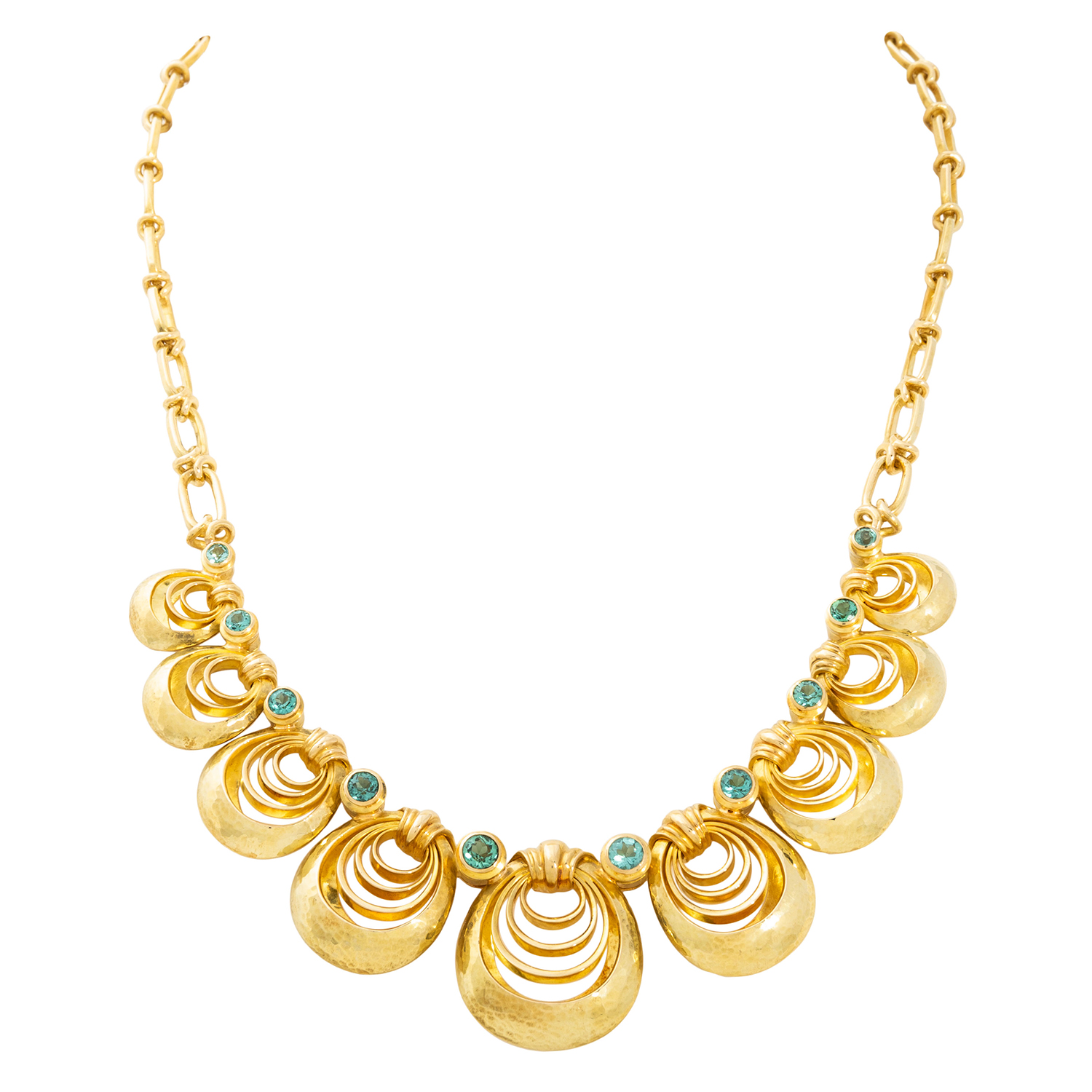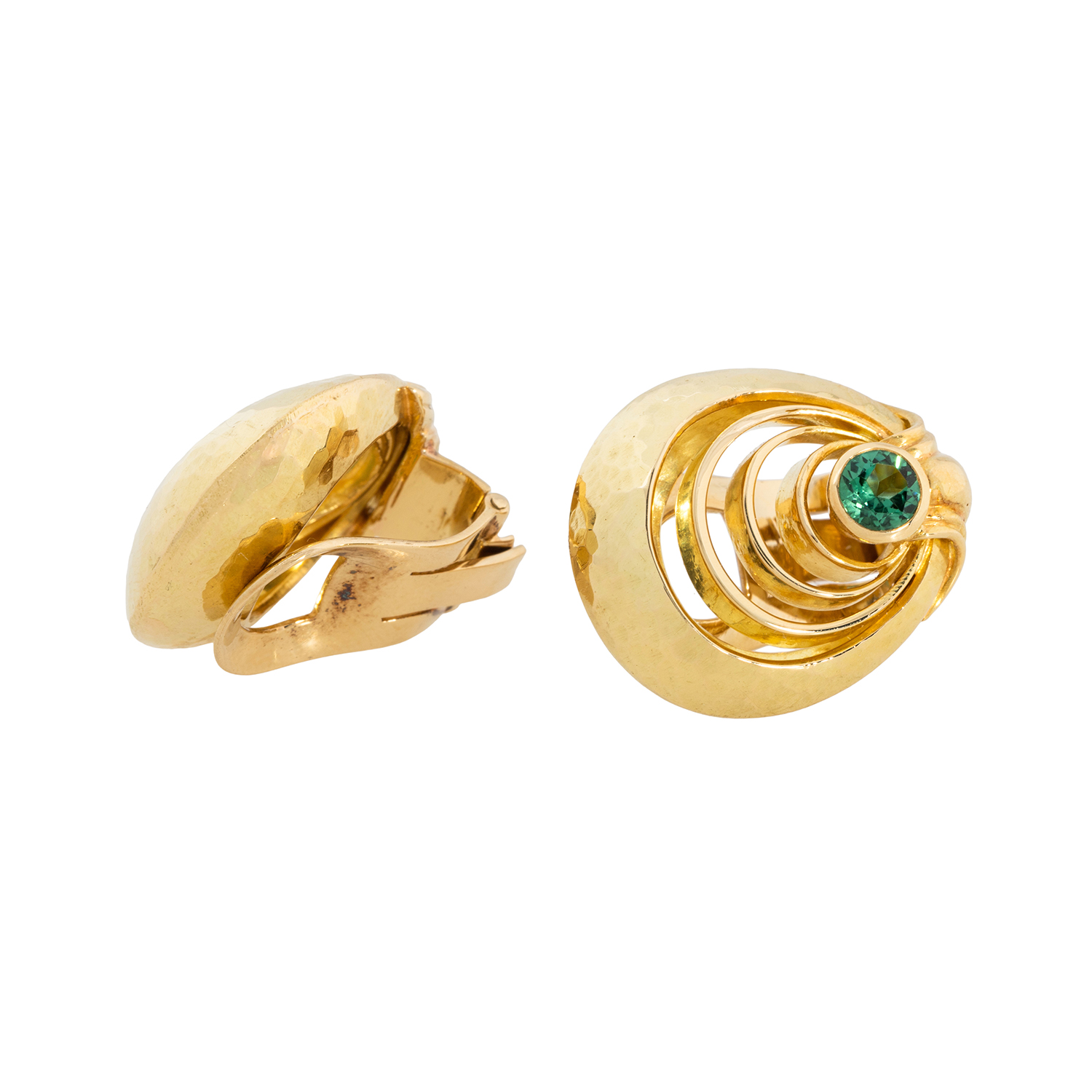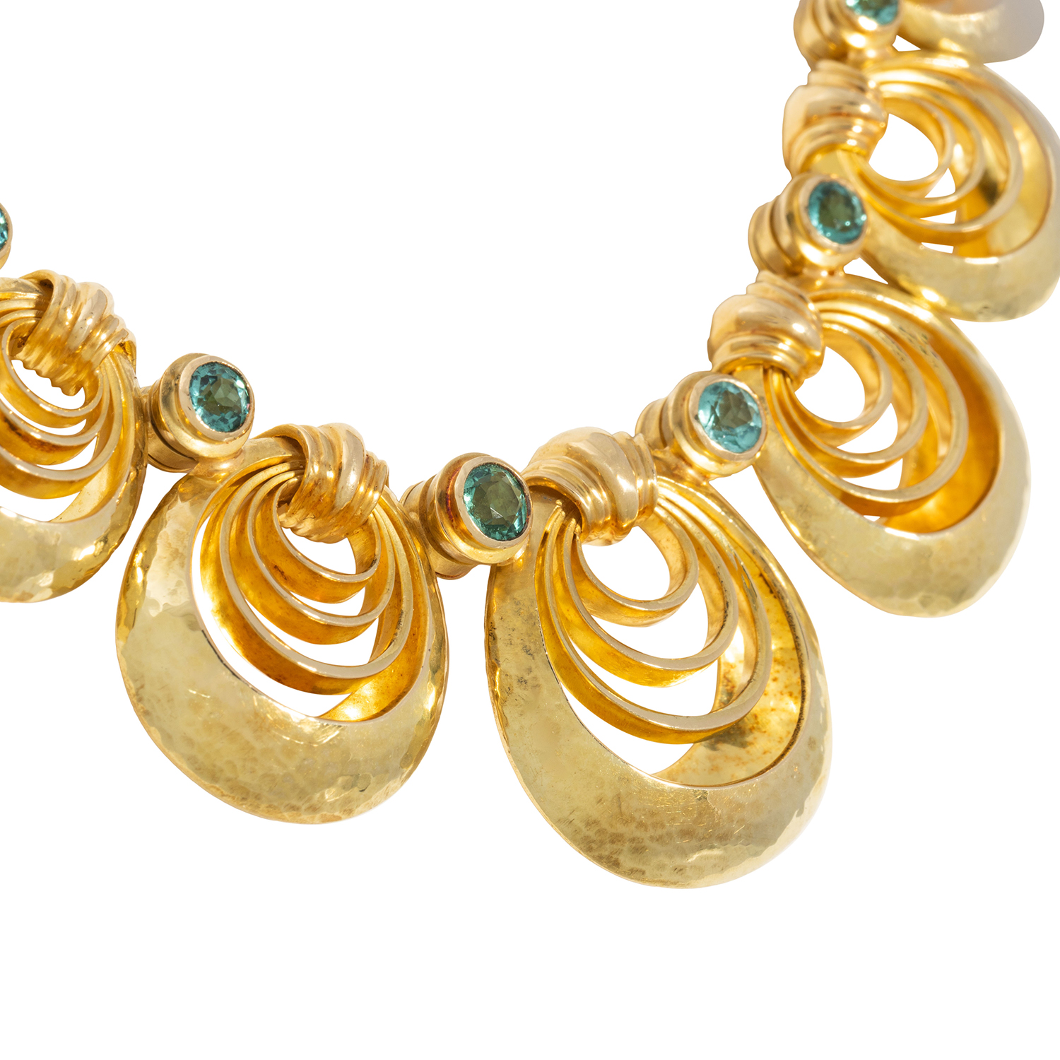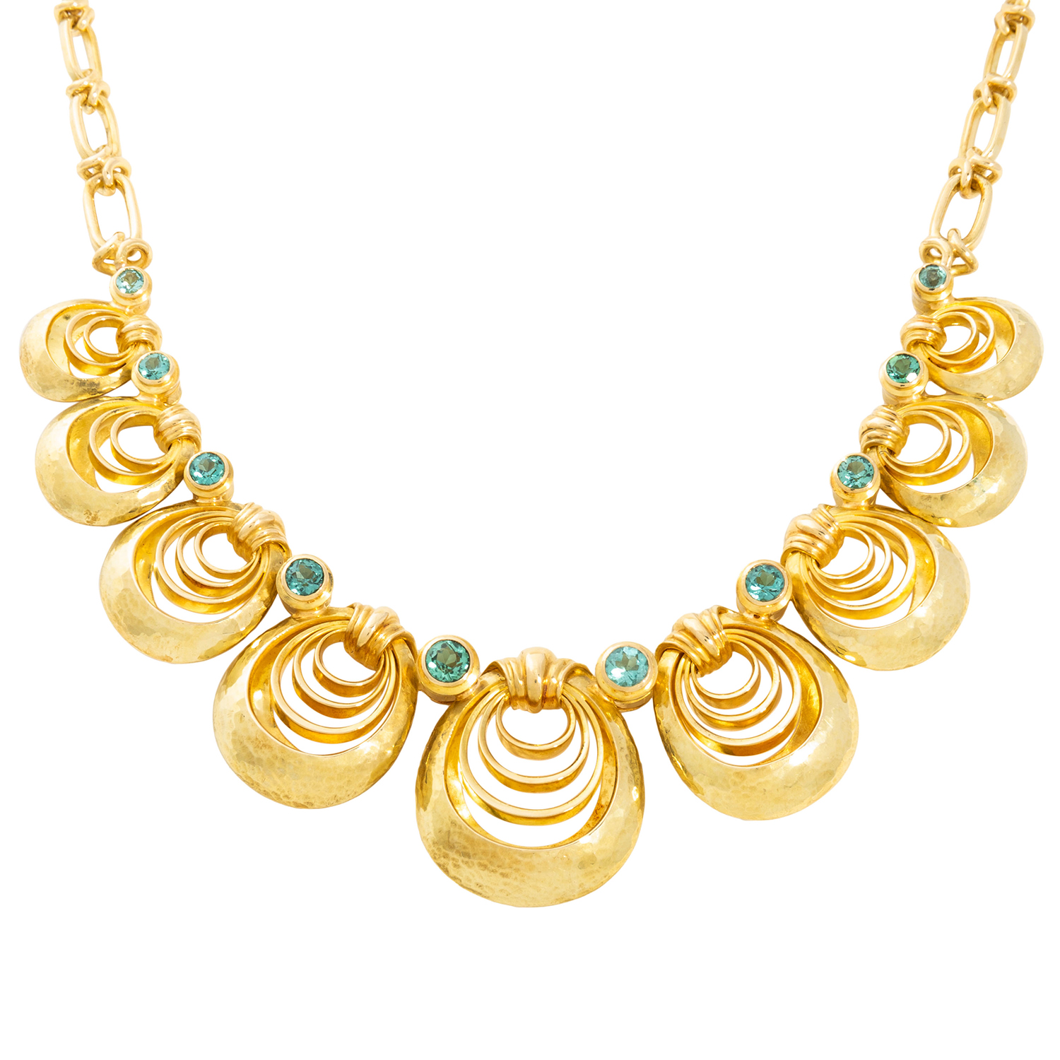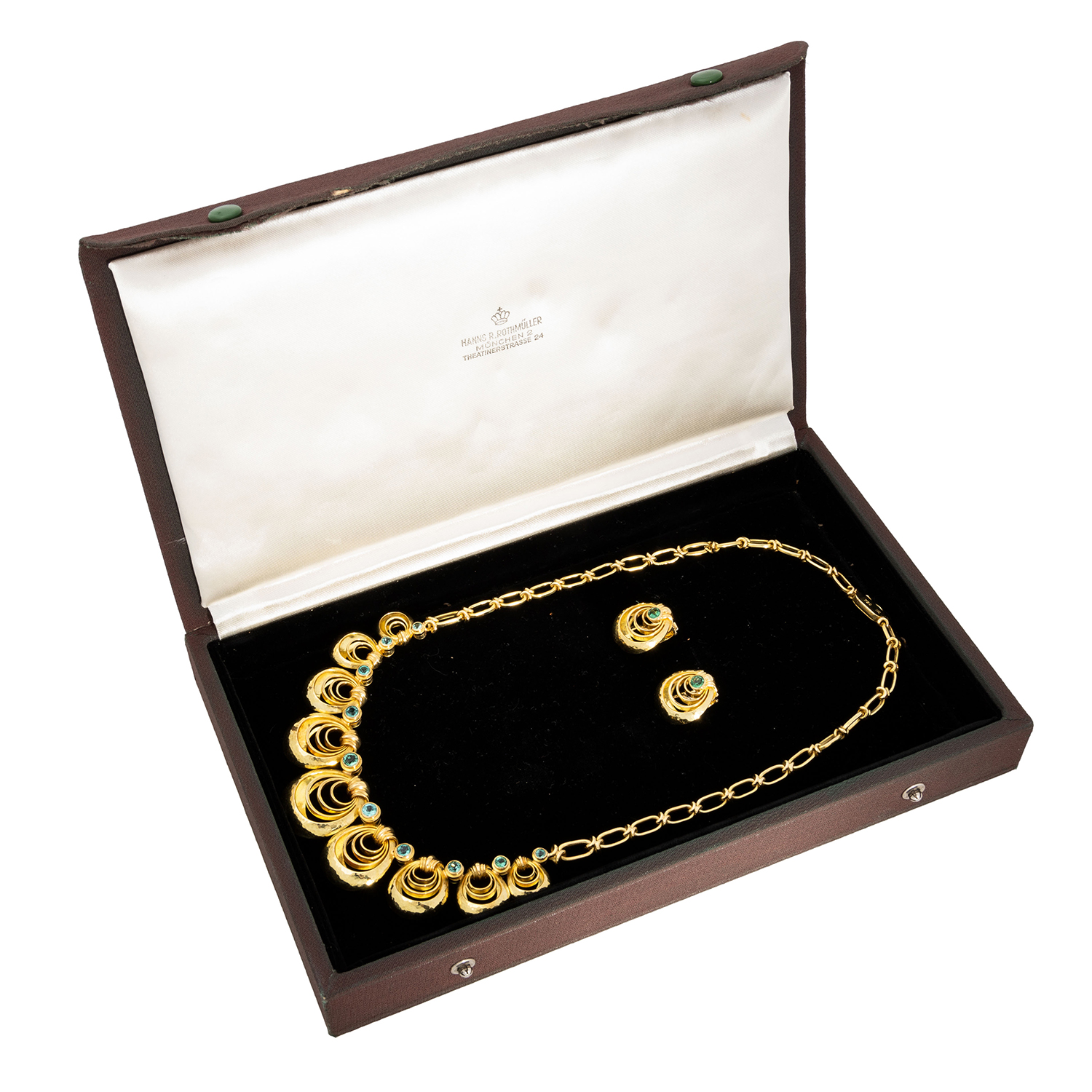 ROTHMÜLLER Demi-Parure with round faceted green tourmalines graduating in size, fine quality, 18K yellow gold, 105.6 g, consisting of necklace, L: 44 cm and earclips, handchased, elaborately decorated, movable mounted parts graduating in size with handcrafted chain and clasp, 2nd half of 20th century, very good condition, marked Hanns Rothmüller, München, including original case.
