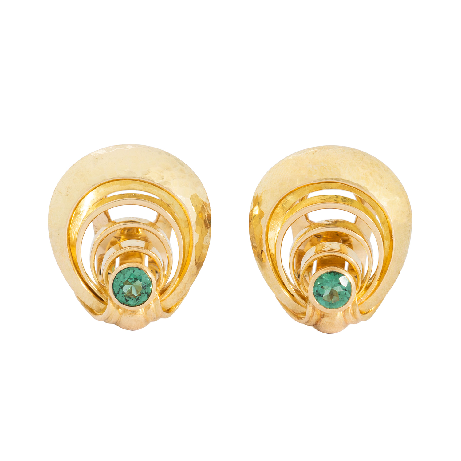 Pair of stud earrings with 2 green oval tourmaline cabochons,
