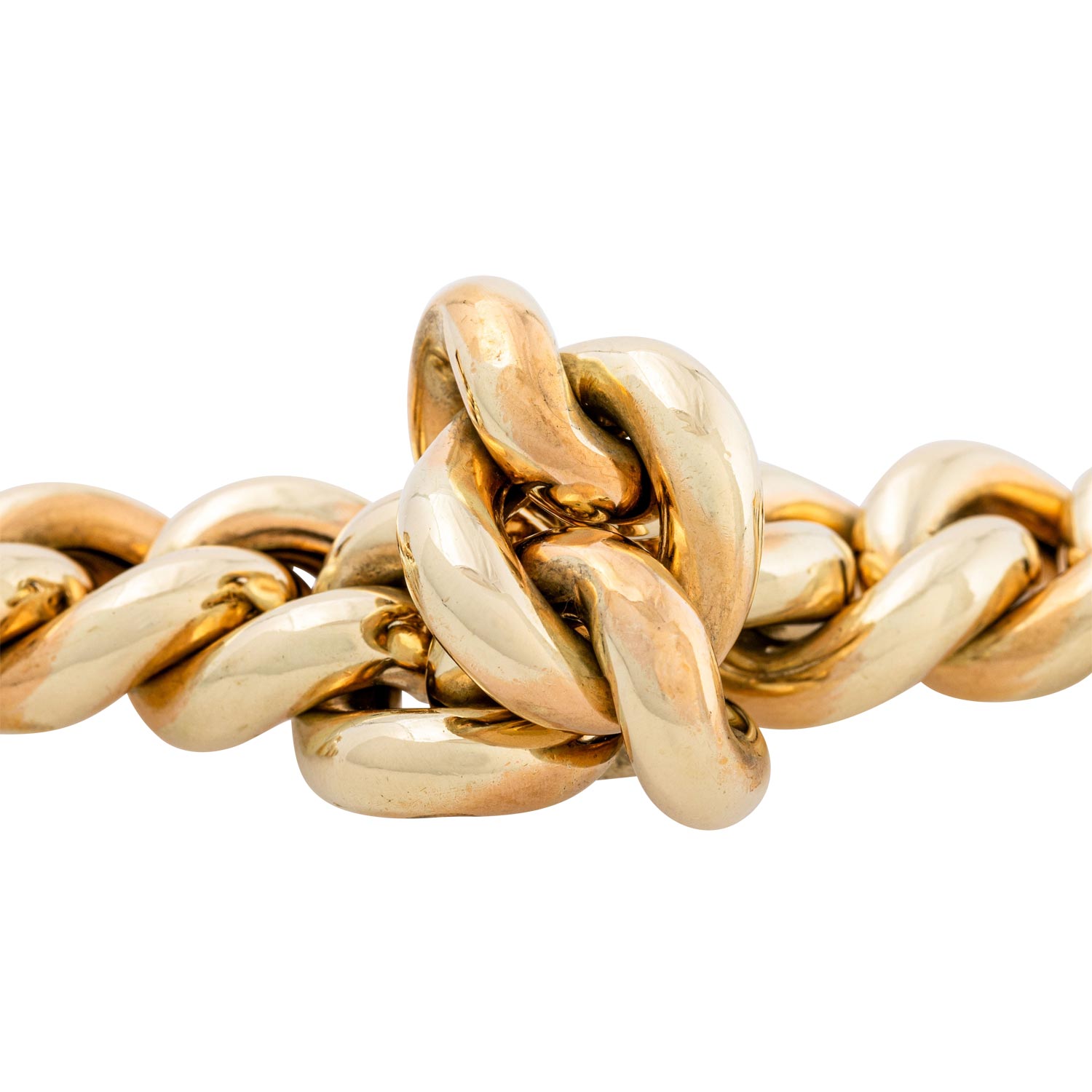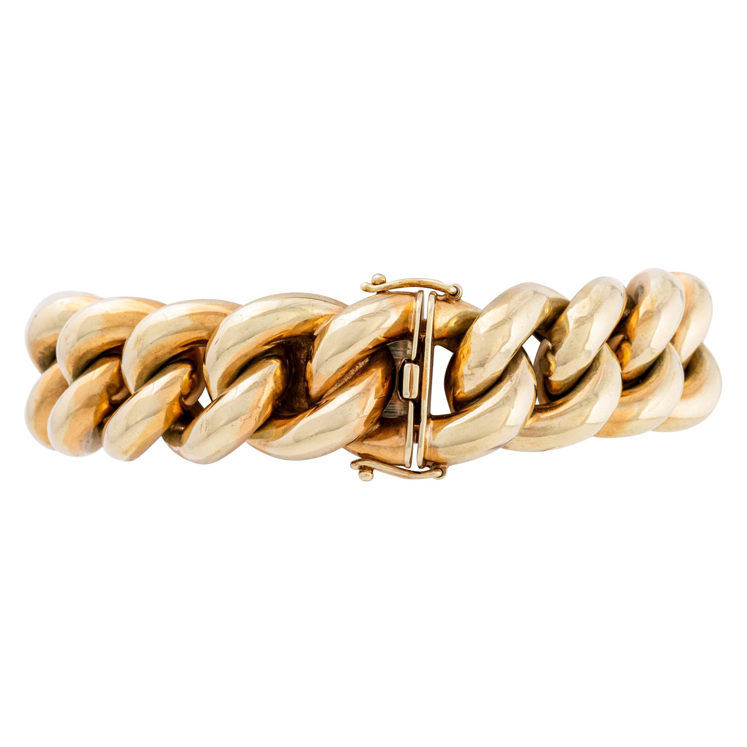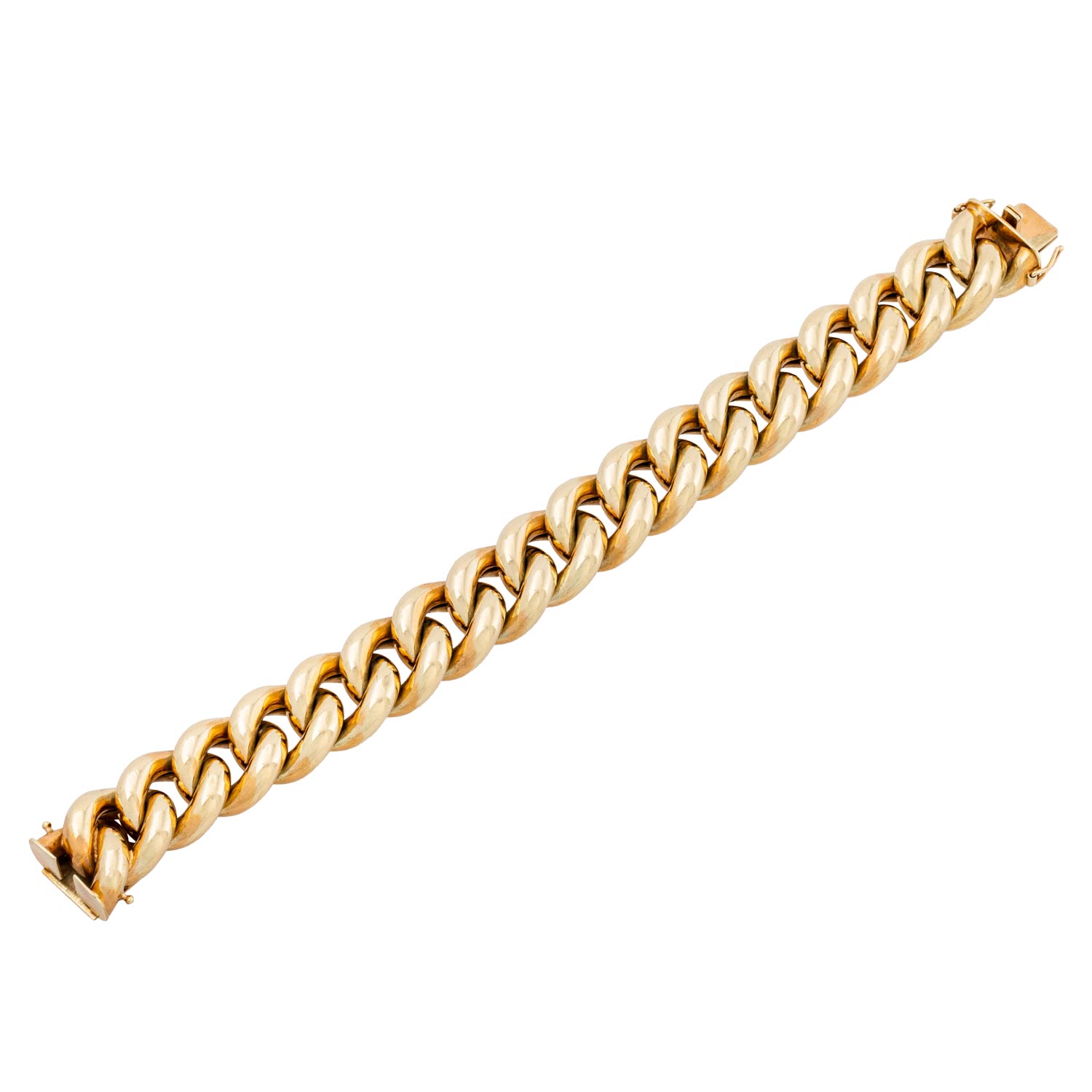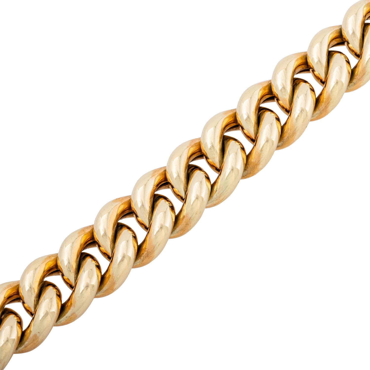 Bracelet, hollow round curb links, 14K yellow gold, 63.8 g, L: 20 cm, W: 17.5 mm, box clasp with security catch, late 20th century, minor signs of wear.