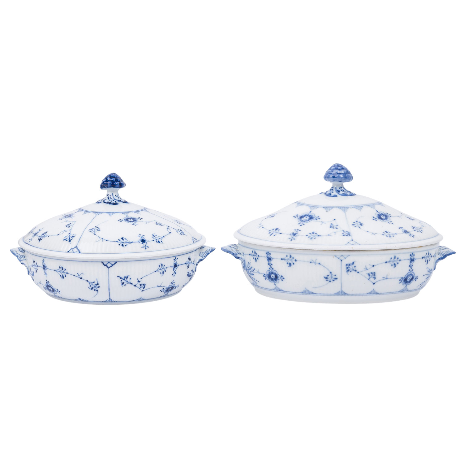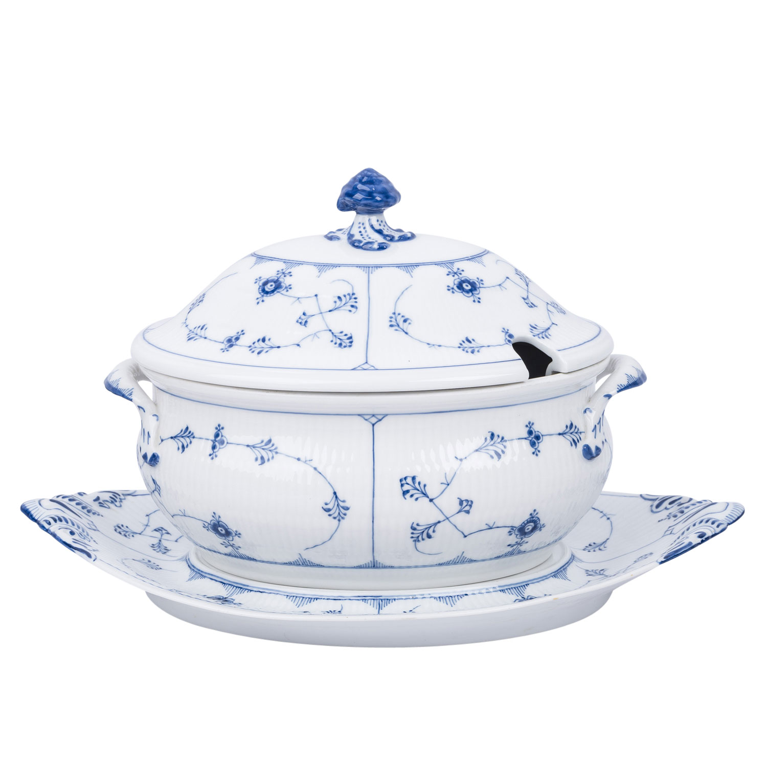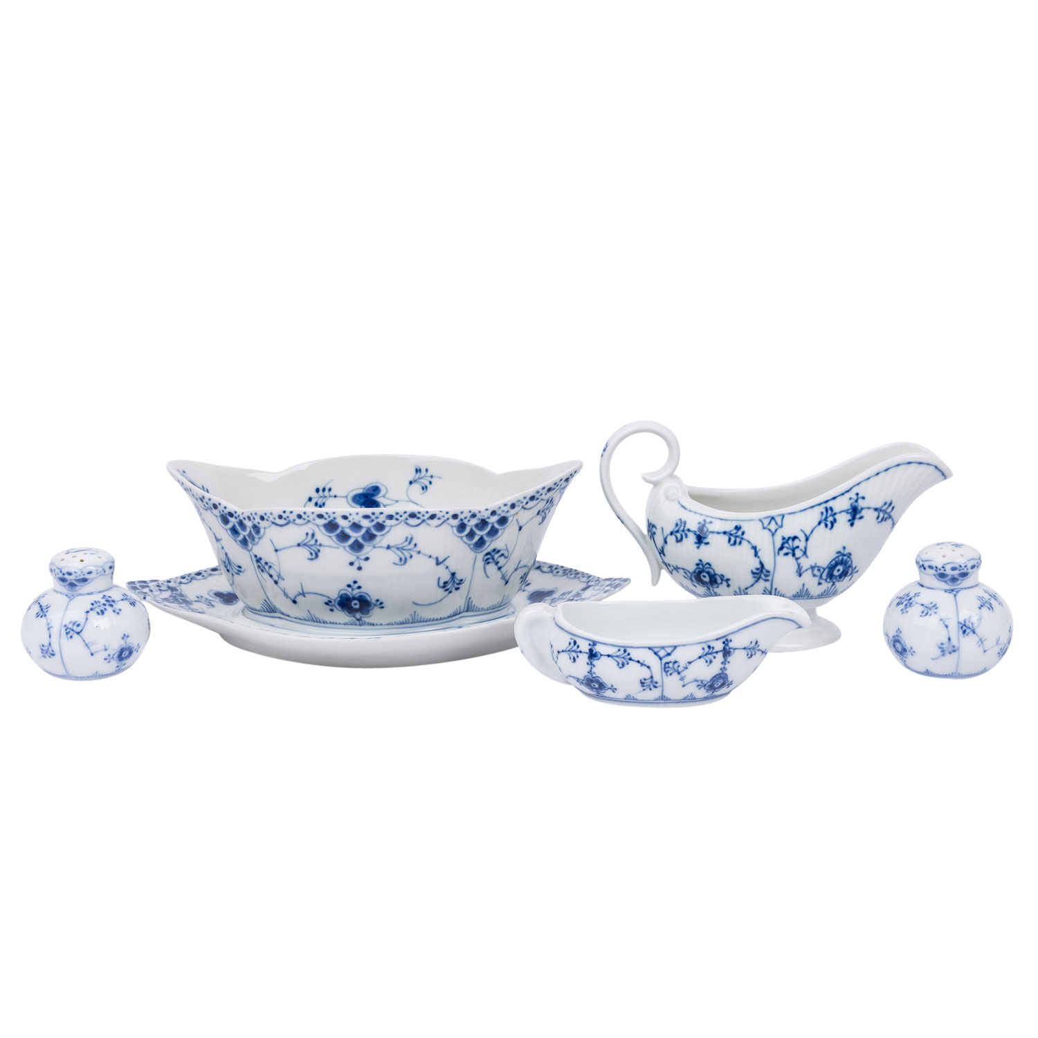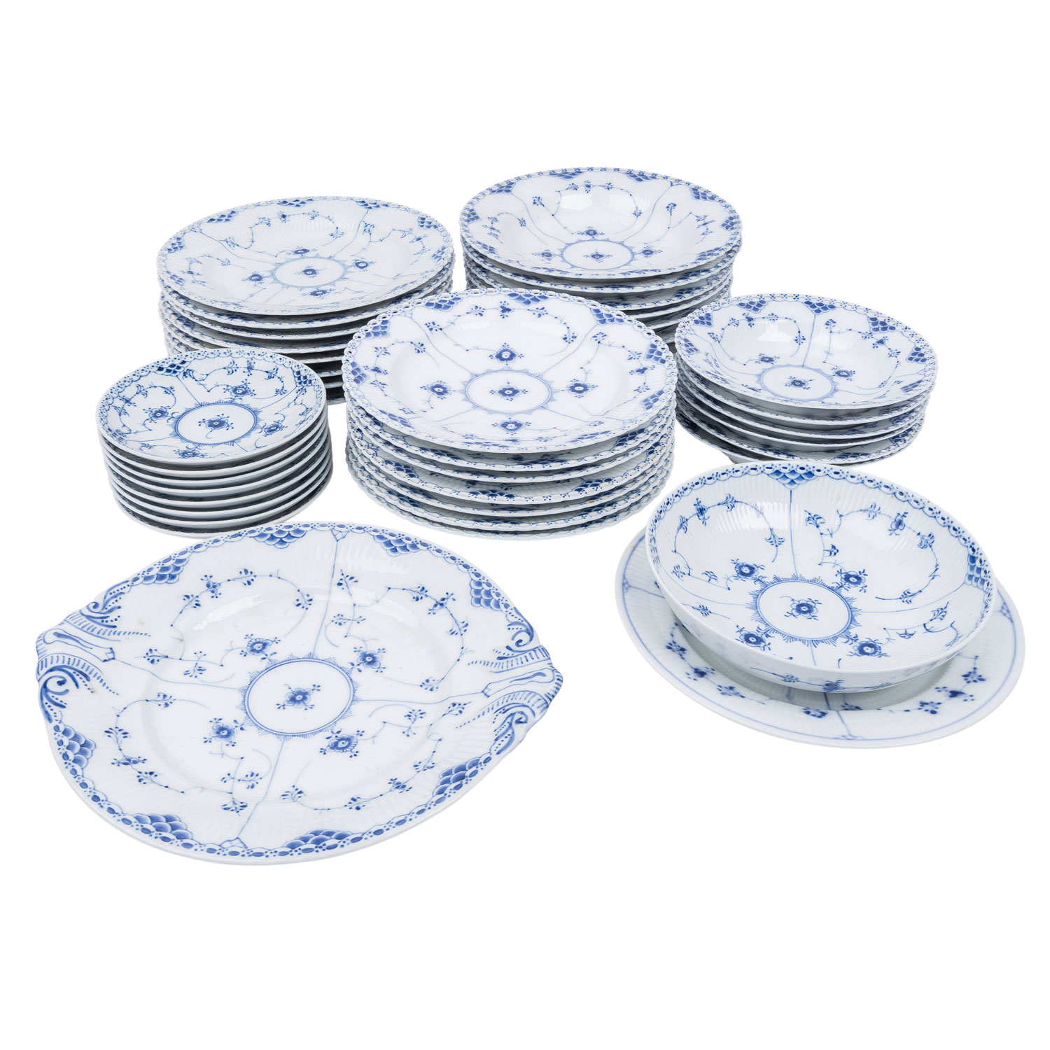 ROYAL COPENHAGEN extensive dinner service 'Musselmalet', full lace, half lace and ribbed, 1st and 2nd choice, 19th/20th century. 63 pieces: 8 half lace soup bowls with lids (764), matching 8 saucers (764), 6 small full lace soup plates (1170, 1 with chip), 7 full lace soup plates (1078), 15 full lace dinner plates (1084, 3x 2nd choice) , 1 ribbed dinner plate (diameter approx. 25 cm), 1 half lace gravy boat (587, 2nd choice), 2 different small ribbed gravy boats (308 and 2039), 1 large ribbed oval lidded tureen (215), plus 1 matching ribbed oval plate ( 218), 1 flat oval lidded terrine ribbed (283), 1 large bowl ribbed (451), 1 bowl half lace (512, 2nd choice), 1 round lidded tureen ribbed (277, 2nd choice), 1 round plate half lace (666), 1 salt shaker and 1 pepper shaker half lace (711), 2 single-flame candle holders full lace with drip catcher (502), 2 vases full lace (1015), 1 rectangular bowl full lace (1143) and 1 square bowl half lace (708, 2nd choice). Slight signs of age and use.