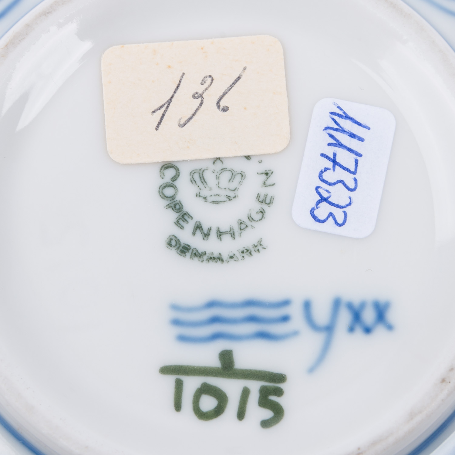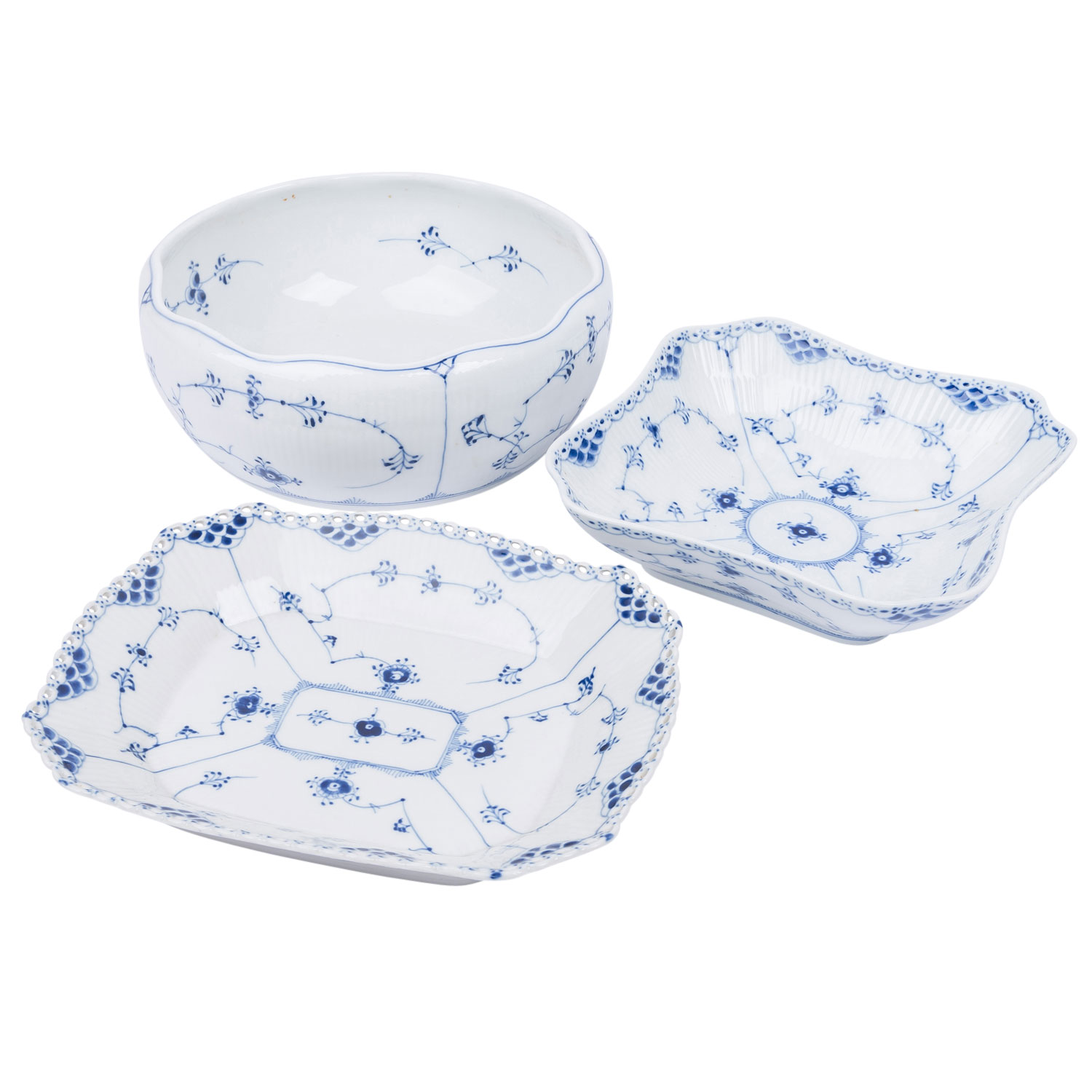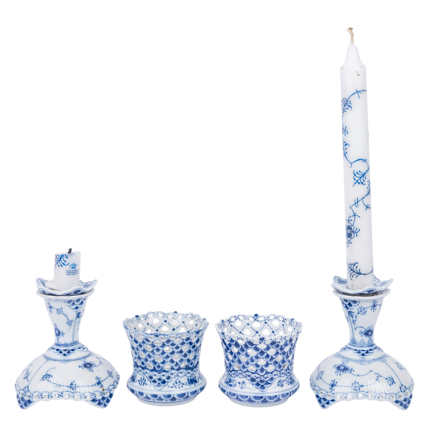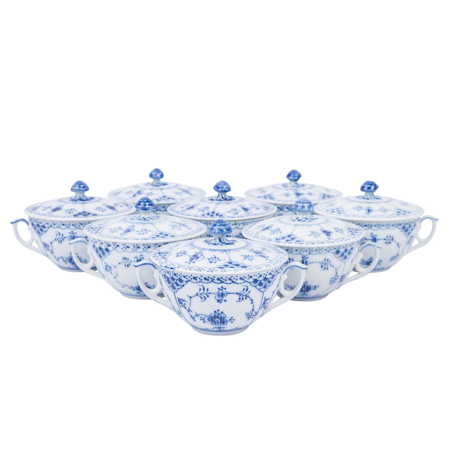 ROYAL COPENHAGEN extensive dinner service 'Musselmalet', full lace, half lace and ribbed, 1st and 2nd choice, 19th/20th century. 63 pieces: 8 half lace soup bowls with lids (764), matching 8 saucers (764), 6 small full lace soup plates (1170, 1 with chip), 7 full lace soup plates (1078), 15 full lace dinner plates (1084, 3x 2nd choice) , 1 ribbed dinner plate (diameter approx. 25 cm), 1 half lace gravy boat (587, 2nd choice), 2 different small ribbed gravy boats (308 and 2039), 1 large ribbed oval lidded tureen (215), plus 1 matching ribbed oval plate ( 218), 1 flat oval lidded terrine ribbed (283), 1 large bowl ribbed (451), 1 bowl half lace (512, 2nd choice), 1 round lidded tureen ribbed (277, 2nd choice), 1 round plate half lace (666), 1 salt shaker and 1 pepper shaker half lace (711), 2 single-flame candle holders full lace with drip catcher (502), 2 vases full lace (1015), 1 rectangular bowl full lace (1143) and 1 square bowl half lace (708, 2nd choice). Slight signs of age and use.