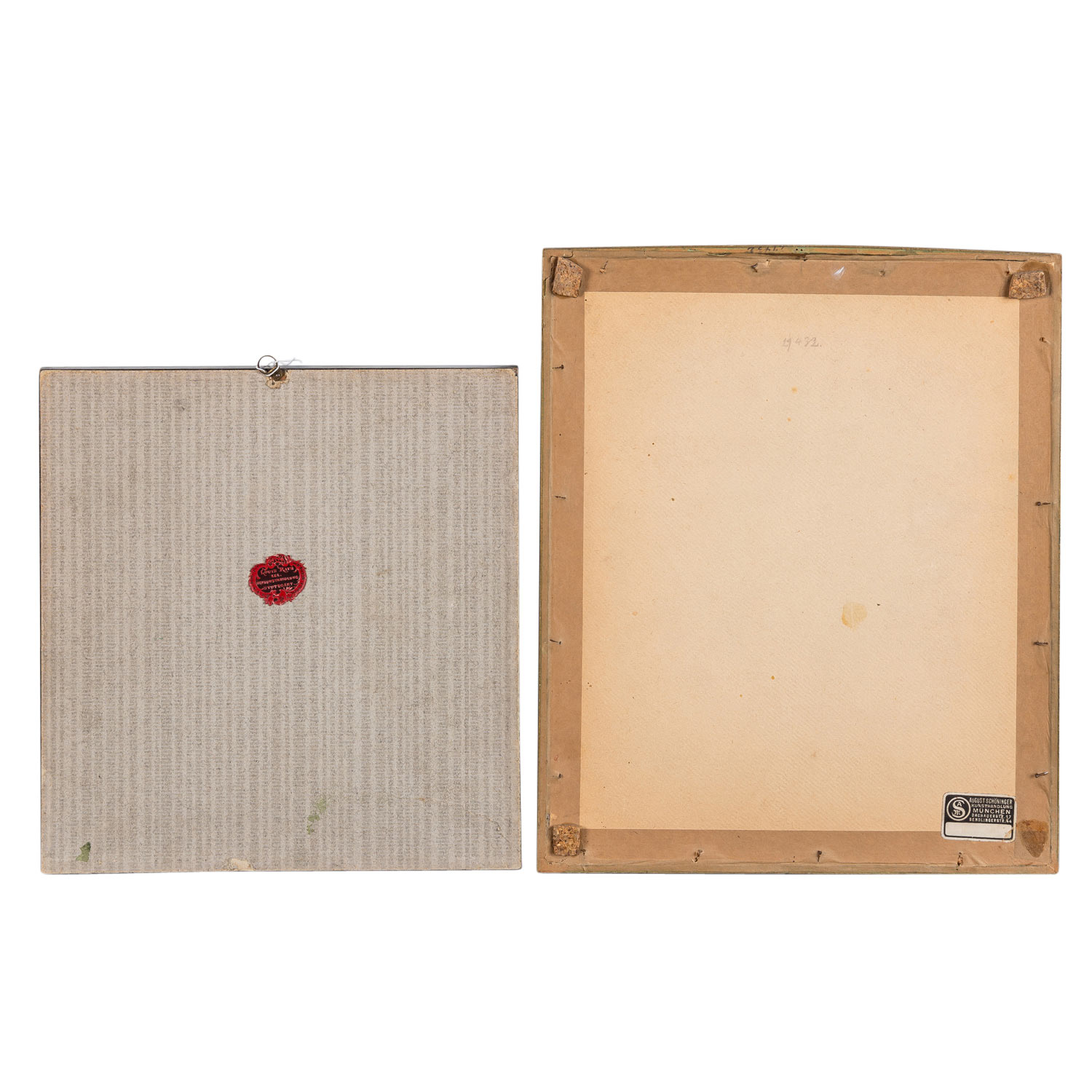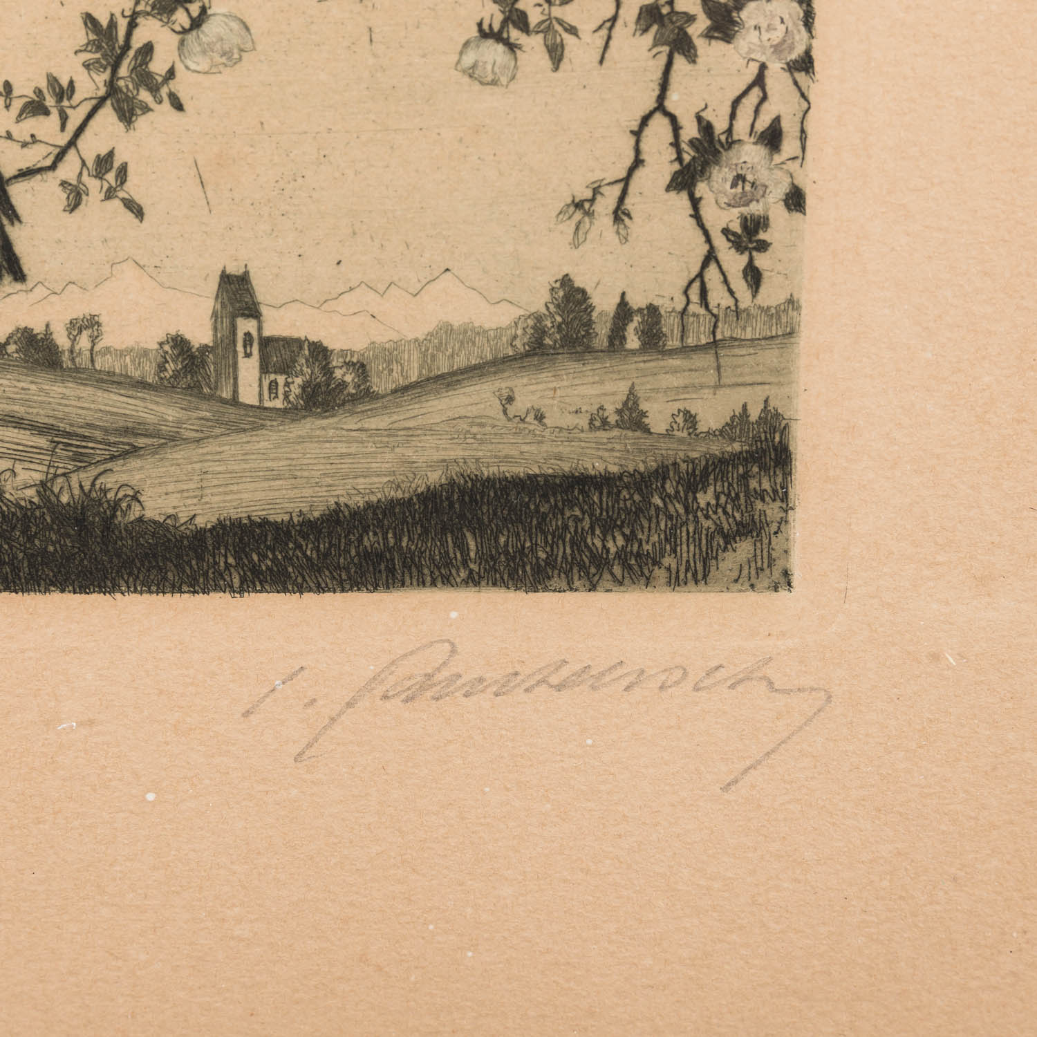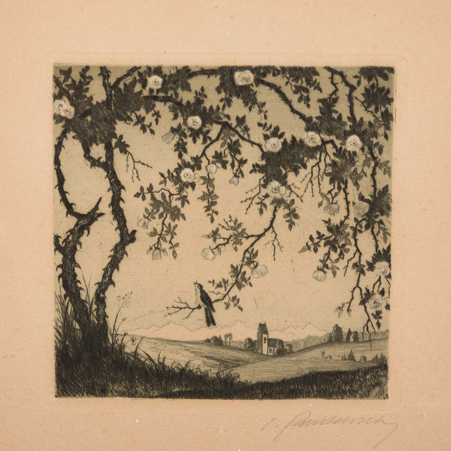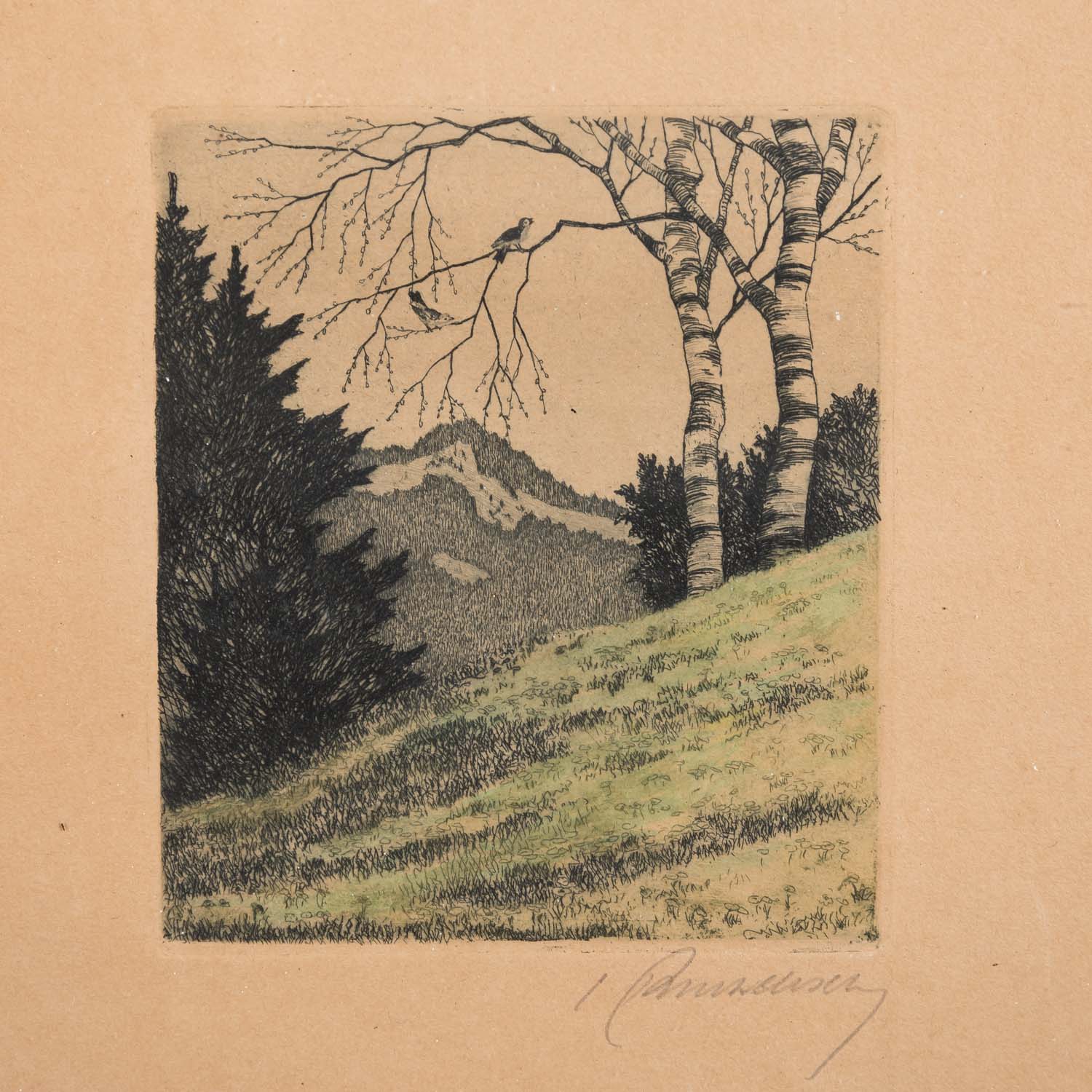 RUCKDESCHEL, CARL (1894 - 1926), Pair of etchings, 1.) 'Forest view of small church with bird on branch', etching on paper, signed in pencil: 'C. Ruckdeschel', HxW plate: approx. 13.5 x 13 cm. (HxW frame: approx. 24 x 23 cm). 2) 'View of a mountain with birds on birch trees in front of it', etching on paper, signed in pencil: 'C. Ruckdeschel', HxW plate: approx. 14 x 11.5 cm (HxW frame: 30 x 25 cm). Each with traces of age and rubbing, discolouration. Each with frame (traces of age).