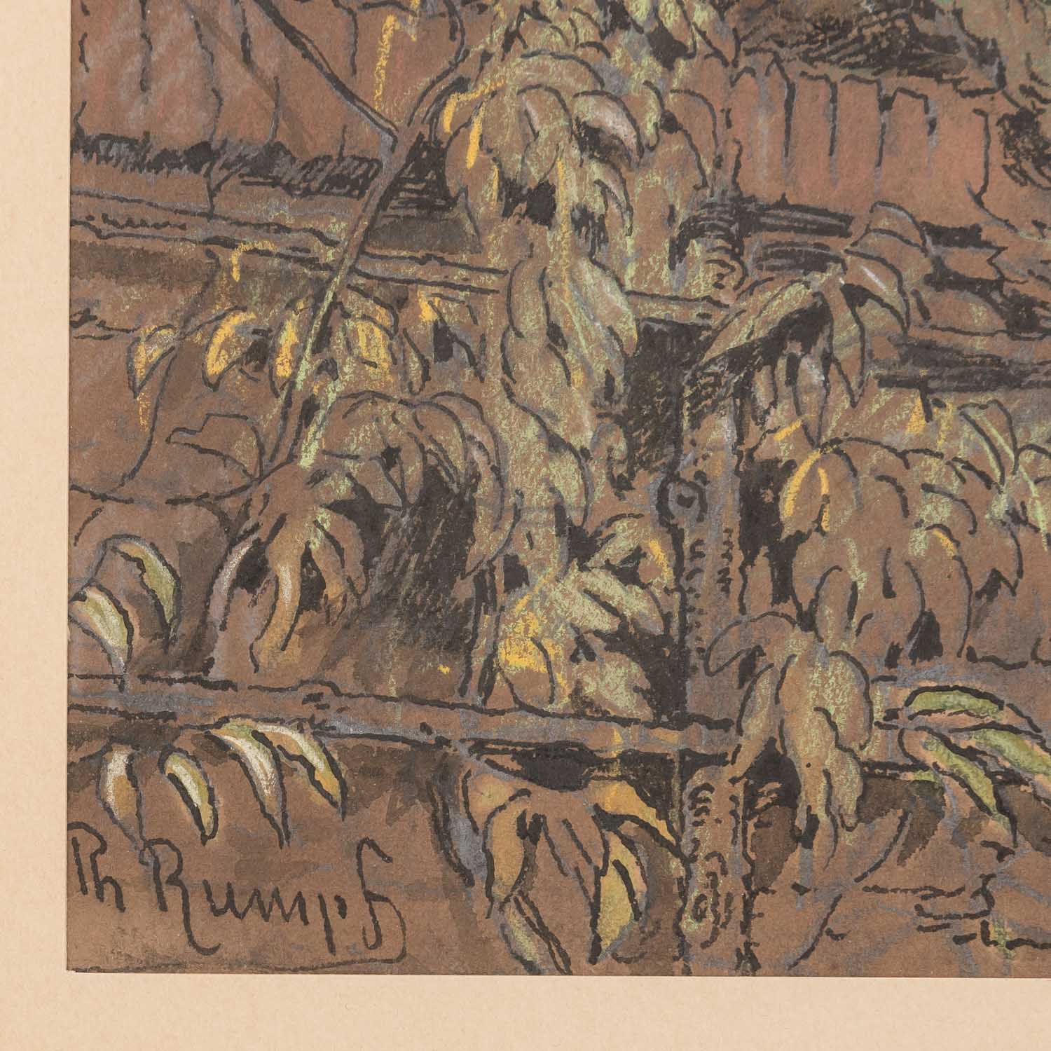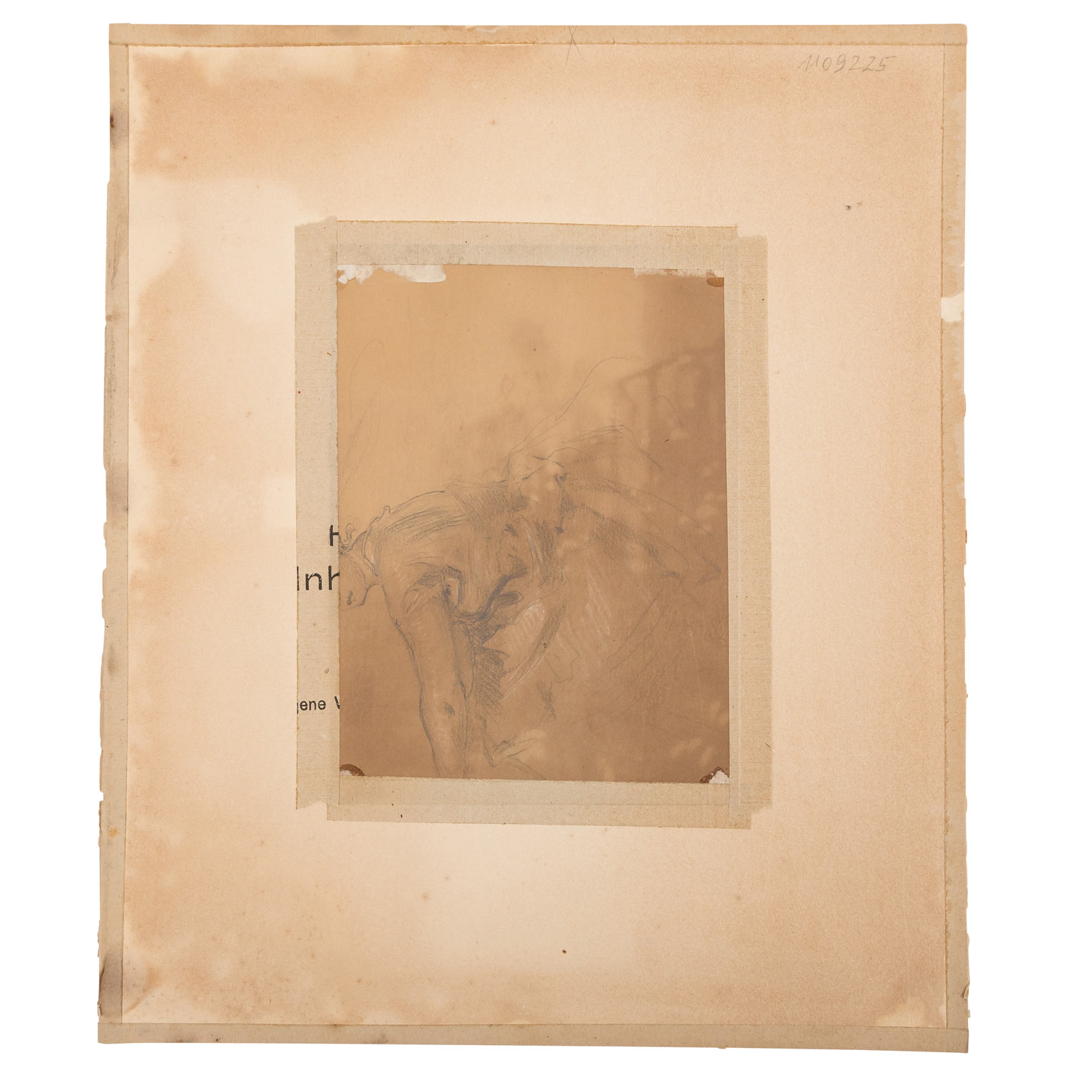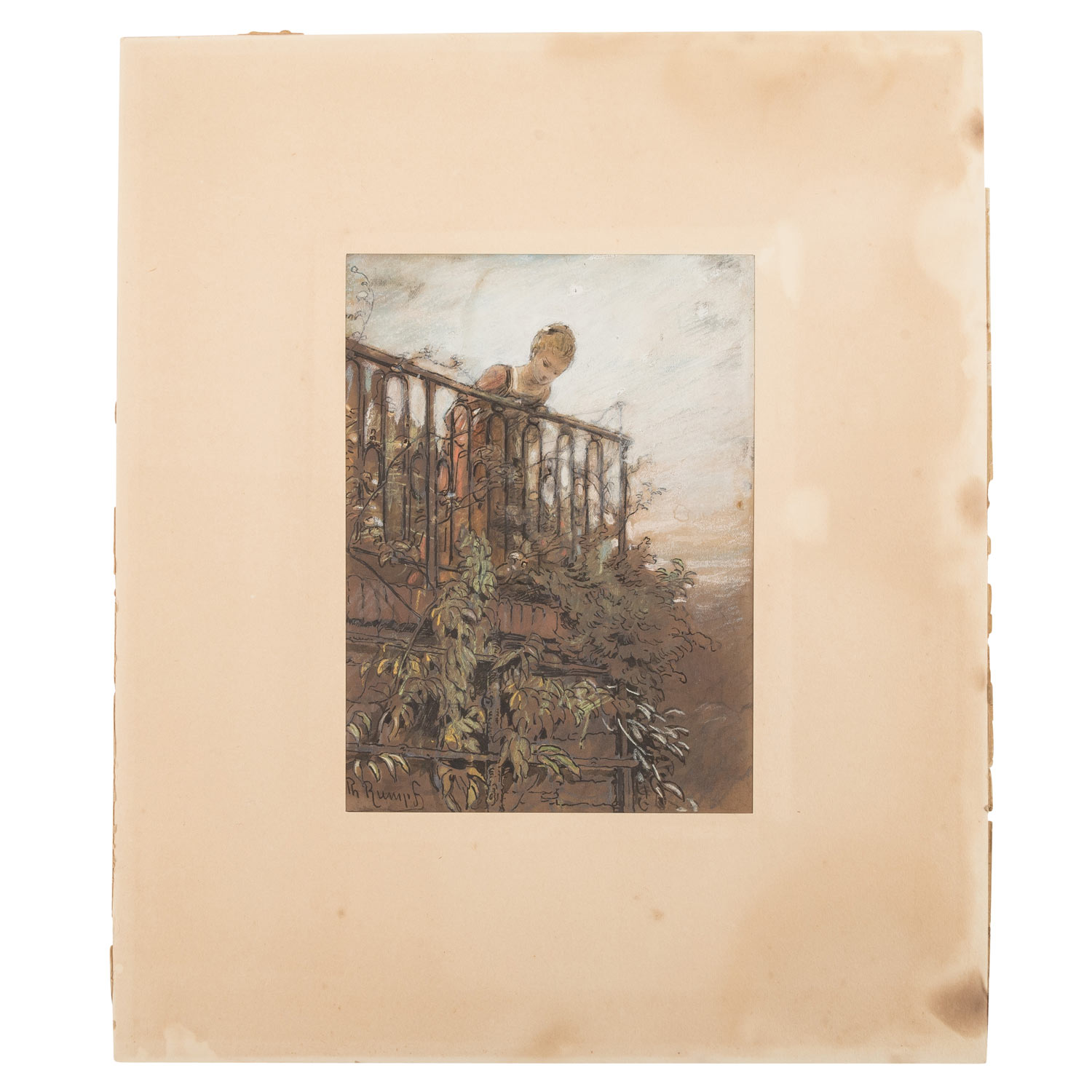 RUMPF, PHILIPP (1821-1896), 'Young girl on a balcony', standing at the railing and looking down over the tendrils, below left signed 'Ph. 'Hull', ink and chalk/brown-toned paper, HxW: passepartout cutout approx. 19.5x14 cm, sheet approx. 20x15 cm, external dimensions of passepartout approx. 36x31 cm. ON the back of the page part of a pencil study 'Young woman in a swinging dress' in landscape format. Sheet browned and stained. Mounted in passe-partout (paper noticeably browned and stained).