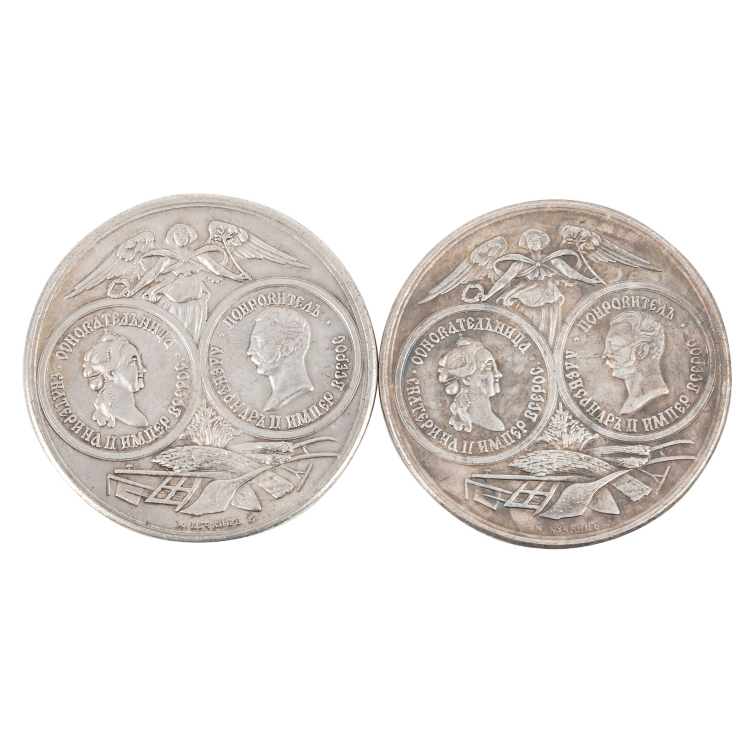 Russia - 2 x medal around 1865 for the 100th anniversary of the czarist, free economic society, Catherine II and Alexander II (1855-1881), from the minting workshop M. Kuchkin, condition each vz-, toning, spotted, minimal wear and scratches, probably formerly cleaned, copper-nickel, each approx. 37.5 g rough. No liability for authenticity.