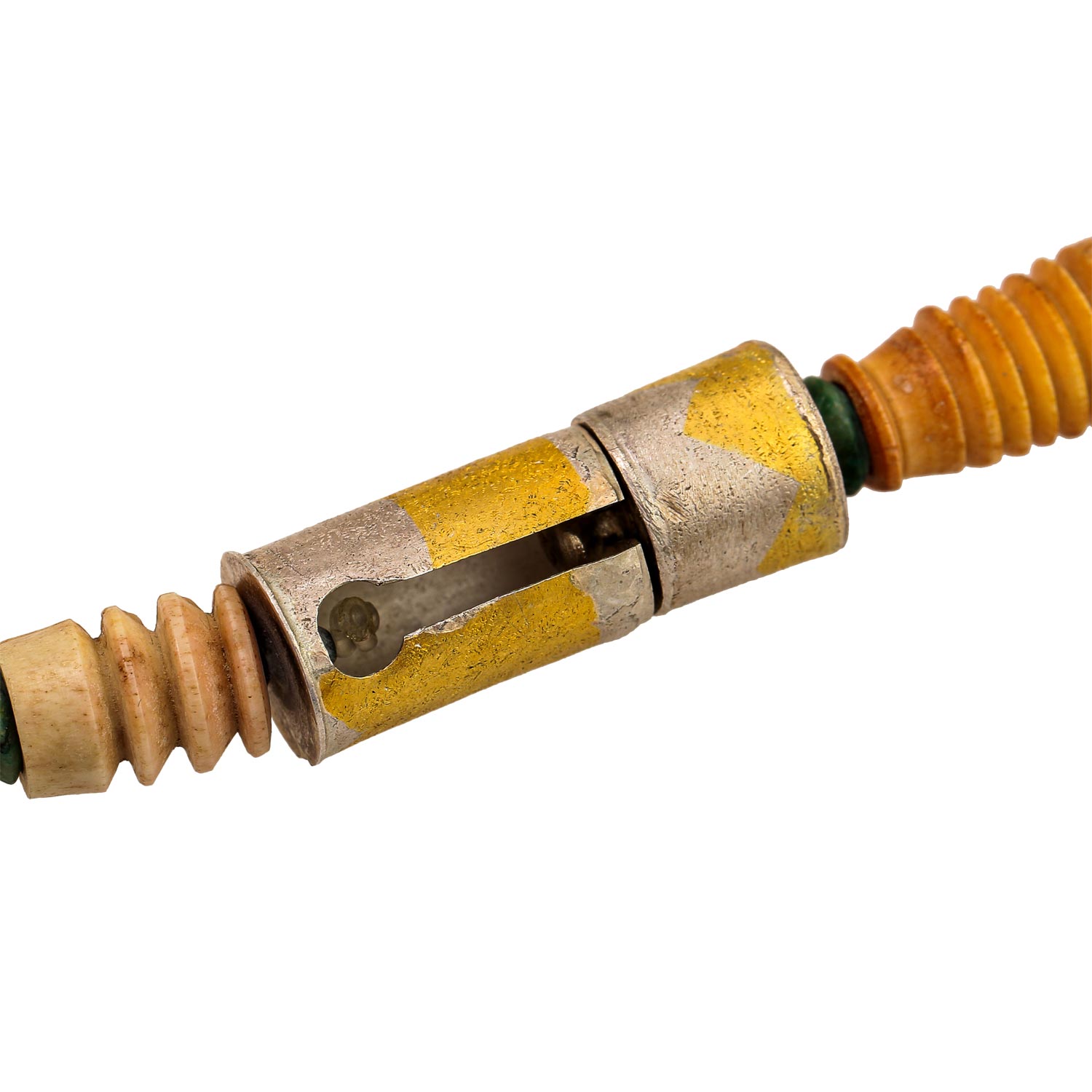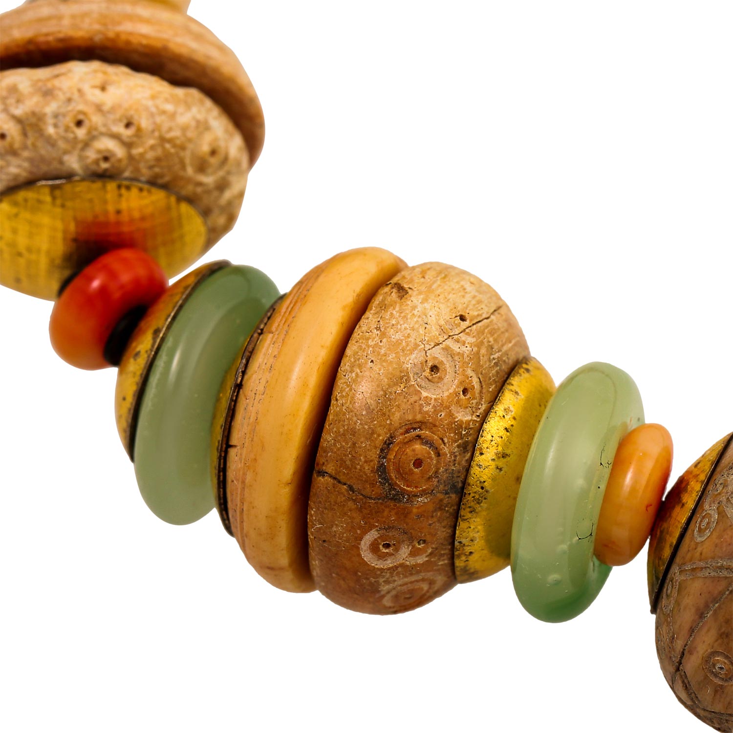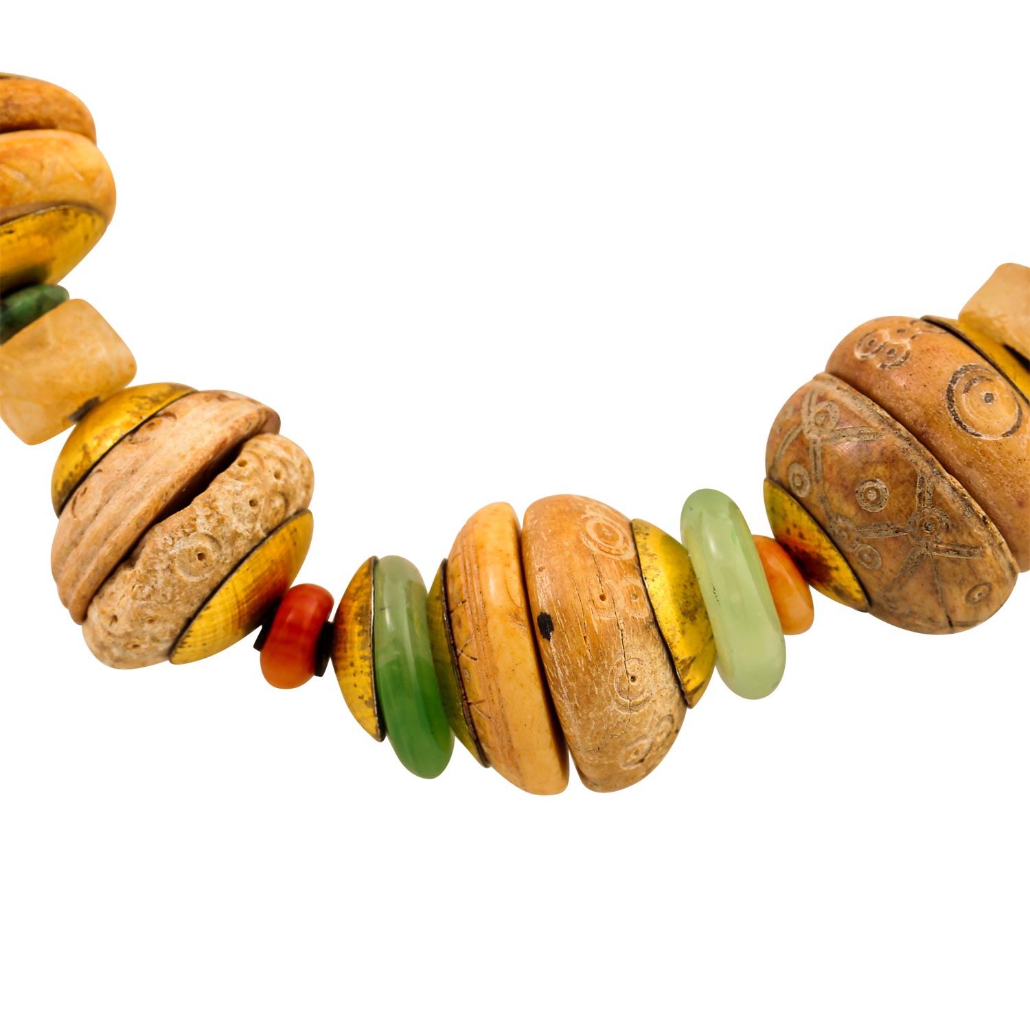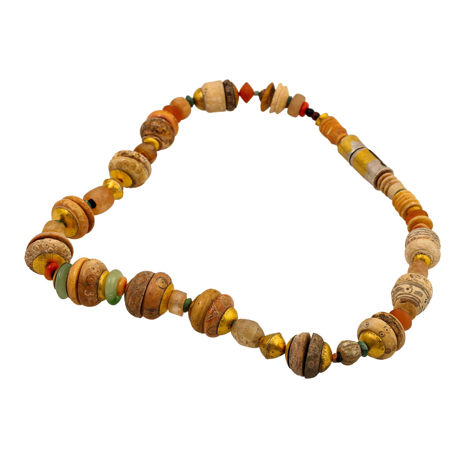 RUTH WINDOLF necklace with various stones: turquoise, antique clay-u. wooden beads, artificial glass beads and intermediate parts of metal gilded, clasp silver with fine gold plating, 92,4g, L: ca. 51cm. Late 20th century, minor signs of wear.