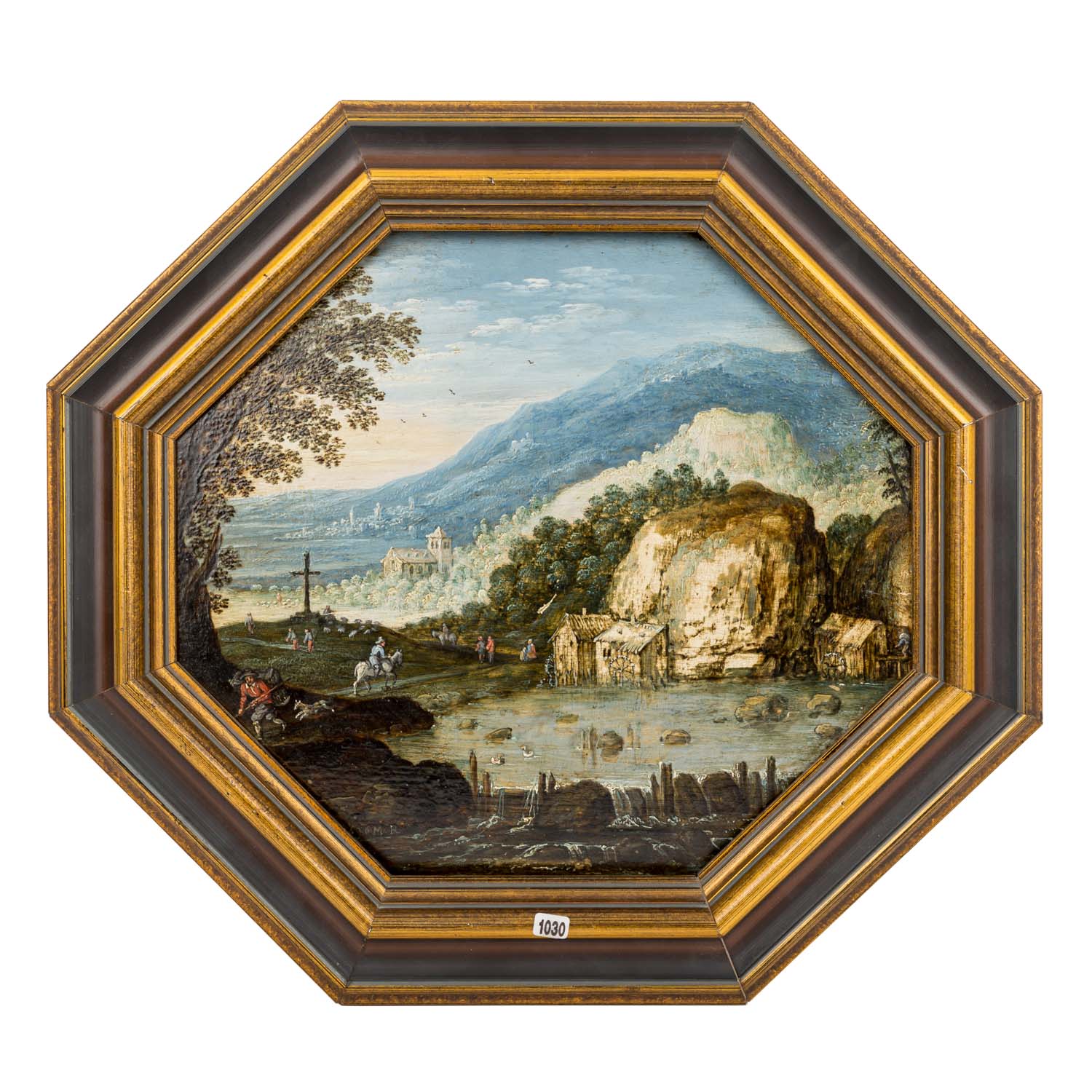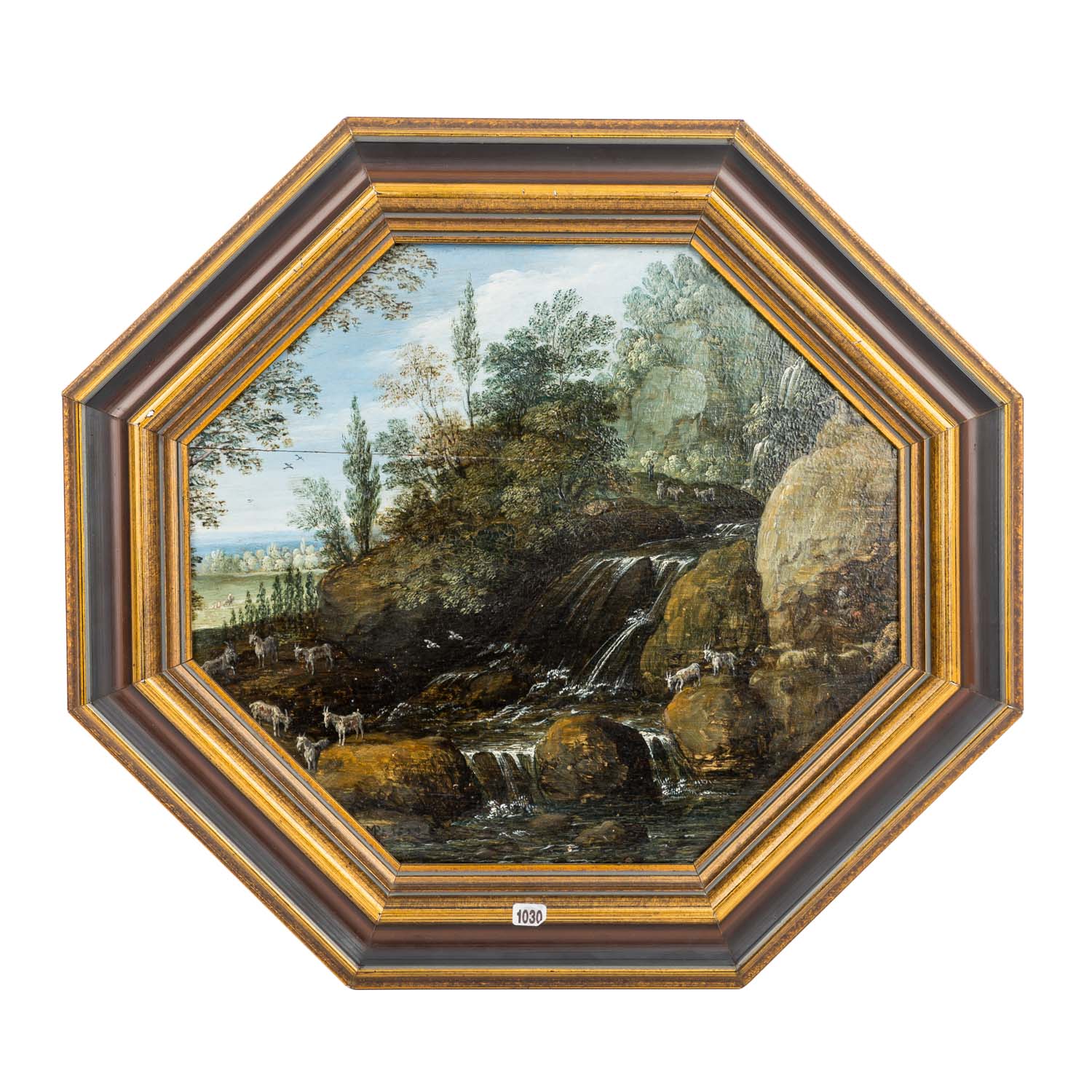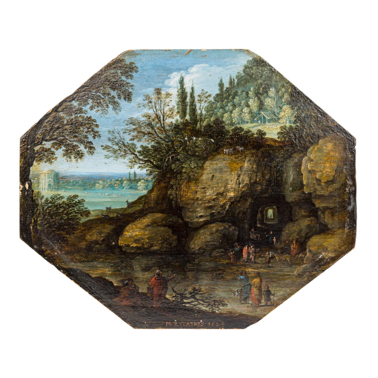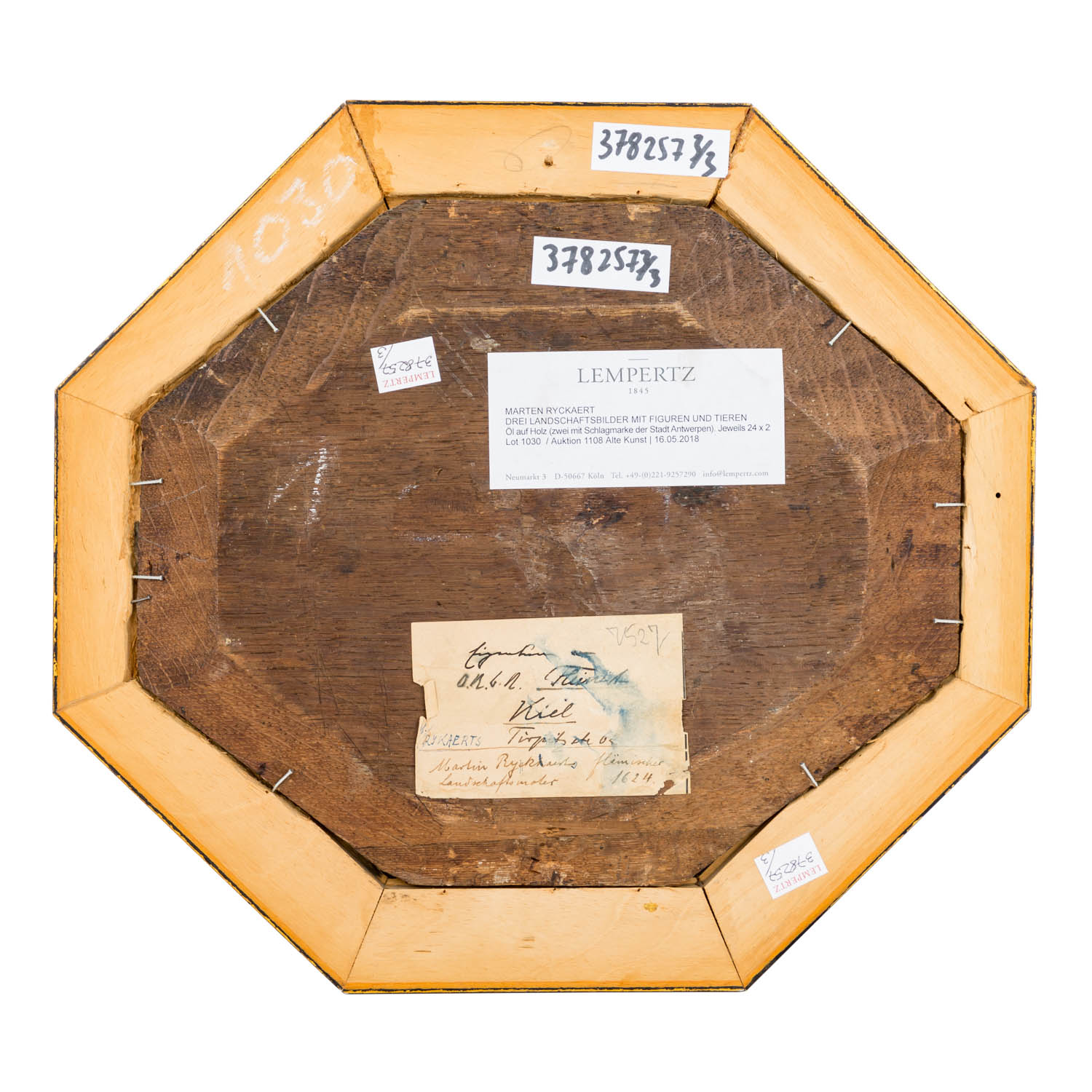RYCKAERT, MARTEN (Antwerp 1587-1631), 3 landscapes with people and animals, 1x 'People in front of a rock grotto' on the left side view of a wide landscape with a temple, signed and dated 'M. RYCKAERTS 1624 '(covered by the frame); 1x 'Rocky landscape with goats and sheep at a waterfall', below left. monogrammed and dated 'MR 1624'; 1x 'Hikers and shepherds in an ideal mountain landscape', below. dated and monogrammed '1626 M R'; each oil / wood (the two panels from 1624 with the stamp of the city of Antwerp), octagonal, HxW: 2x approx 24.5x29 cm, 1x approx 23.5x28 cm (each 31.5x34.5 cm with frame). Each restored and part. retouched, traces of rubbing on the edges; 1x with drying crack in the plate, on the reverse repaired. Each with a frame (partly glued). VERSO old labels with handwritten provenance note 'Property ORbR Heinert Kiel ...' and artist name; Each label at the Lempertz auction house.