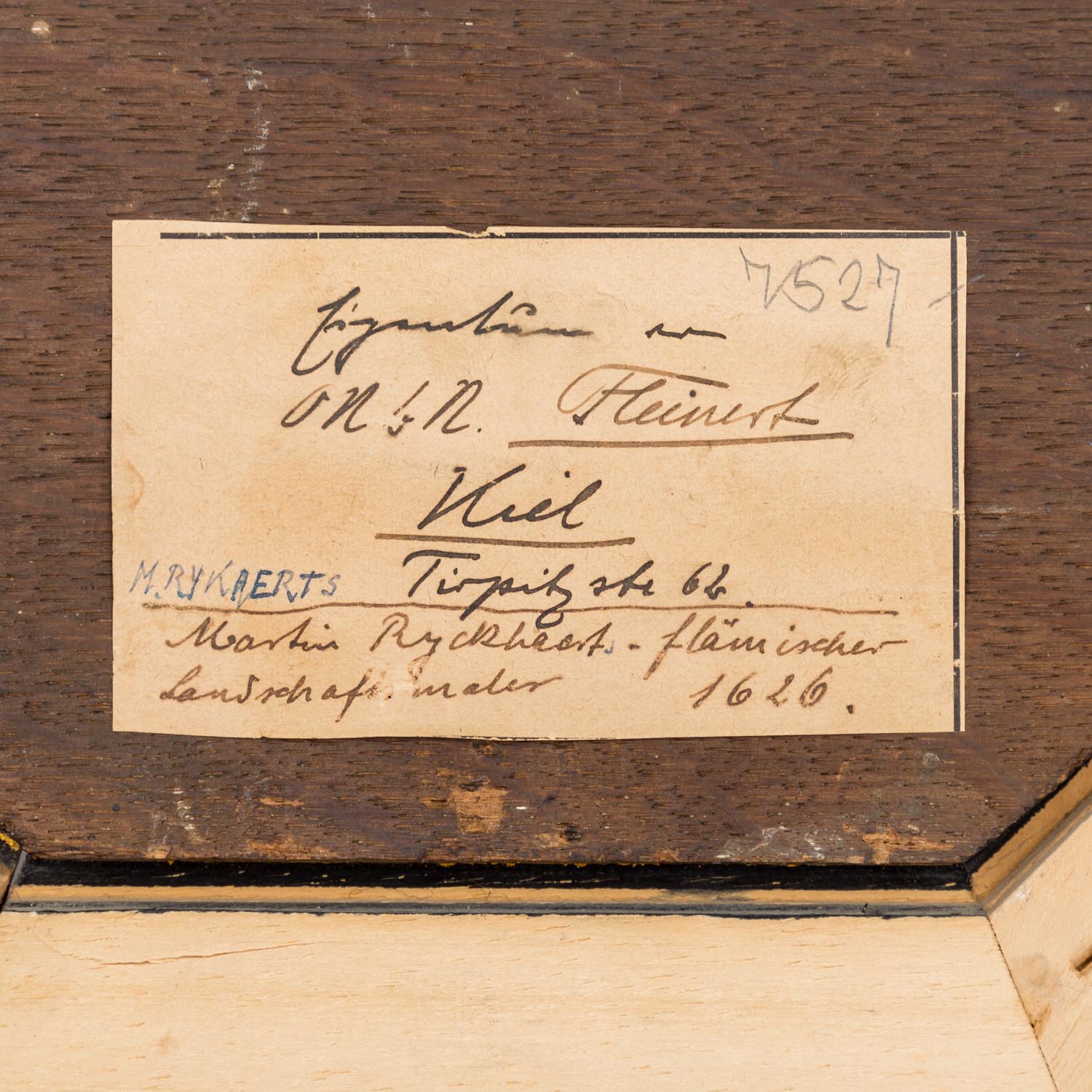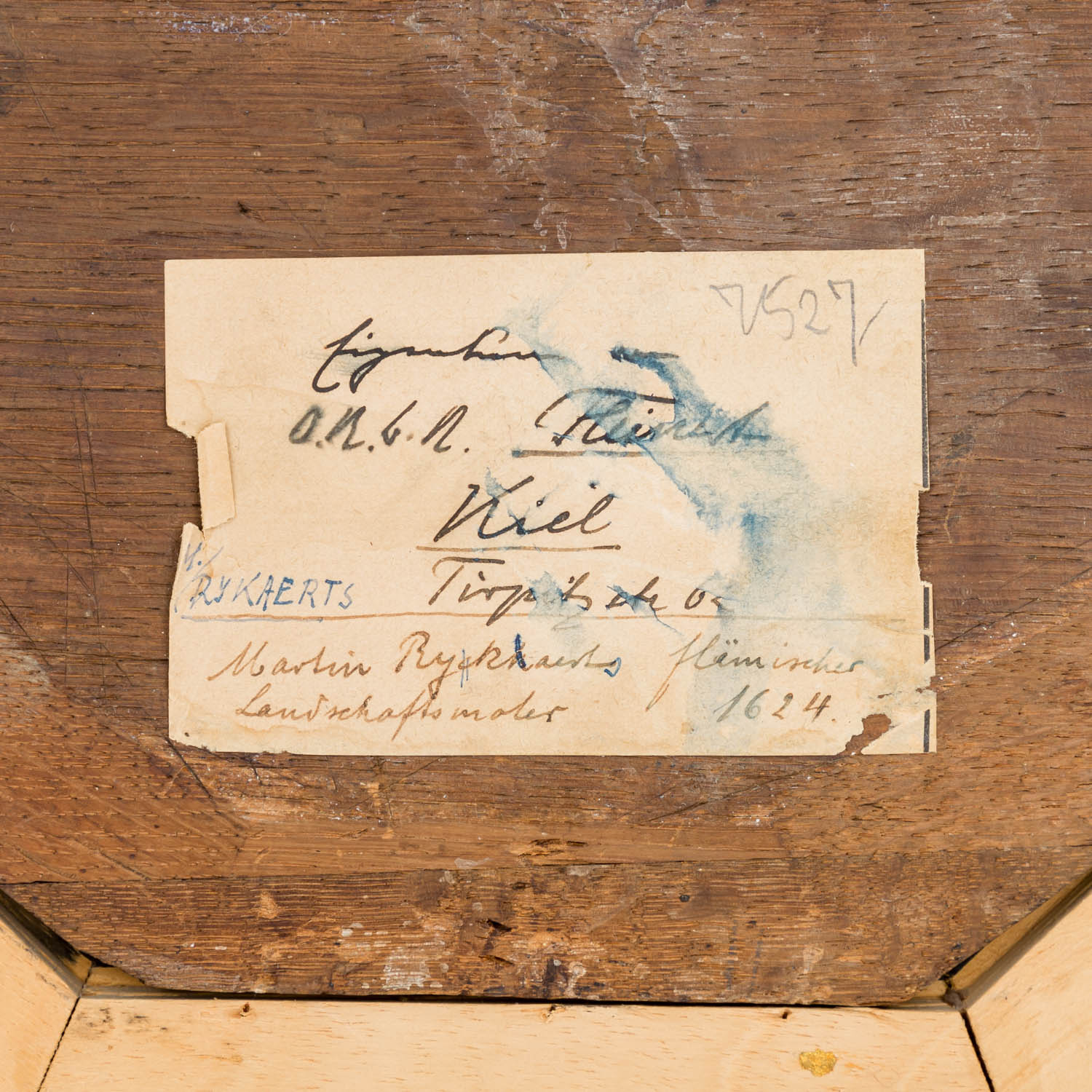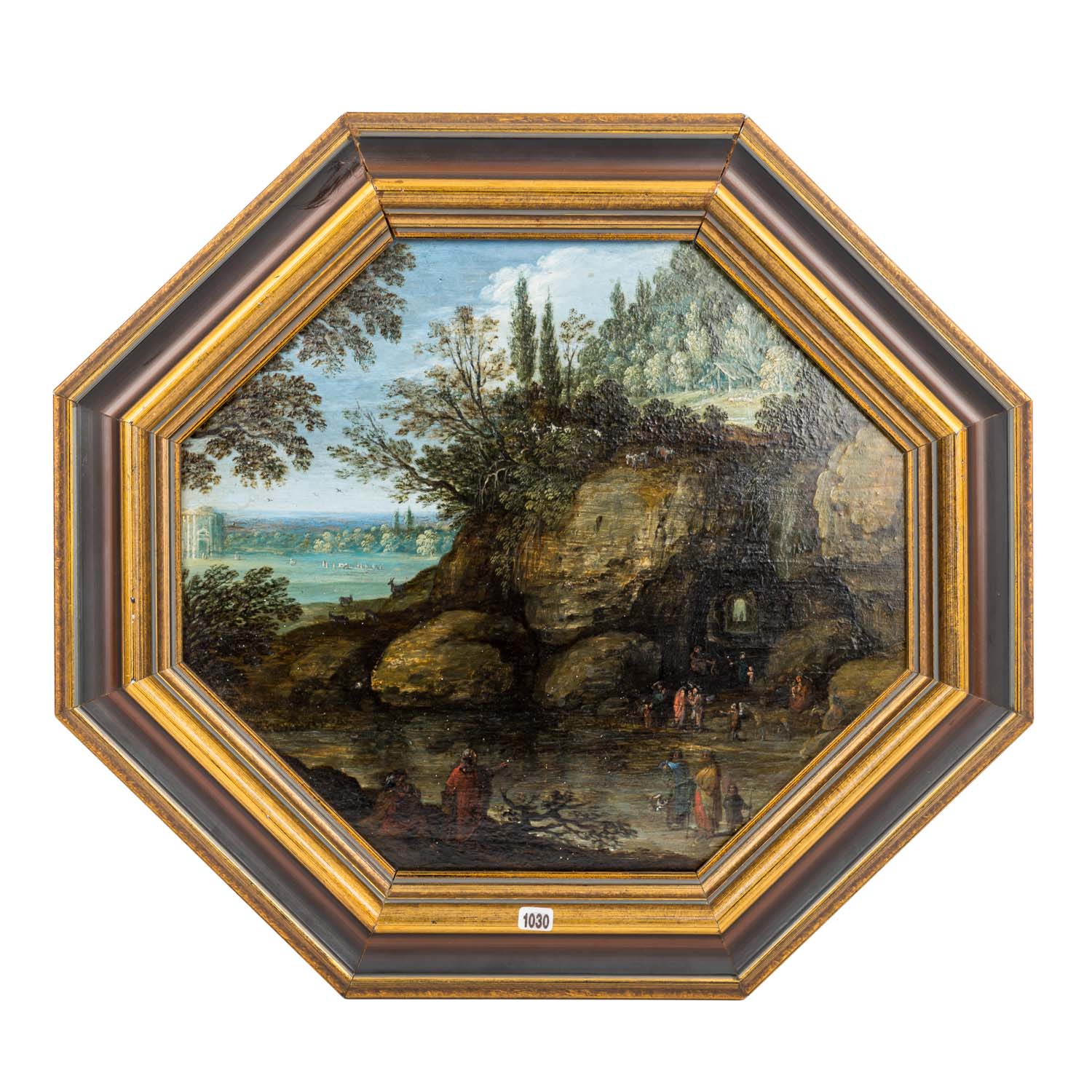 RYCKAERT, MARTEN (Antwerp 1587-1631), 3 landscapes with people and animals, 1x 'People in front of a rock grotto' on the left side view of a wide landscape with a temple, signed and dated 'M. RYCKAERTS 1624 '(covered by the frame); 1x 'Rocky landscape with goats and sheep at a waterfall', below left. monogrammed and dated 'MR 1624'; 1x 'Hikers and shepherds in an ideal mountain landscape', below. dated and monogrammed '1626 M R'; each oil / wood (the two panels from 1624 with the stamp of the city of Antwerp), octagonal, HxW: 2x approx 24.5x29 cm, 1x approx 23.5x28 cm (each 31.5x34.5 cm with frame). Each restored and part. retouched, traces of rubbing on the edges; 1x with drying crack in the plate, on the reverse repaired. Each with a frame (partly glued). VERSO old labels with handwritten provenance note 'Property ORbR Heinert Kiel ...' and artist name; Each label at the Lempertz auction house.