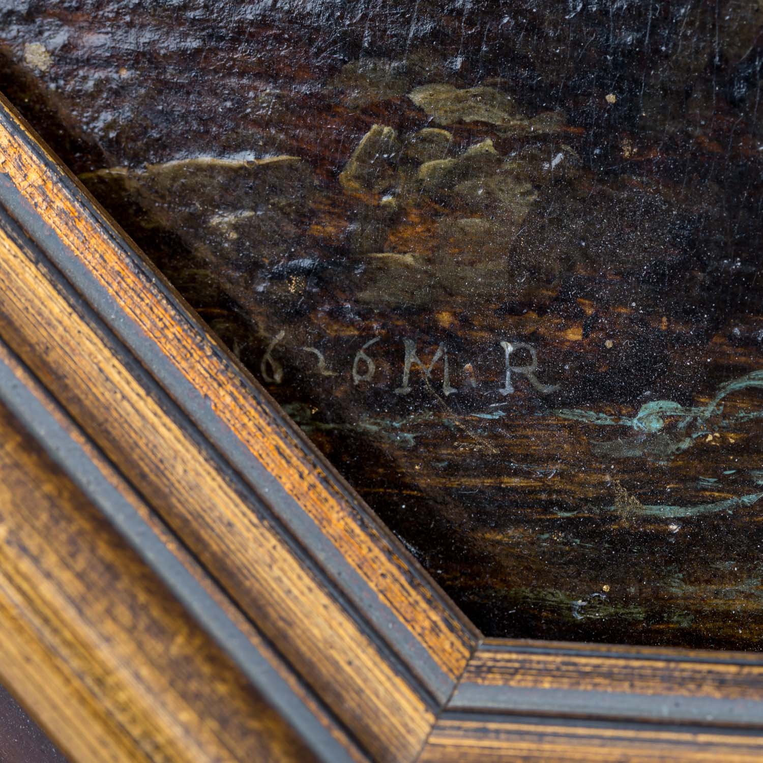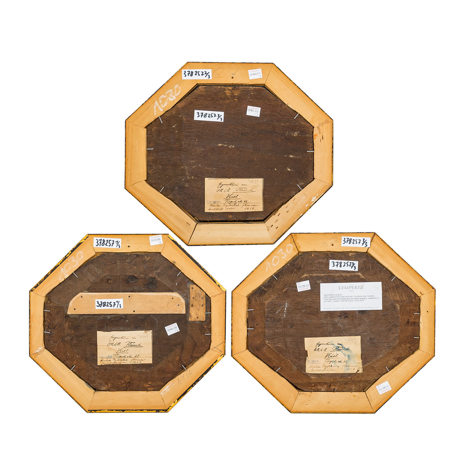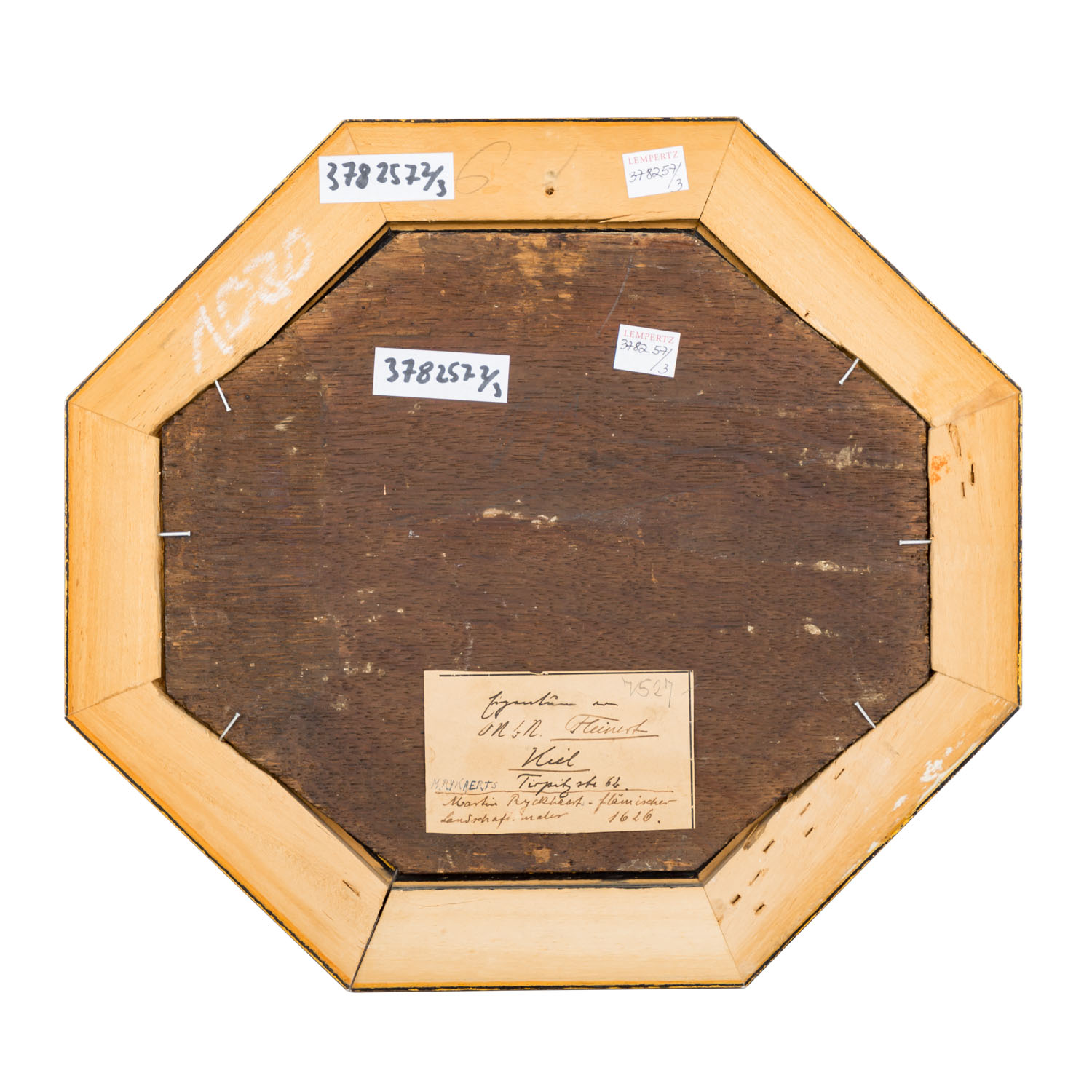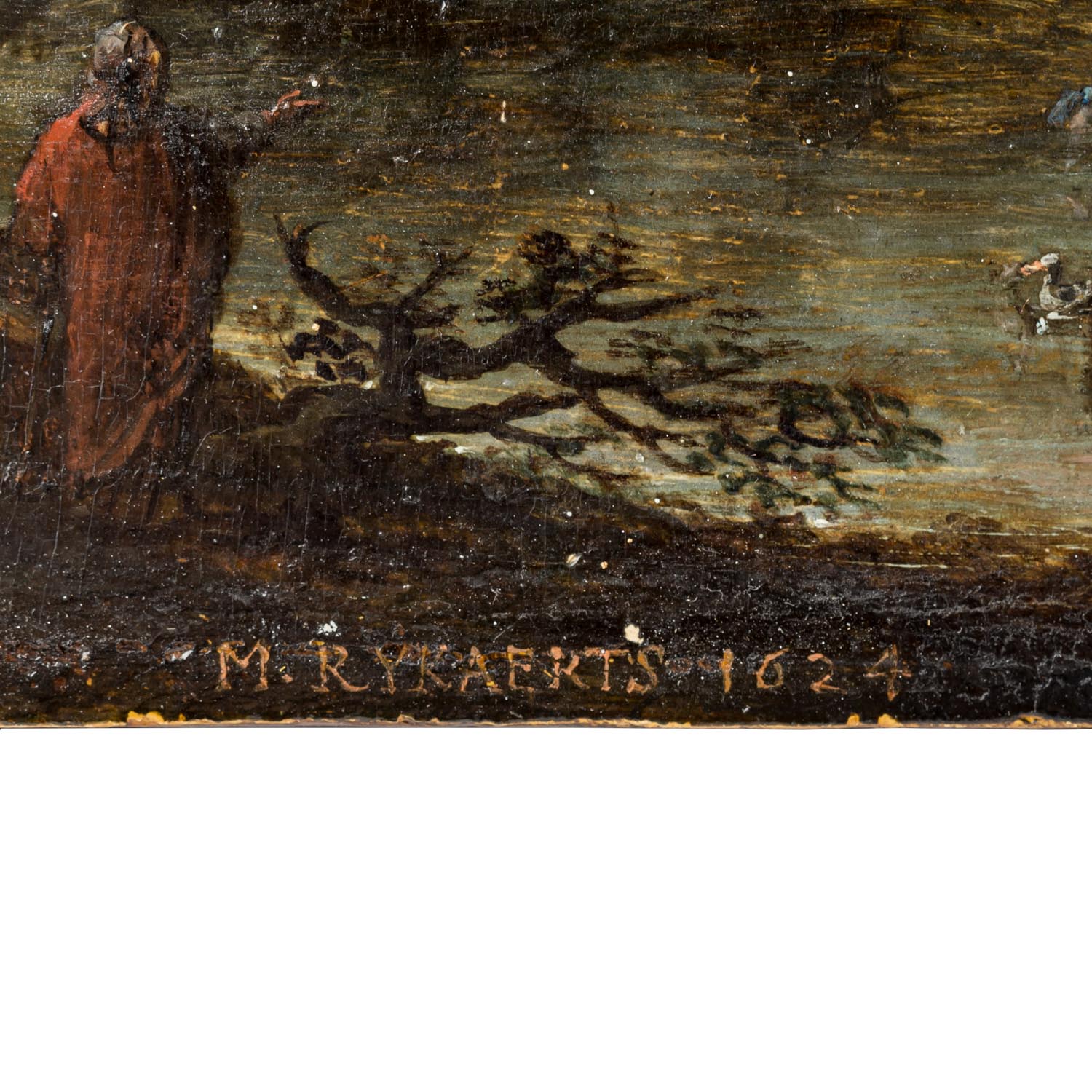 RYCKAERT, MARTEN (Antwerp 1587-1631), 3 landscapes with people and animals, 1x 'People in front of a rock grotto' on the left side view of a wide landscape with a temple, signed and dated 'M. RYCKAERTS 1624 '(covered by the frame); 1x 'Rocky landscape with goats and sheep at a waterfall', below left. monogrammed and dated 'MR 1624'; 1x 'Hikers and shepherds in an ideal mountain landscape', below. dated and monogrammed '1626 M R'; each oil / wood (the two panels from 1624 with the stamp of the city of Antwerp), octagonal, HxW: 2x approx 24.5x29 cm, 1x approx 23.5x28 cm (each 31.5x34.5 cm with frame). Each restored and part. retouched, traces of rubbing on the edges; 1x with drying crack in the plate, on the reverse repaired. Each with a frame (partly glued). VERSO old labels with handwritten provenance note 'Property ORbR Heinert Kiel ...' and artist name; Each label at the Lempertz auction house.