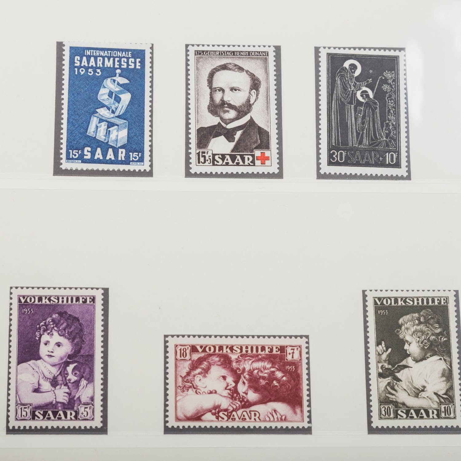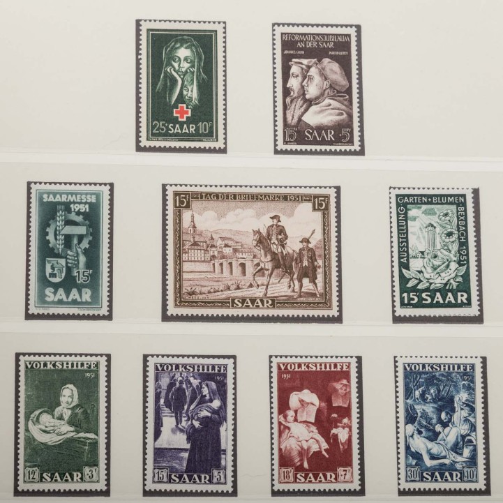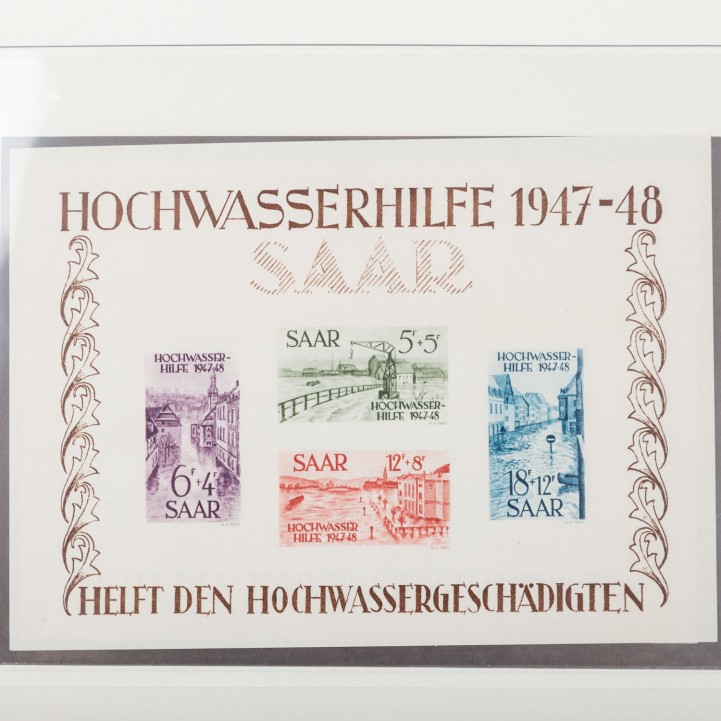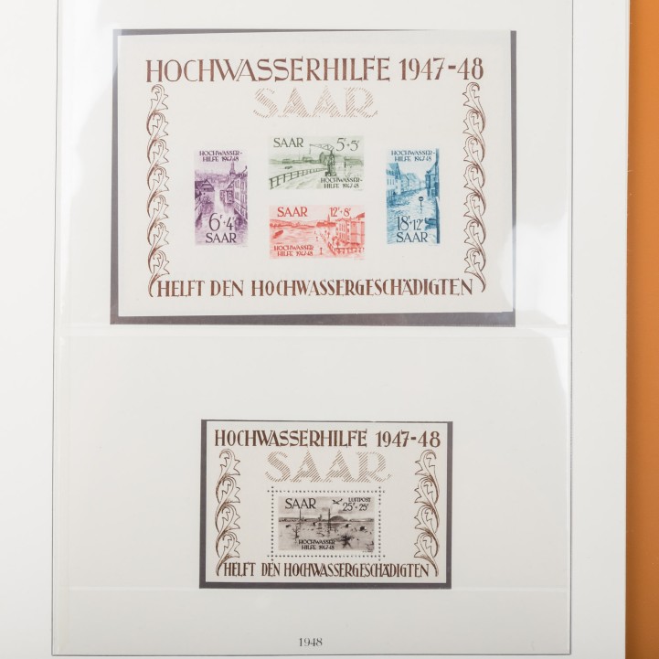 Saarland 1945–1959**. Complete mint collection, pair of flood blocks with Hoffmann photo certificate in Lindner T-Album.