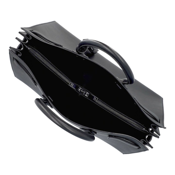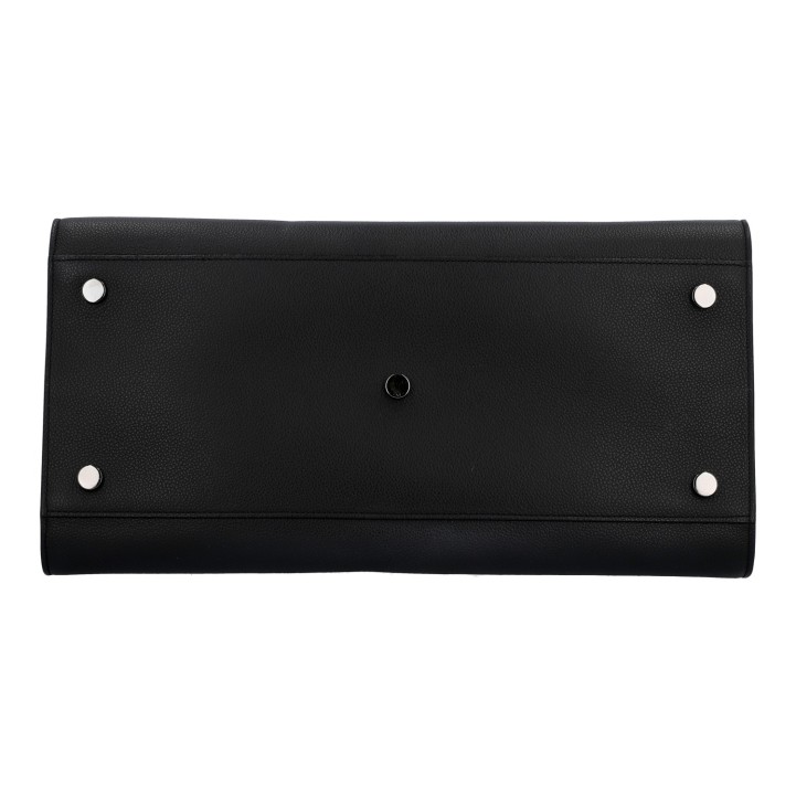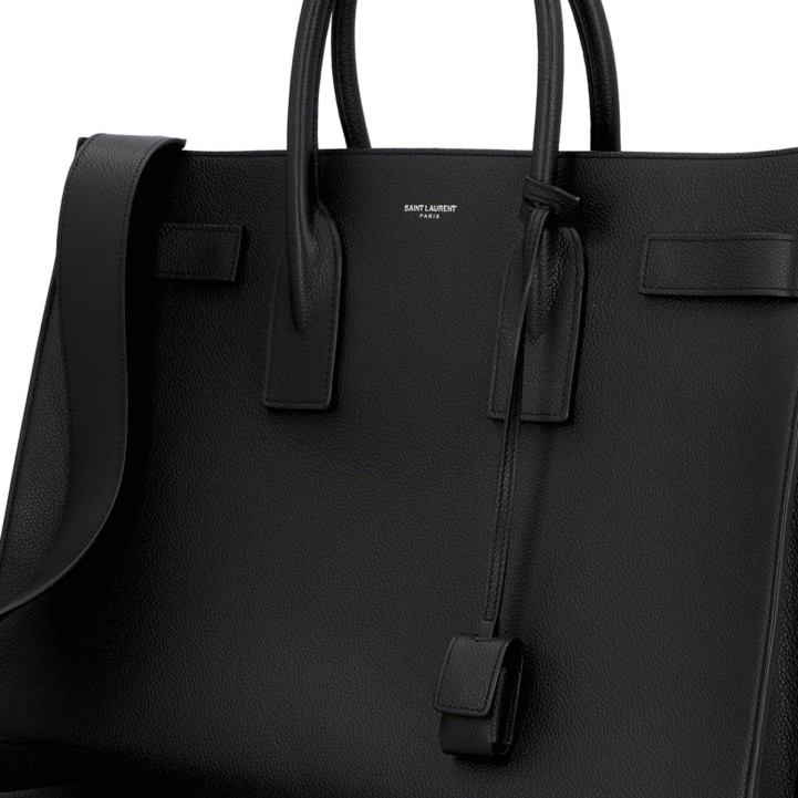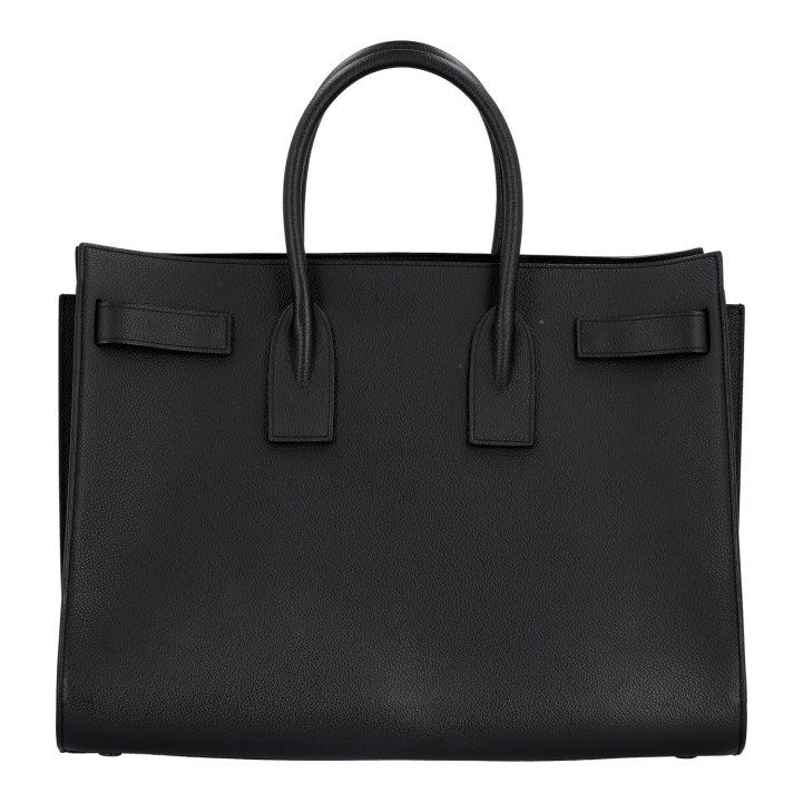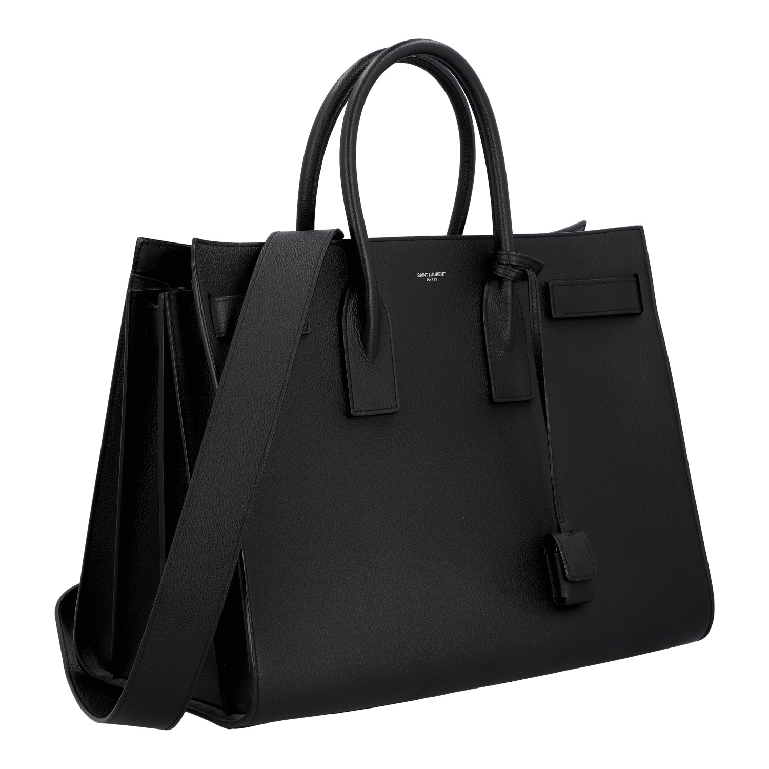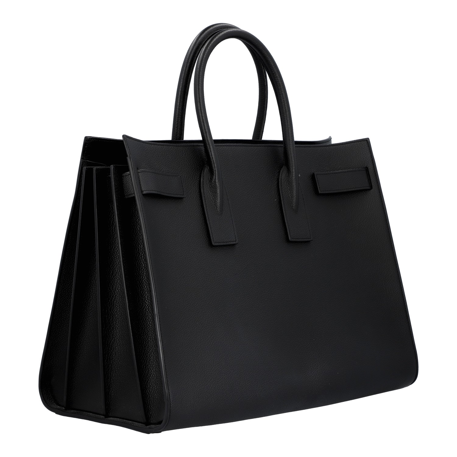 SAINT LAURENT handbag 'SAC DE JOUR'. Finely grained leather in black. Classic, simple design with double handles, side tabs, clochette with lock, center compartment with zipper. Dust bag included. Very good condition. 40x20x30cm.