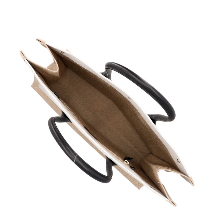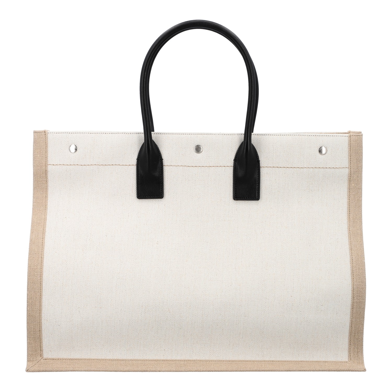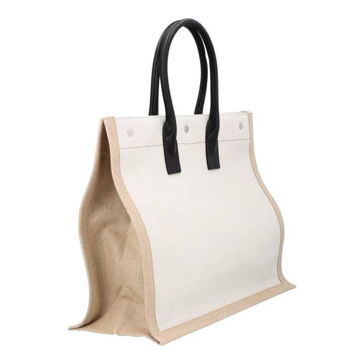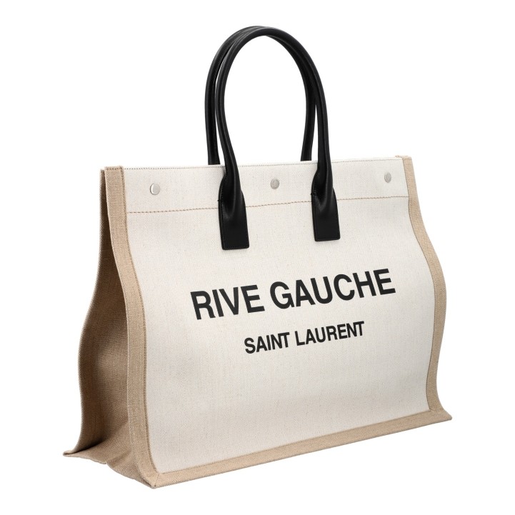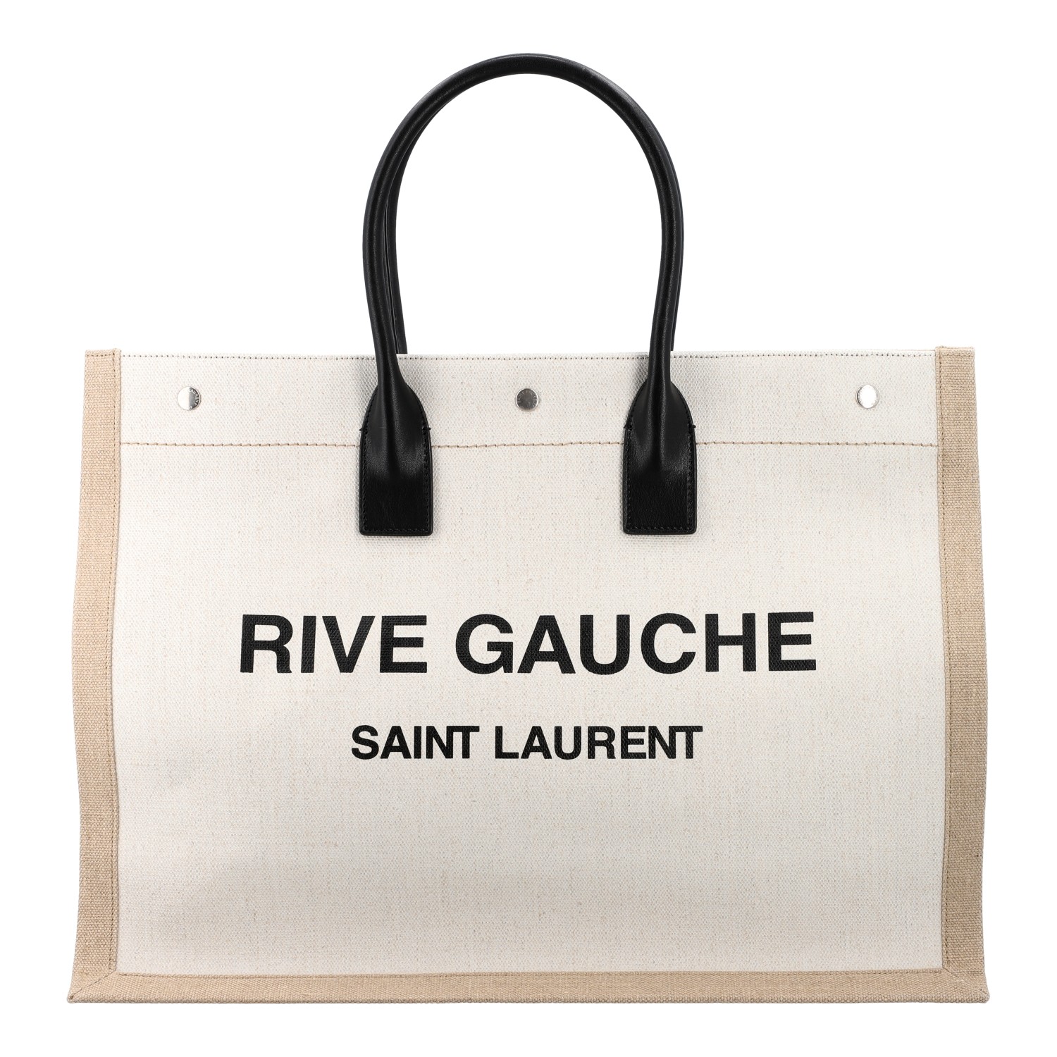 SAINT LAURENT Shopper 'RIVE GAUCHE', retail price: 1.500,-€. Beige canvas with black logo print, black leather details, double handles and press stud fastening. Interior with one zip pocket. Very good condition. 47.5 x 17 x 33 cm.