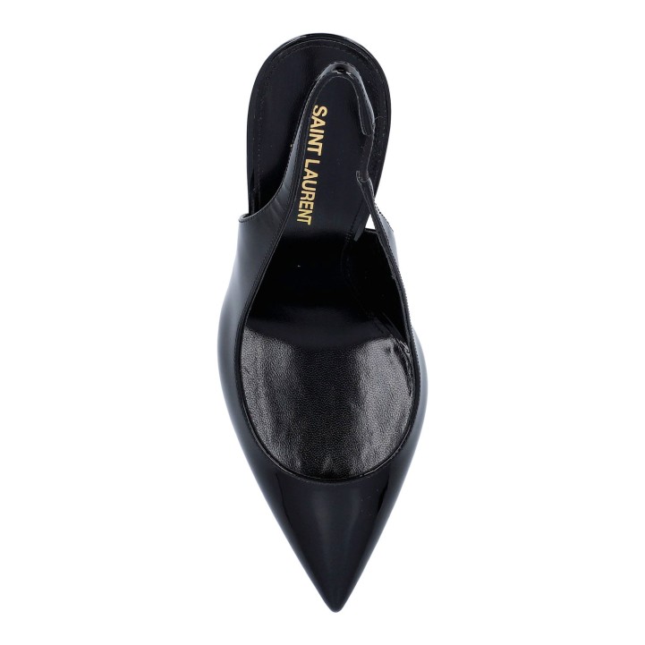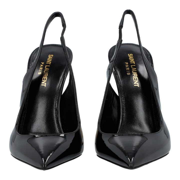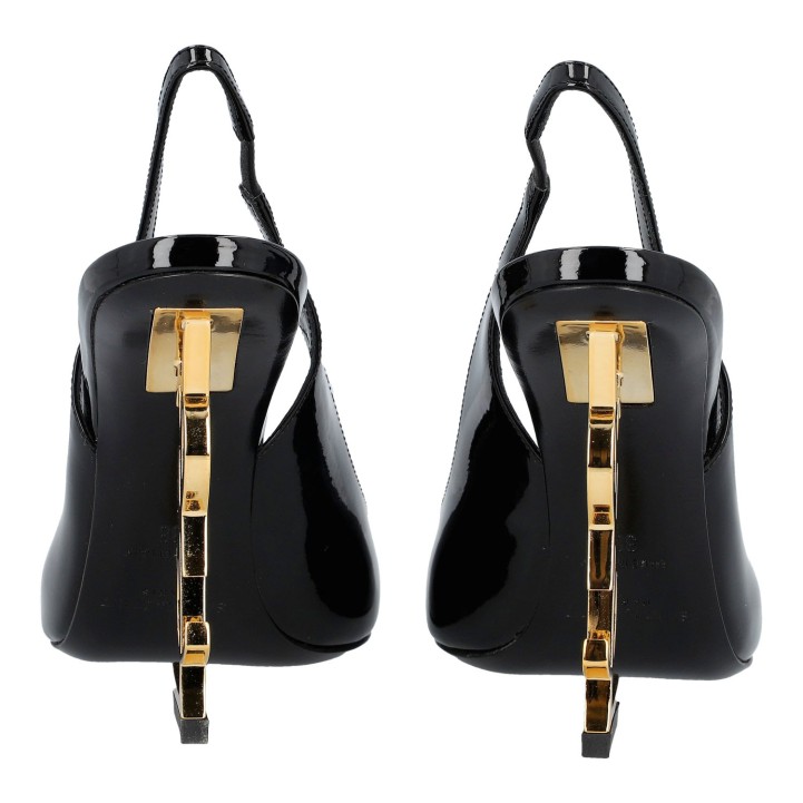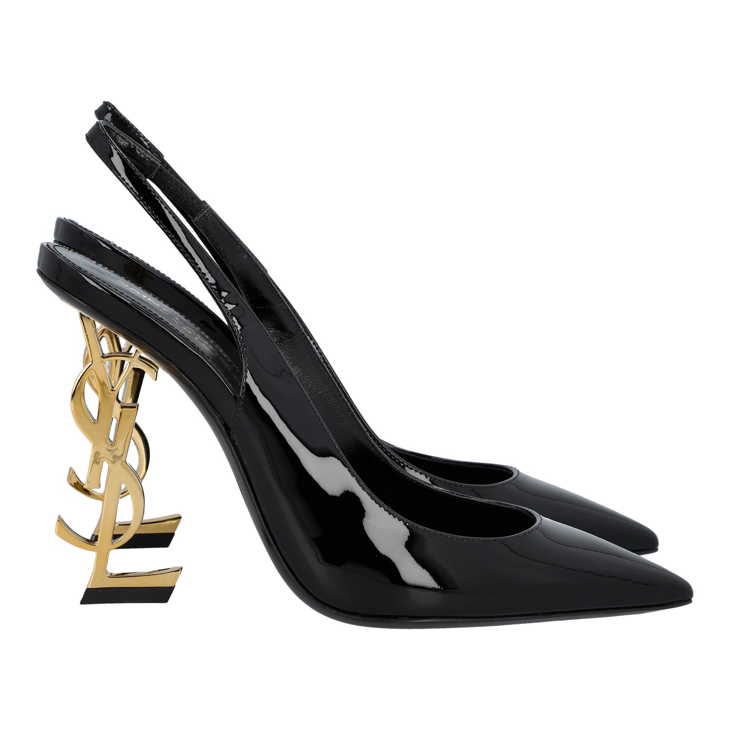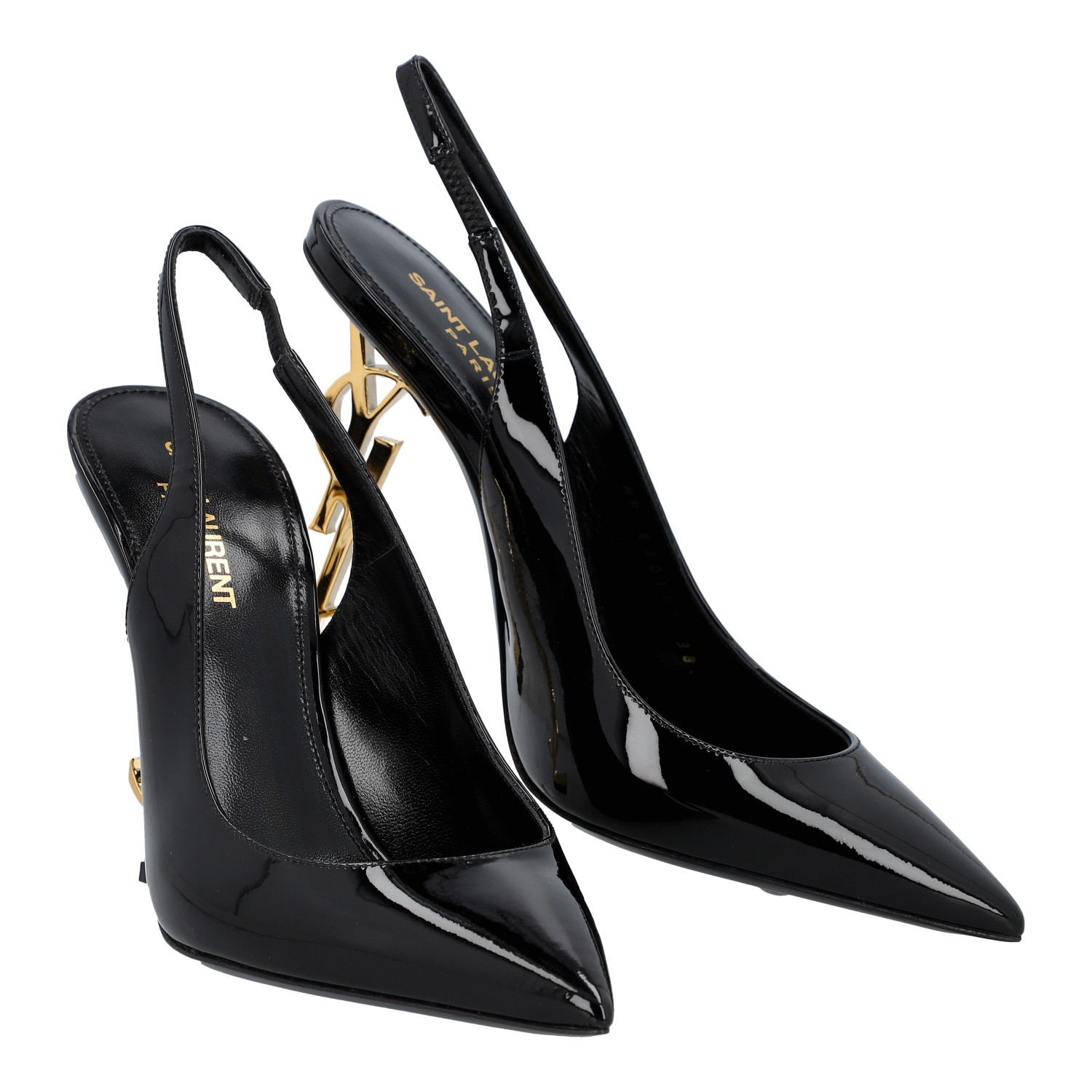 SAINT LAURENT ‘OPYUM’ slingback pumps, size 38, original price: approx. €1,300. Black patent leather with pointed toe and gold-coloured logo on the heel (approx. 11 cm). Dust bag included. Unworn.