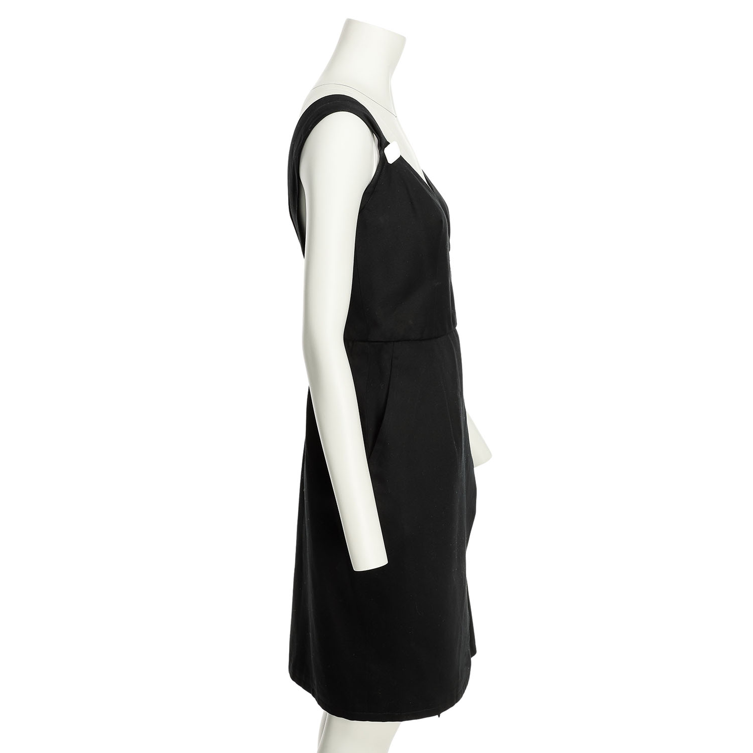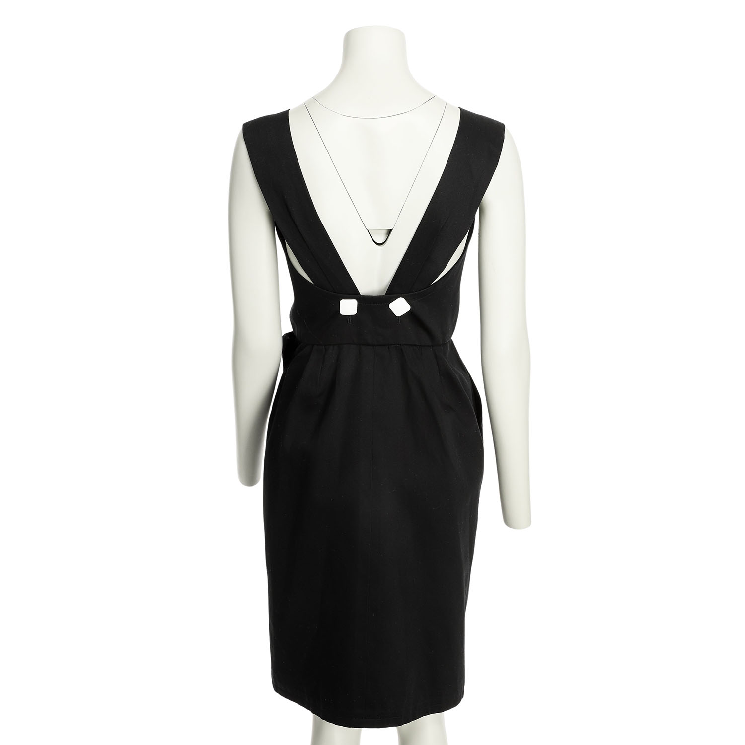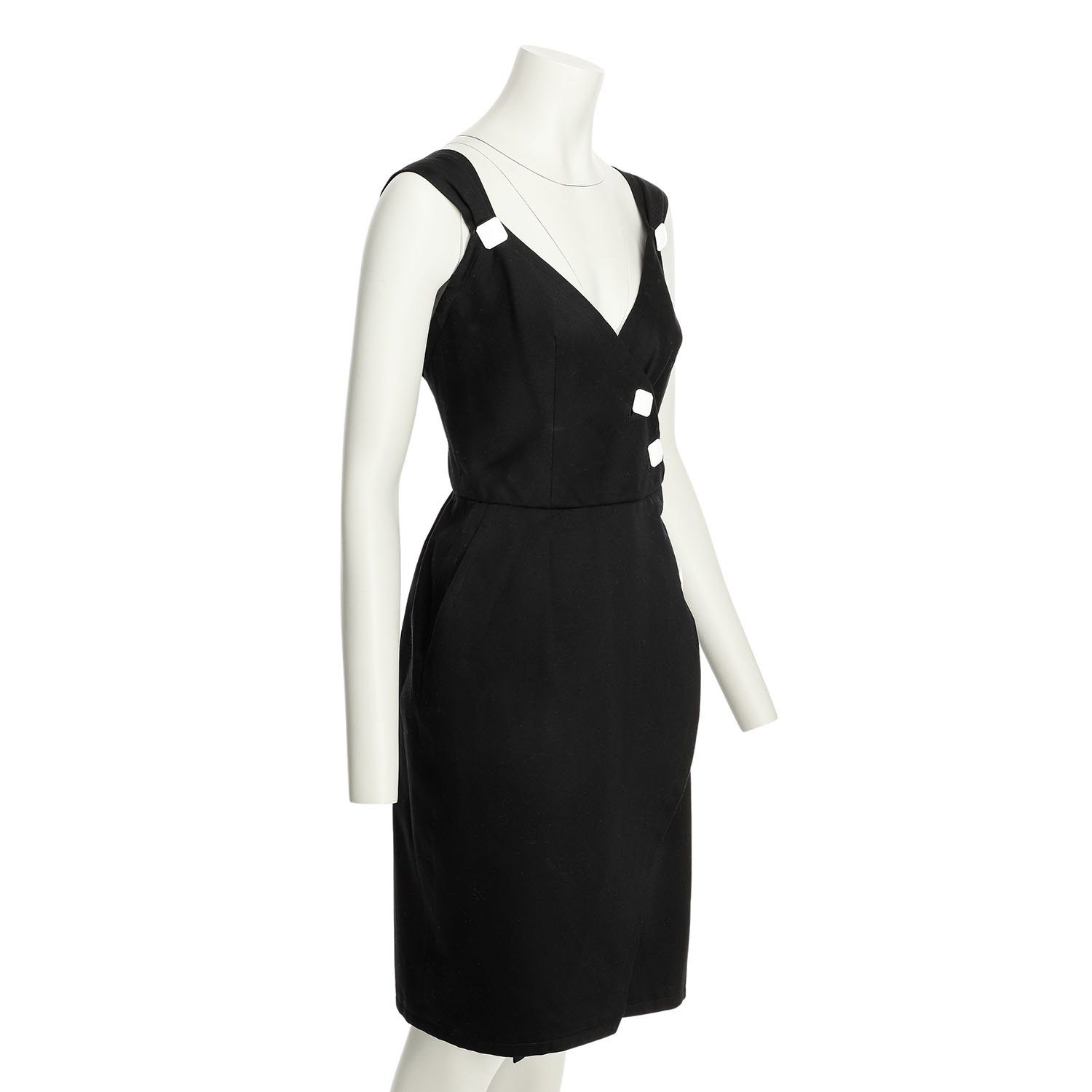 100% cotton. Wrap dress in black with white buttons, narrow straps and slit at the front. Signs of wear present.