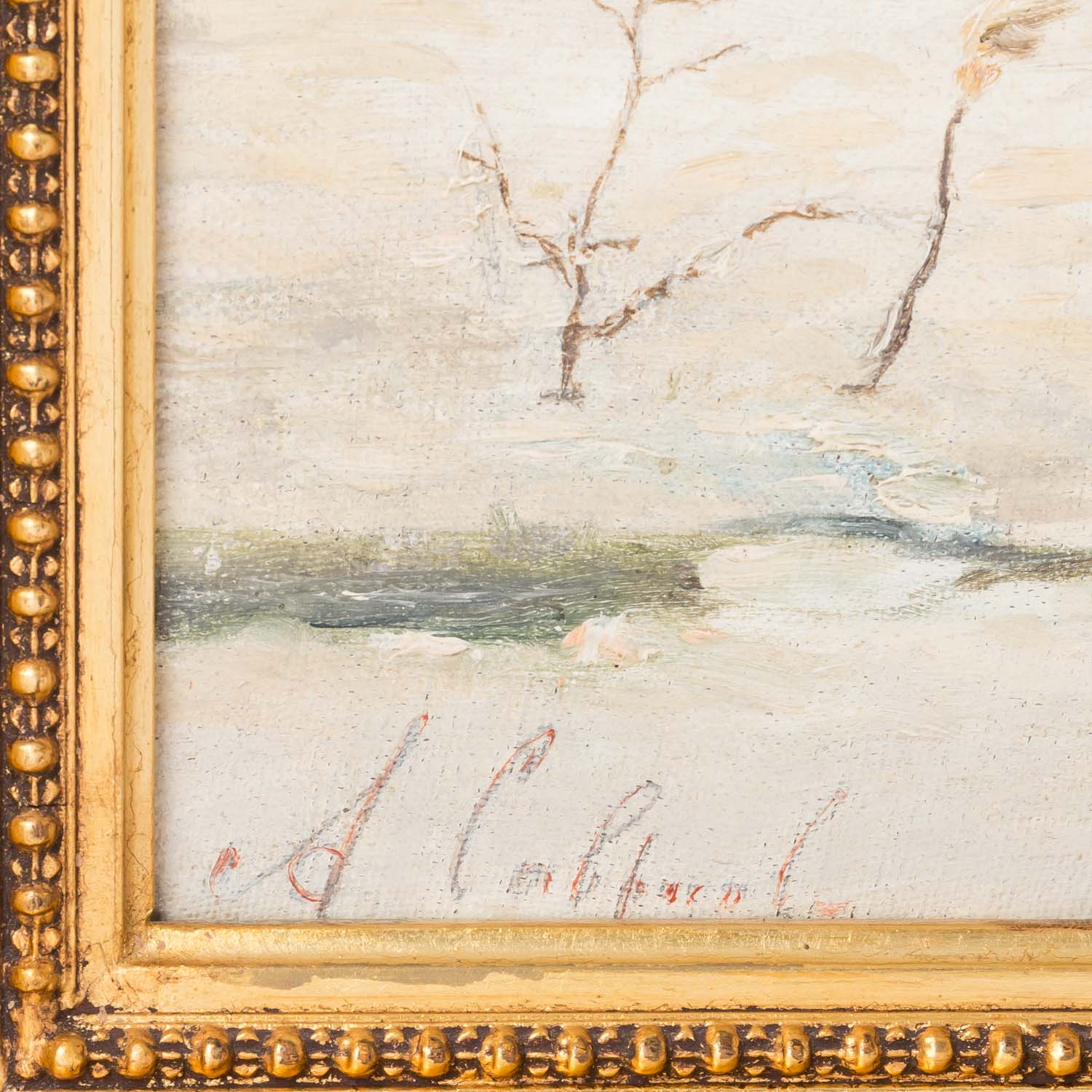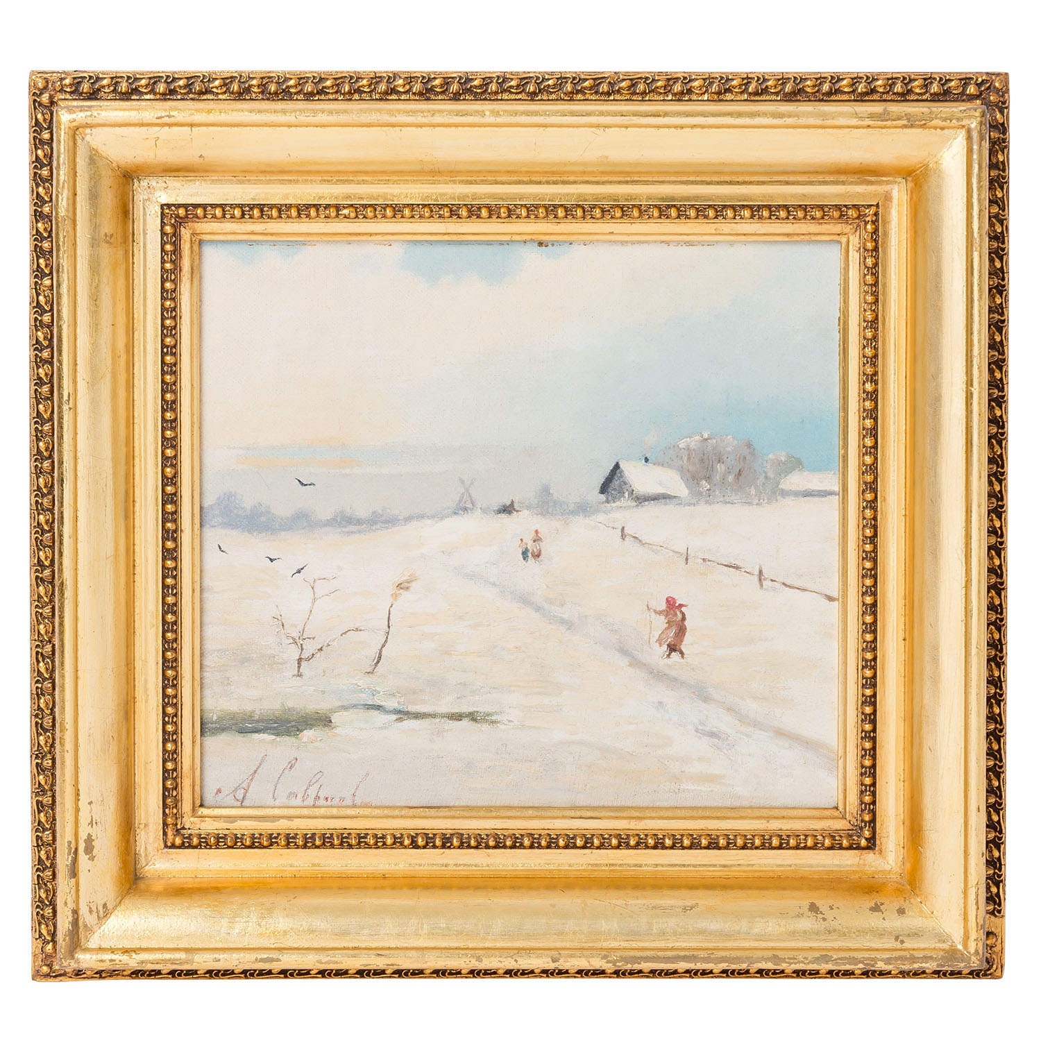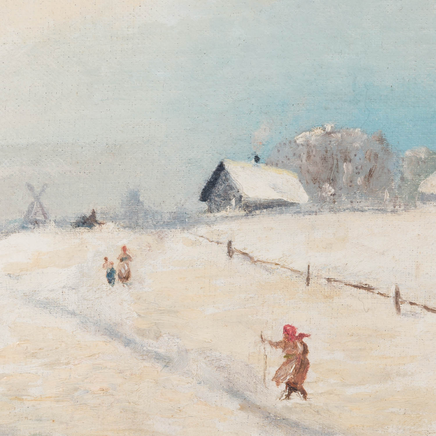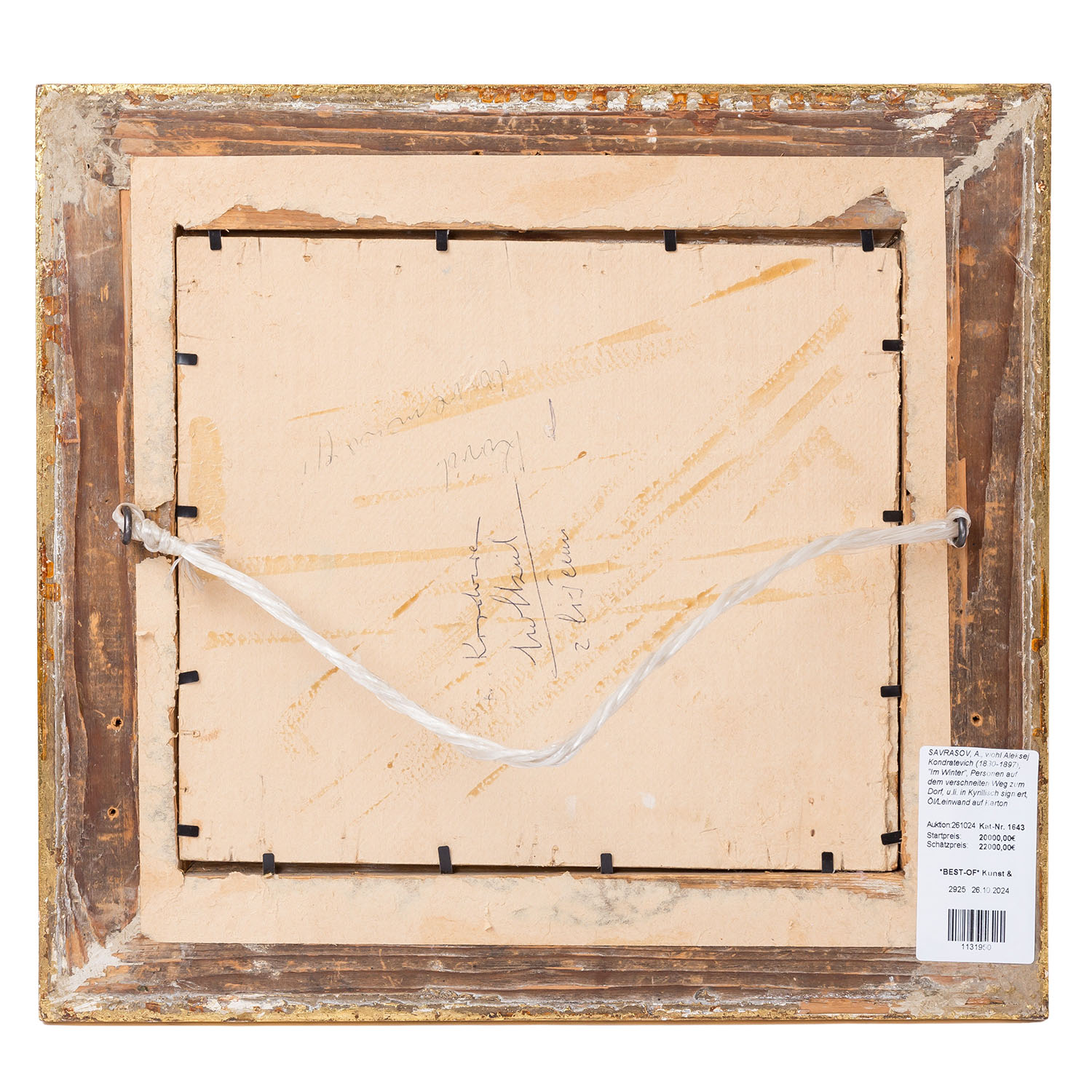 SAVRASOV, A., probably Aleksej Kondratevich (1830-1897), ‘Im Winter’, people on the snow-covered path to the village, signed in Cyrillic lower left, oil/canvas mounted on cardboard, HxW: approx. 23x27 cm (35x38 cm with frame). Signs of age and wear, restored and retouched, traces of colour from the frame on the outer edge. With frame (traces of age).