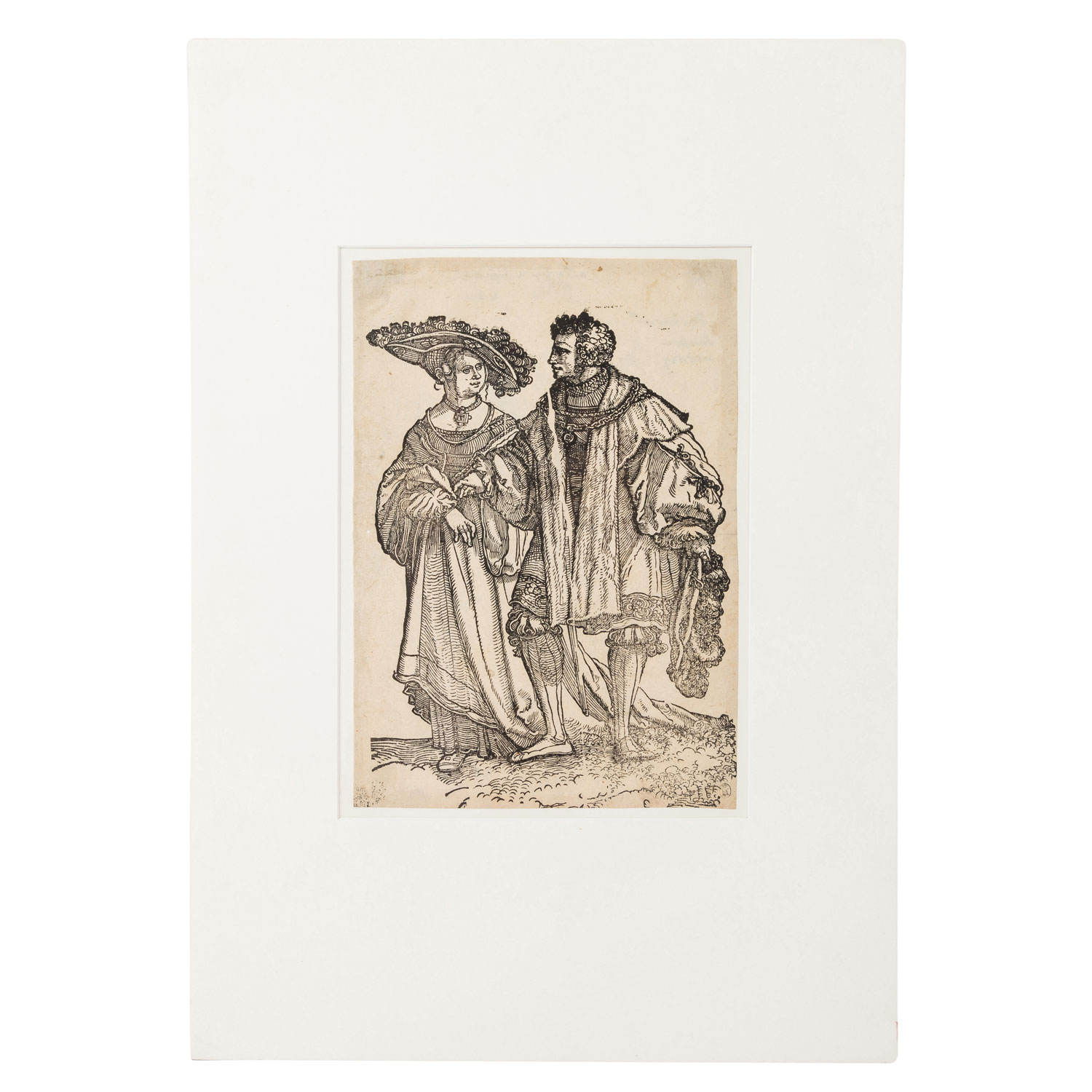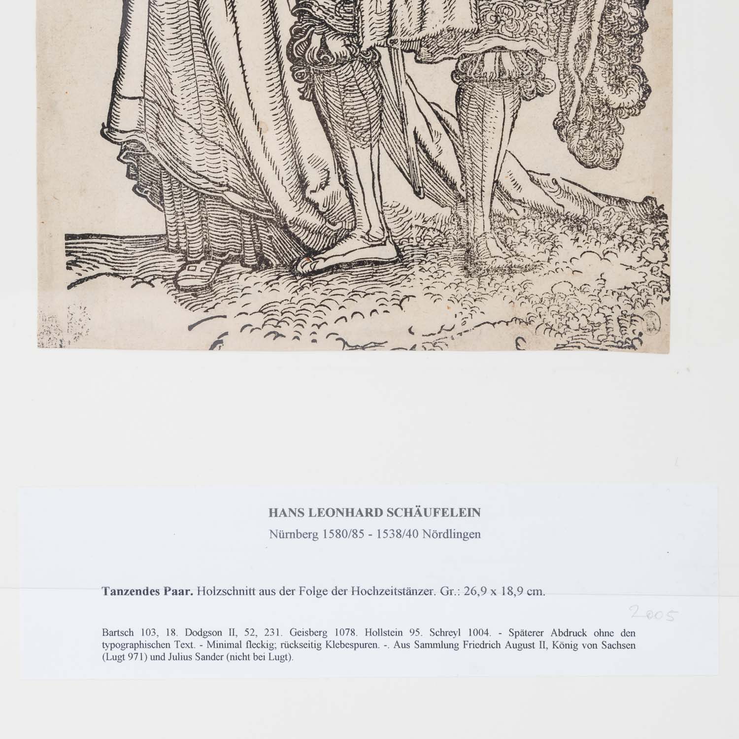 SCHÄUFELEIN, HANS LEONHARD (c. 1480- c. 1540), ‘Tanzendes Paar’, from the series ‘Der Hochzeitstänzer’, woodcut/ laid paper, remains of an indistinct collection stamp lower right, HxW: sheet c. 26.5x19 cm (outer dimensions passepartout c. 50x35 cm). Traces of age, browned, margins slightly trimmed; pencil annotations on the reverse of the sheet. Mounted in passepartout at upper corners, with description in passepartout.