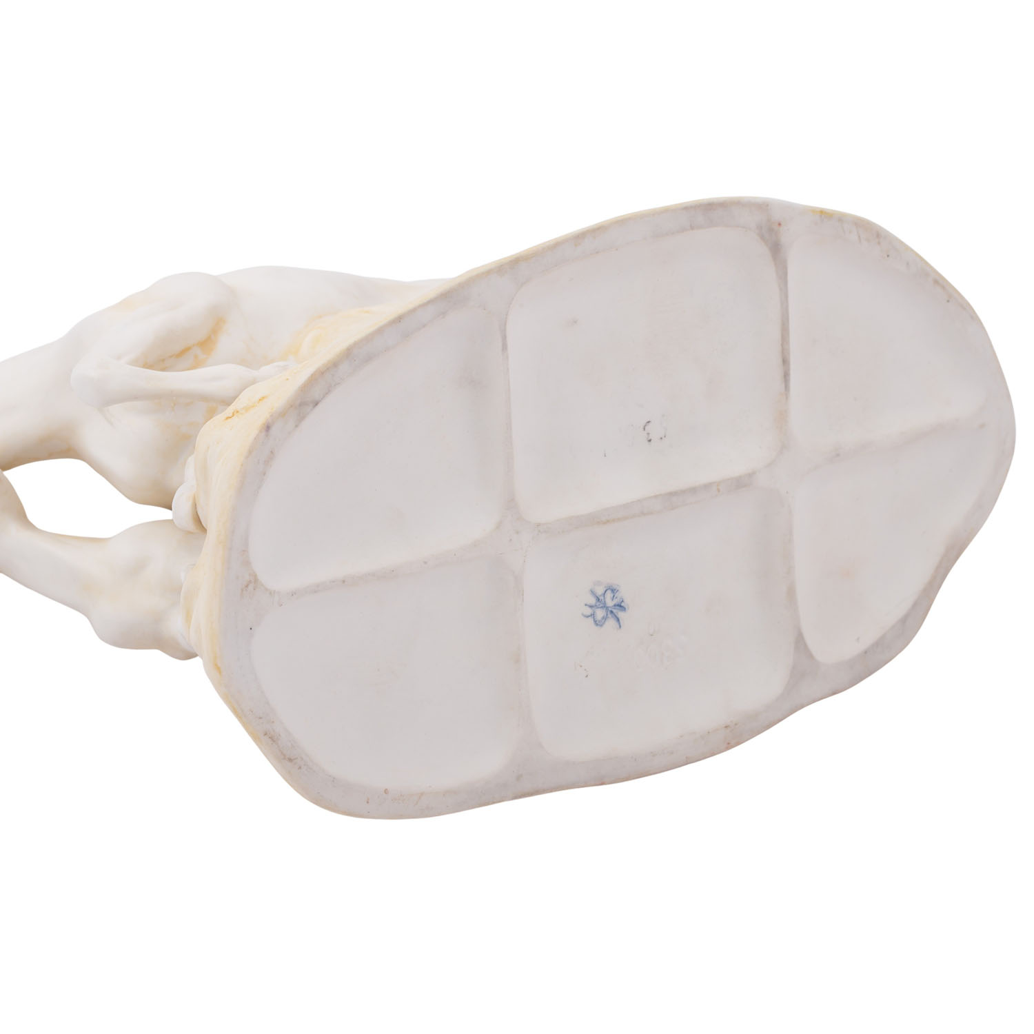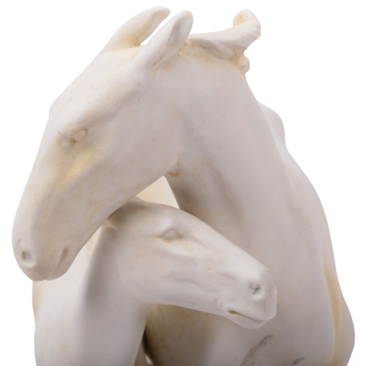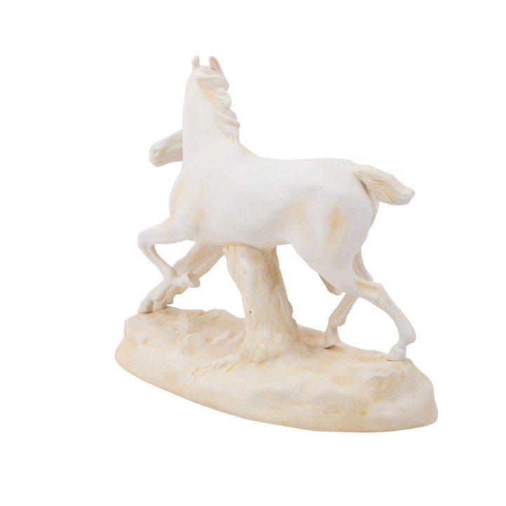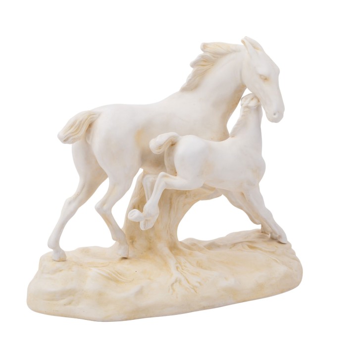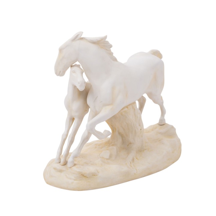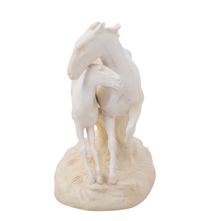 SCHEIBE “Horse Group”, 20th century. Biscuit porcelain, mare with foal on natural base, vividly depicted, blue mark and press number 5300 on the underside, height approx. 18 cm, length approx. 21.5 cm. Signs of age.