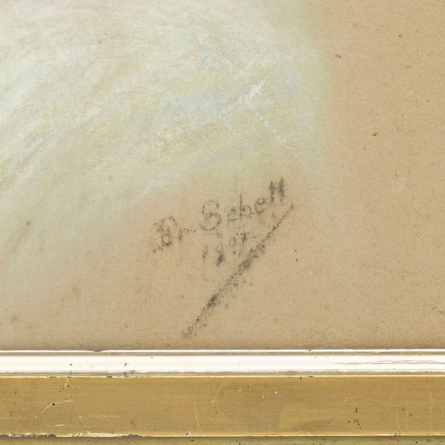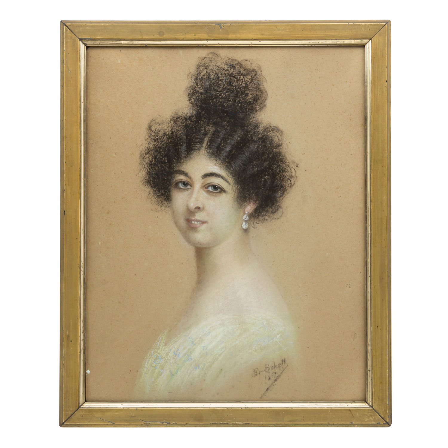 SCHELL, Fr. (artist of the 19th / 20th century), "The Australian Dancer Saharet", Portrait of a friend of the painter Friedrich August von Kaulbach, portrait of a young woman, turning from the profile to the viewer, signed and dated 1907, pastel / brown cardboard, HxW: ca. 58 x 46 cm (65 x 52 cm with frame). Slightly browned and blotchy. With glazed frame. Signs of age. NECK from 'Elegant World' vintage '1912' with image of the Saharet attached.