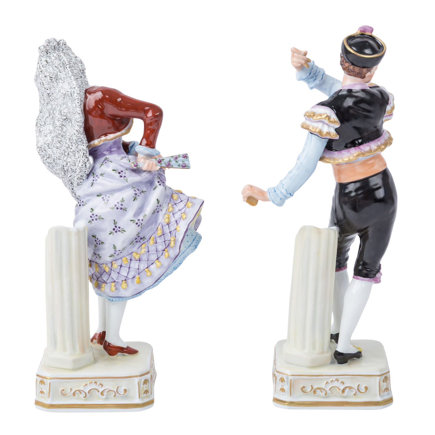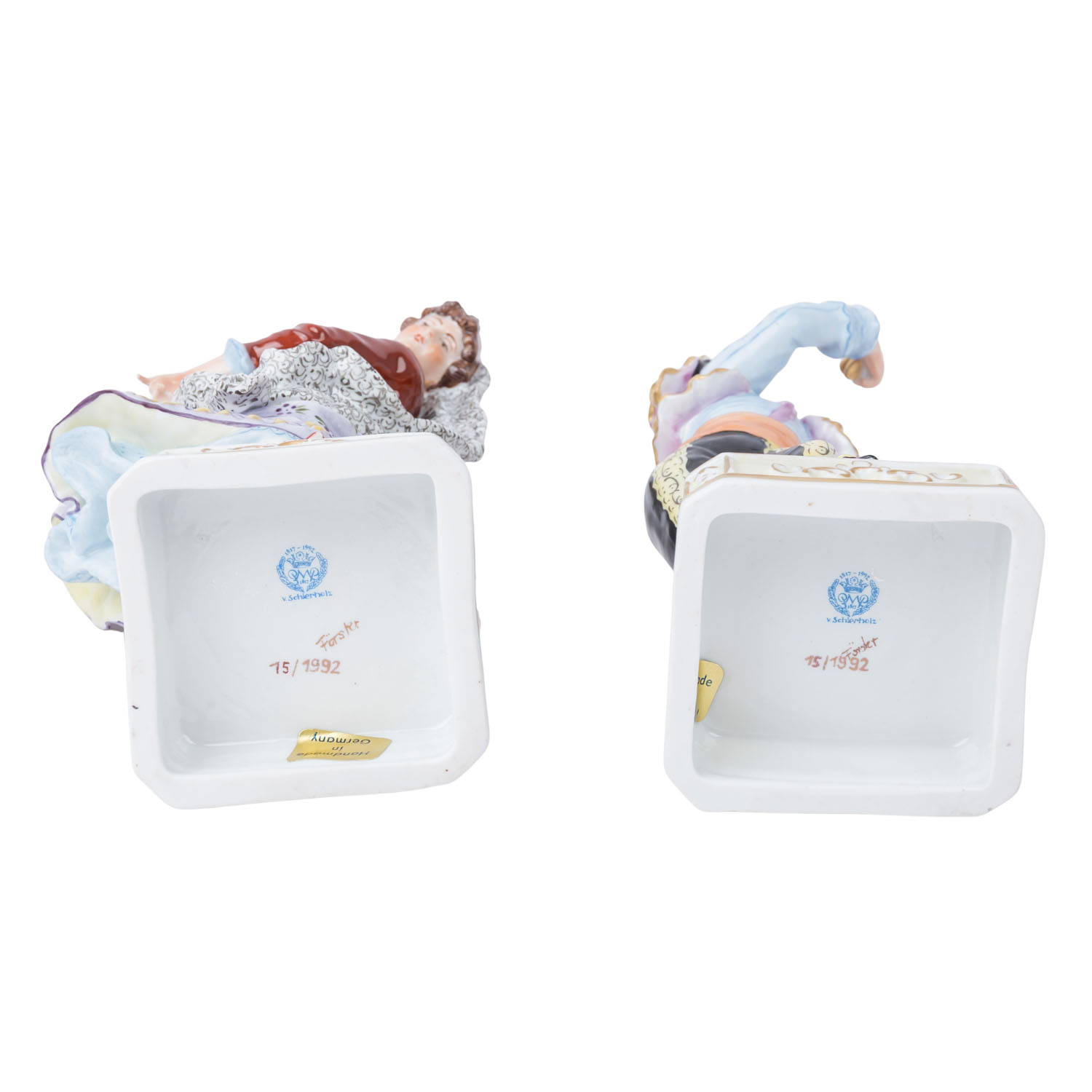 polychrome decoration, manufacturer's mark, marked and numbered, height: approx. 22 and 21 cm respectively. Signs of age and use.
